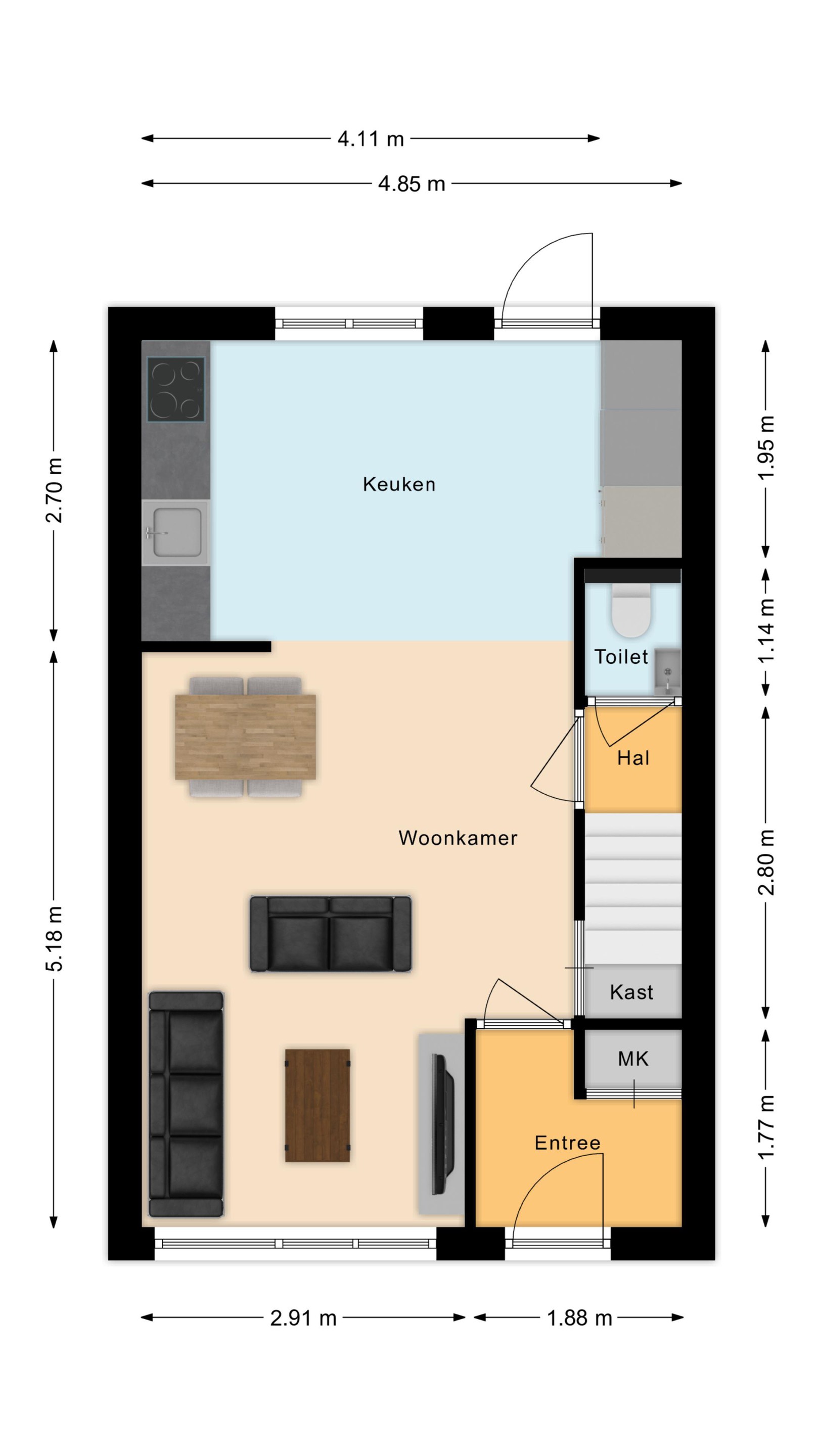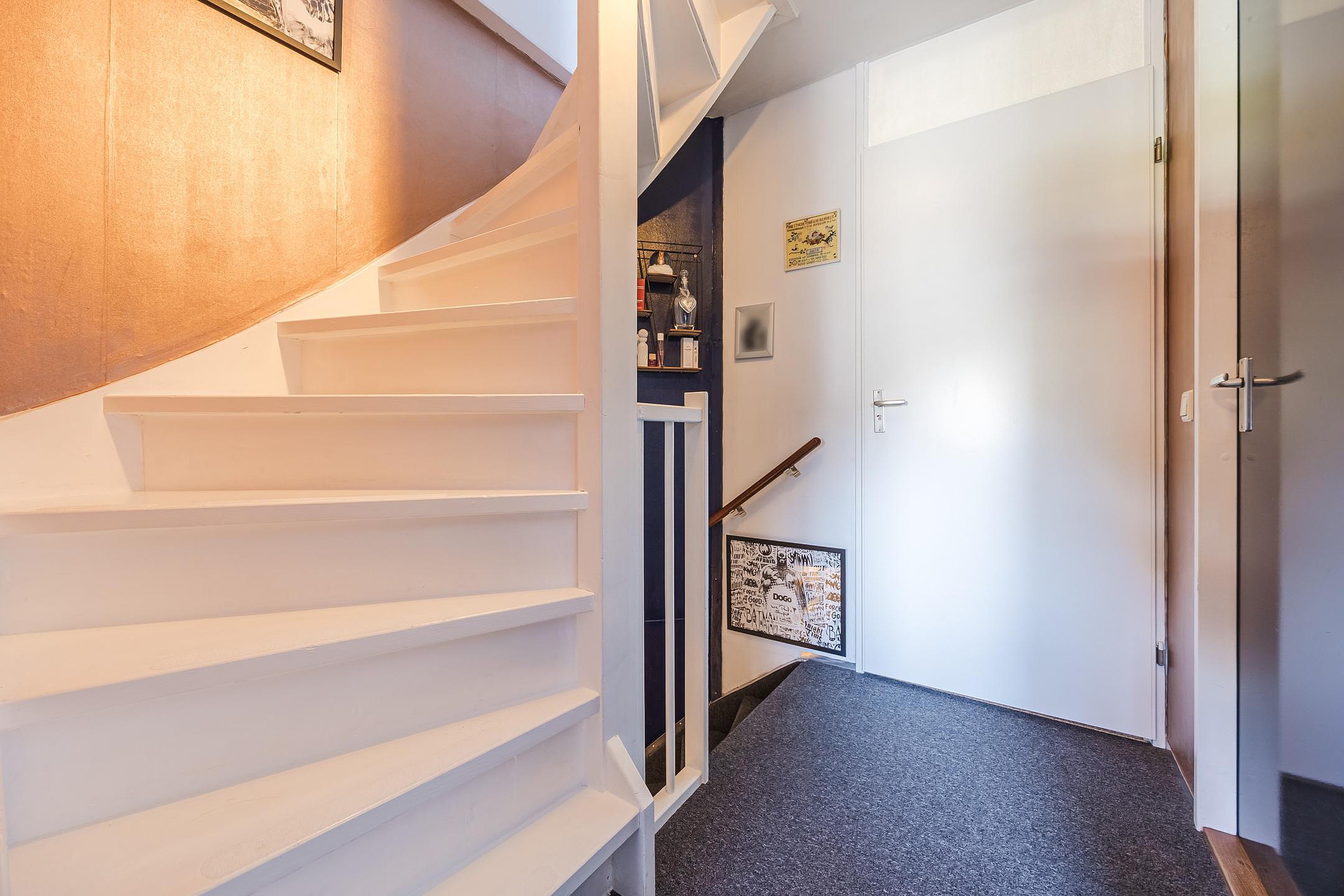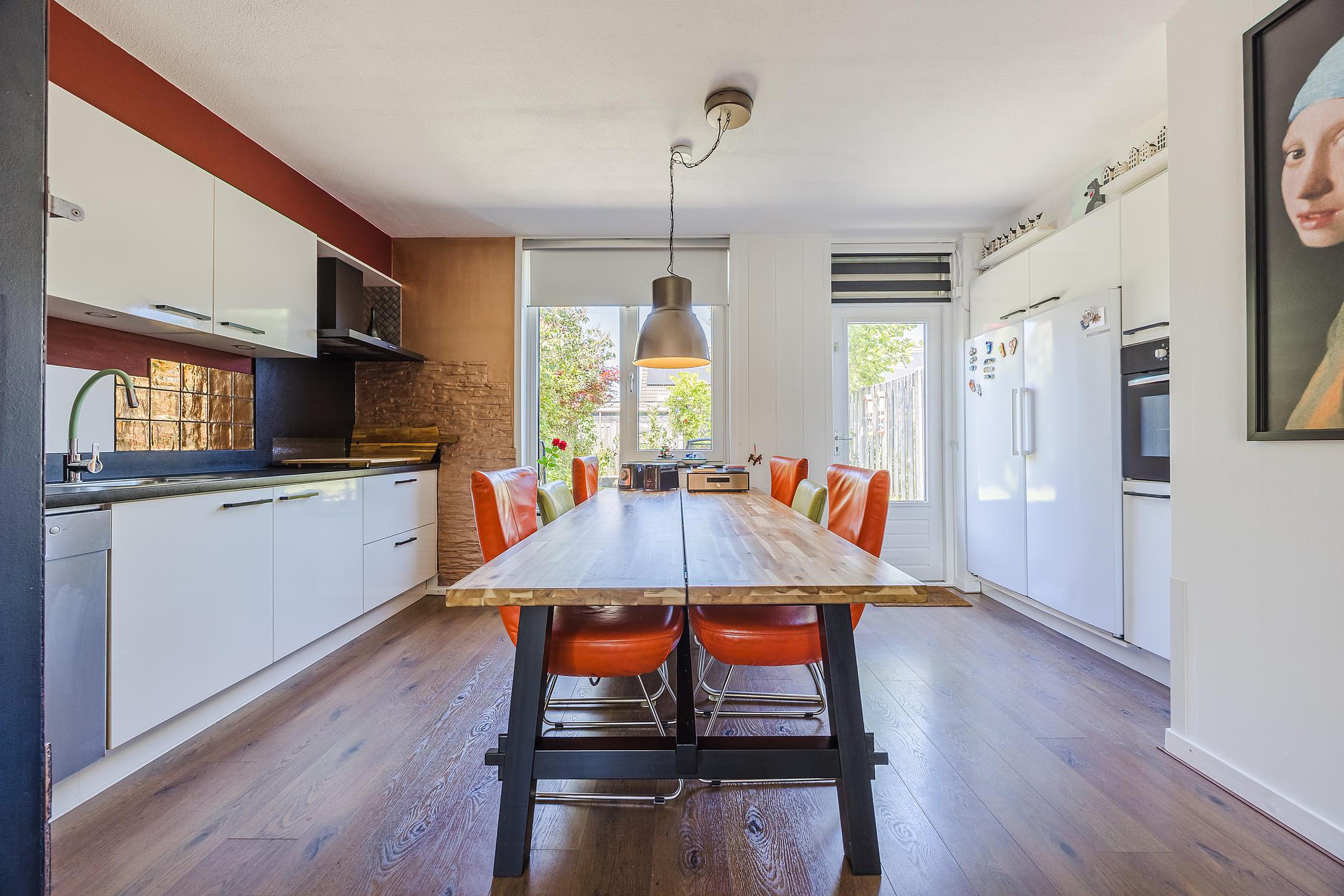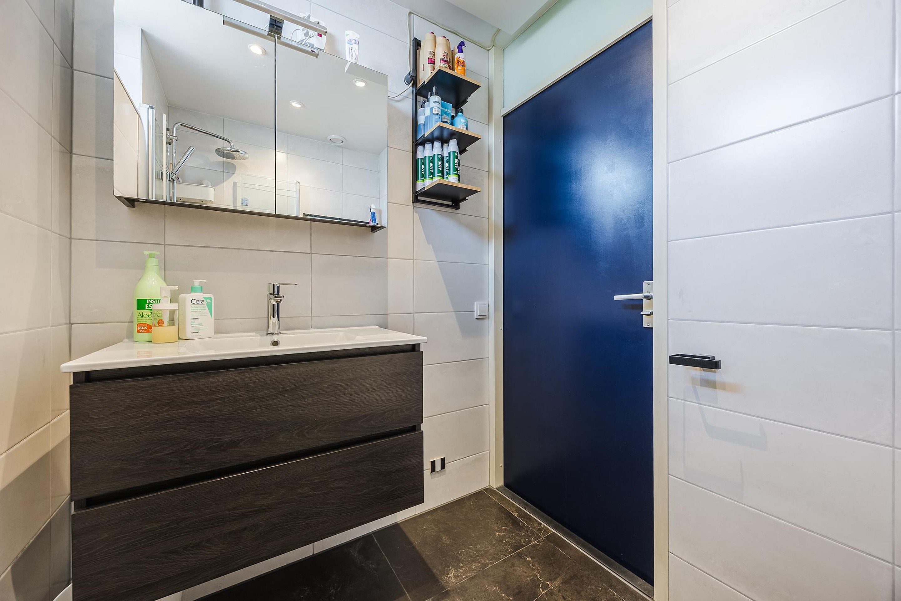 We lopen door naar de woonkamer, deze is licht en praktisch ingedeeld, voorzien van trapkast en airco voor zowel koelen als verwarmen. Achterin de woning vinden we de open keuken met inductie-kookplaat, oven, koel-vriescombinatie en vaatwasser, een goed ingerichte keuken dus. Aan de achterkant vinden we een deur welke toegang biedt tot de achtertuin, maar óók een deur welke toegang biedt tot een kleine hal met trapopgang én het toilet. Het toilet is modern afgewerkt, aan het sanitair hoef je niets meer te doen!