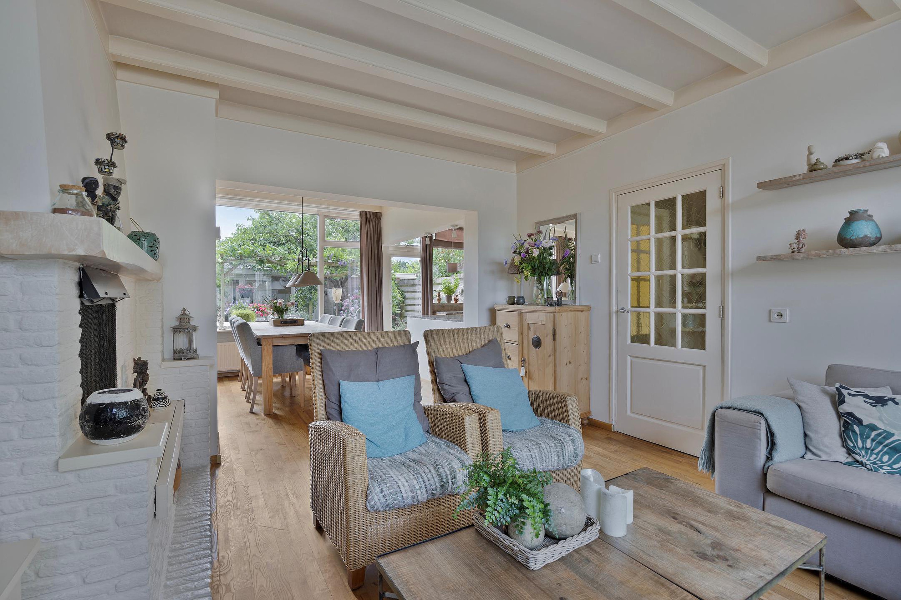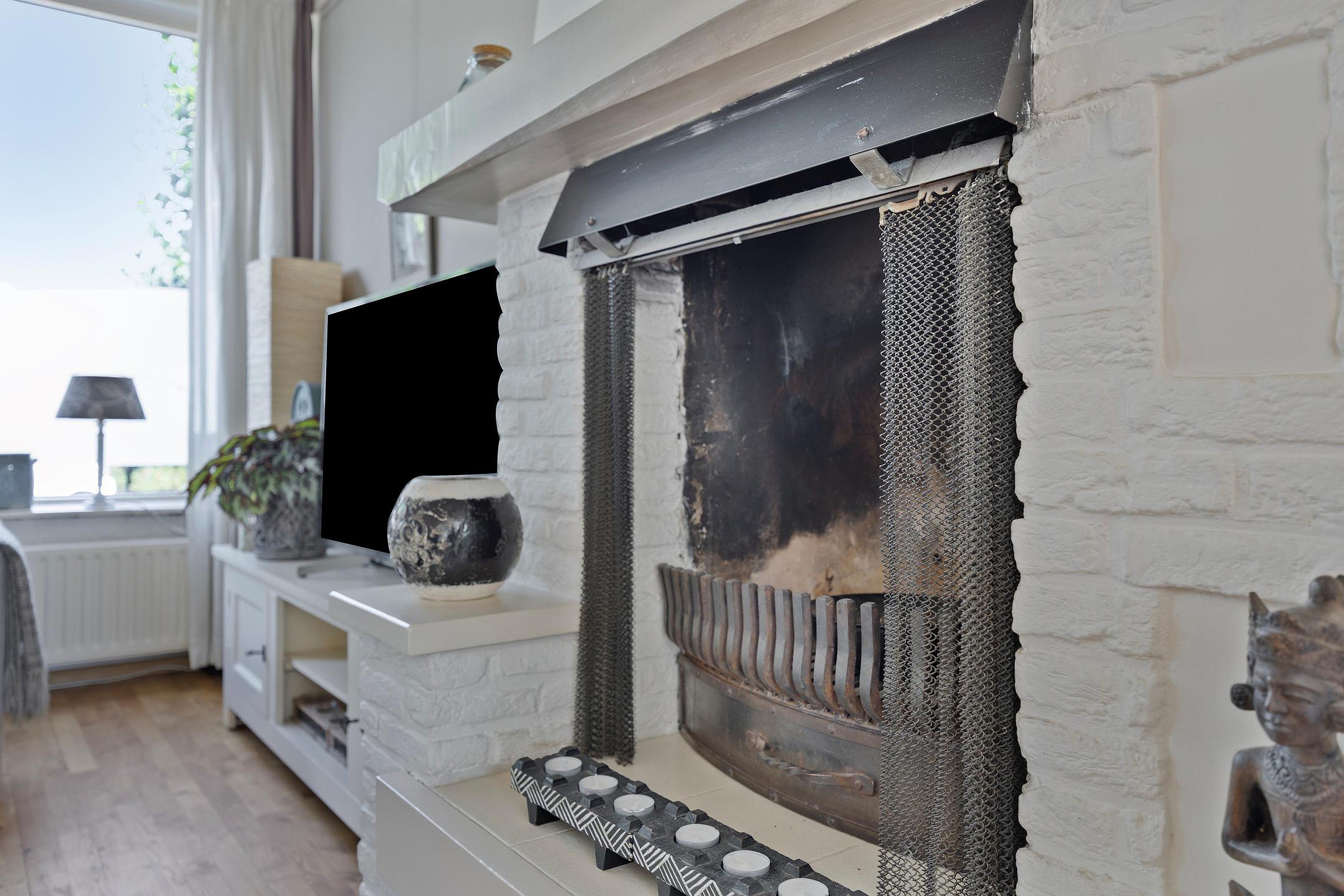 Sfeervolle doorzonwoonkamer waar het daglicht lekker kan binnen schijnen wat de kamer extra prettig doet aanvoelen. De kamer laat zich makkelijk indelen met een royale zithoek bij de openhaard en een zithoek grenzend aan de keuken. De ruim opgezette haardpartij zorgt niet alleen voor warmte, maar ook voor wat extra opbergruimte. Het balken plafond maakt het sfeertje helemaal compleet.