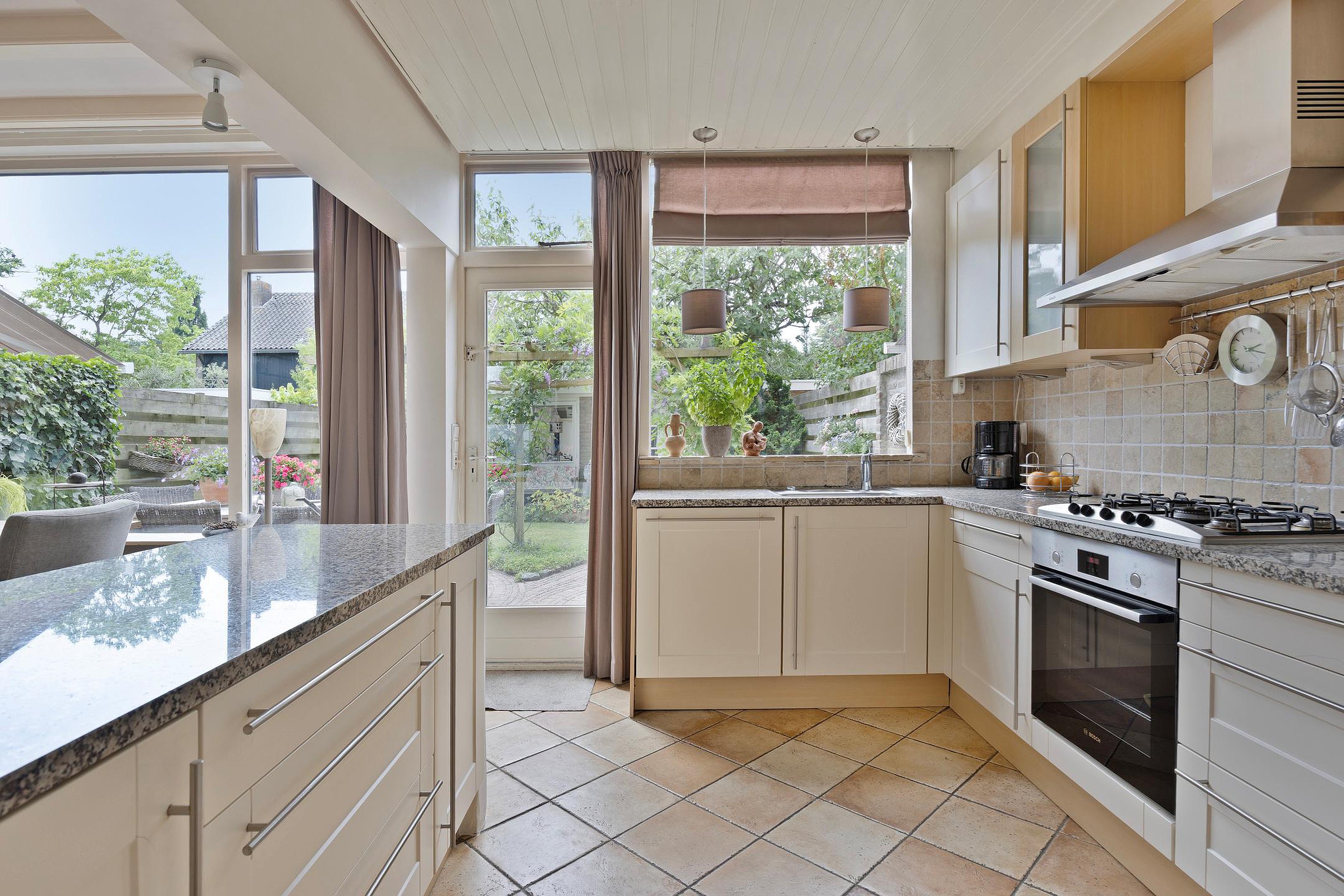 Open keuken met schiereiland die toegang geeft tot de tuin. De L-vormige opgestelde keuken heeft voldoende bergruimte. Het granieten aanrecht biedt veel werkruimte om de heerlijkste gerechten te bereiden. Vanuit de keuken is er eveneens een mooi zicht op de tuin. Zo kun je de kinderen in de gaten houden terwijl jij staat te koken. Via de keuken is er ook toegang tot de trapkast waar de extra boodschappen voorraad kan worden bewaard.