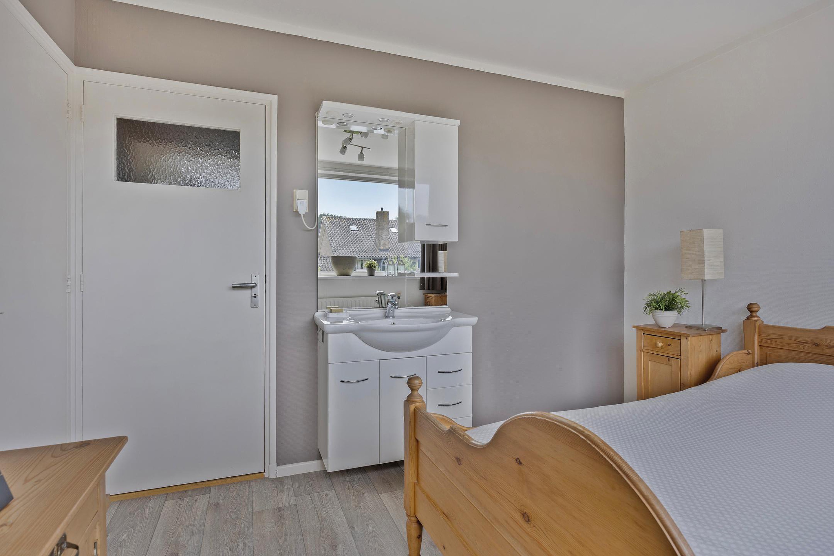 Eveneens een ruime slaapkamer met een vaste kast voor een groot deel van de kleding. Een tweepersoonsbed past er met gemak in. Extra handig is het aanwezige badkamermeubel. De kamer is aan de achterzijde gelegen en geeft een mooi uitzicht over de achtertuin.