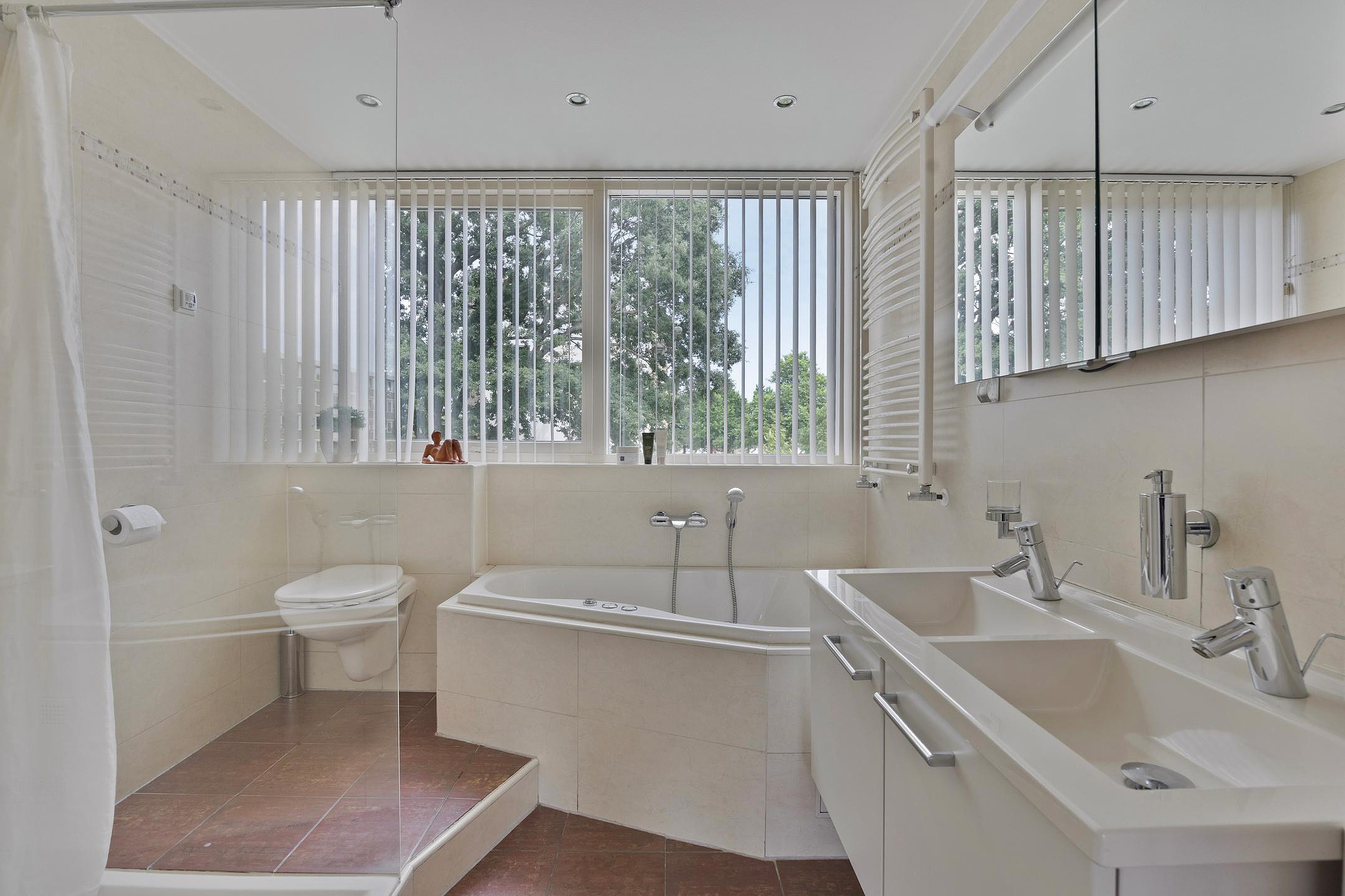 De ruime badkamer is aan de voorzijde van de woning gelegen en van alle gemakken voorzien. Door het flinke raampartij kan het daglicht goed binnenvallen wat de ruimte nog fijner doet aanvoelen. Een fijne plek om je even op te frissen. De badkamer is in warme natuurtinten afgewerkt en voorzien van:
