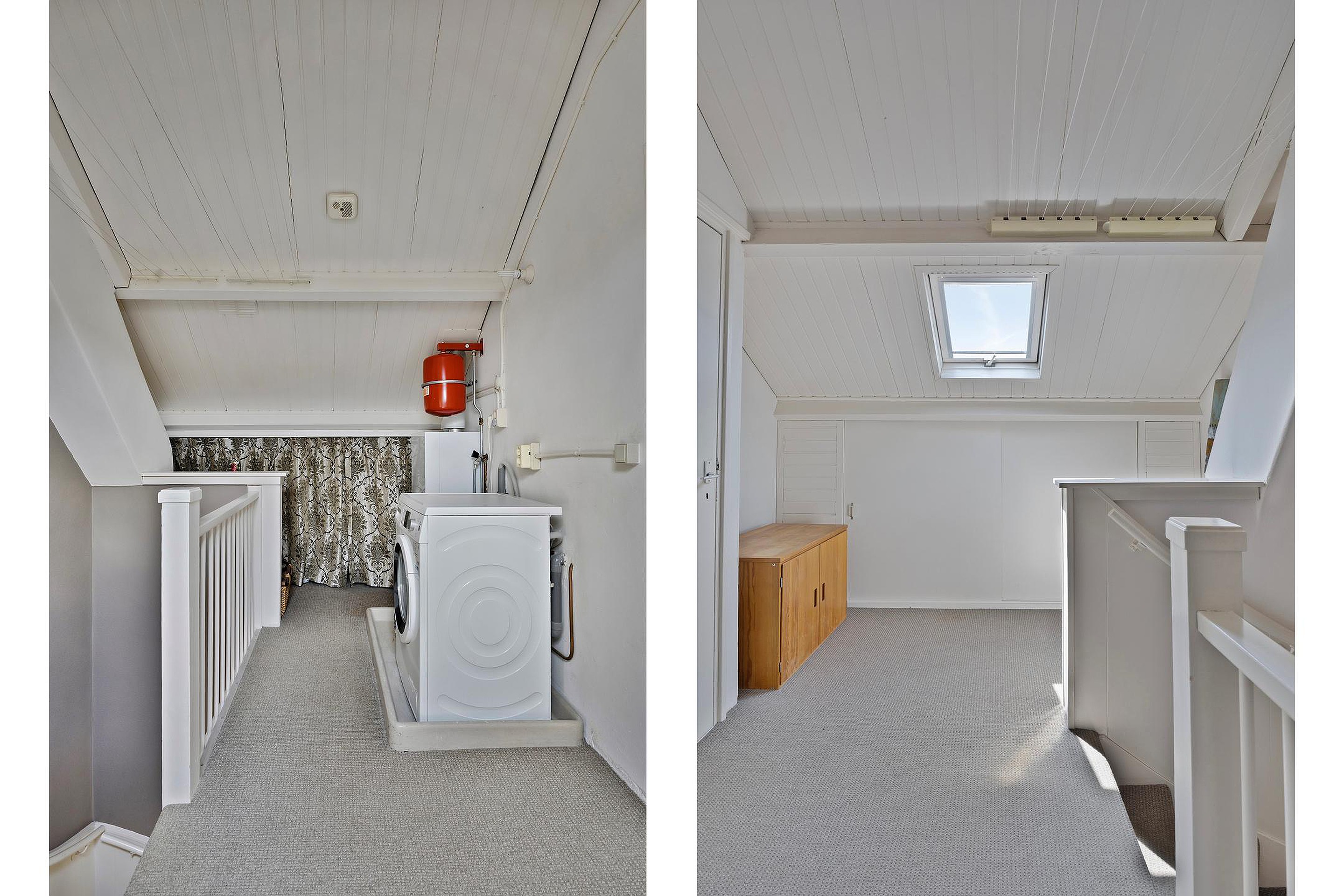Via een vaste trap komen we uit op de tweede-/zolderverdieping. Via het dakraam wordt de overloop en trapopgang voorzien van daglicht. Op de overloop treffen we de combiketel en wasmachine-aansluiting. Achter het knieschot is er opbergruimte voor de kerstversiering en vakantiekoffers.
