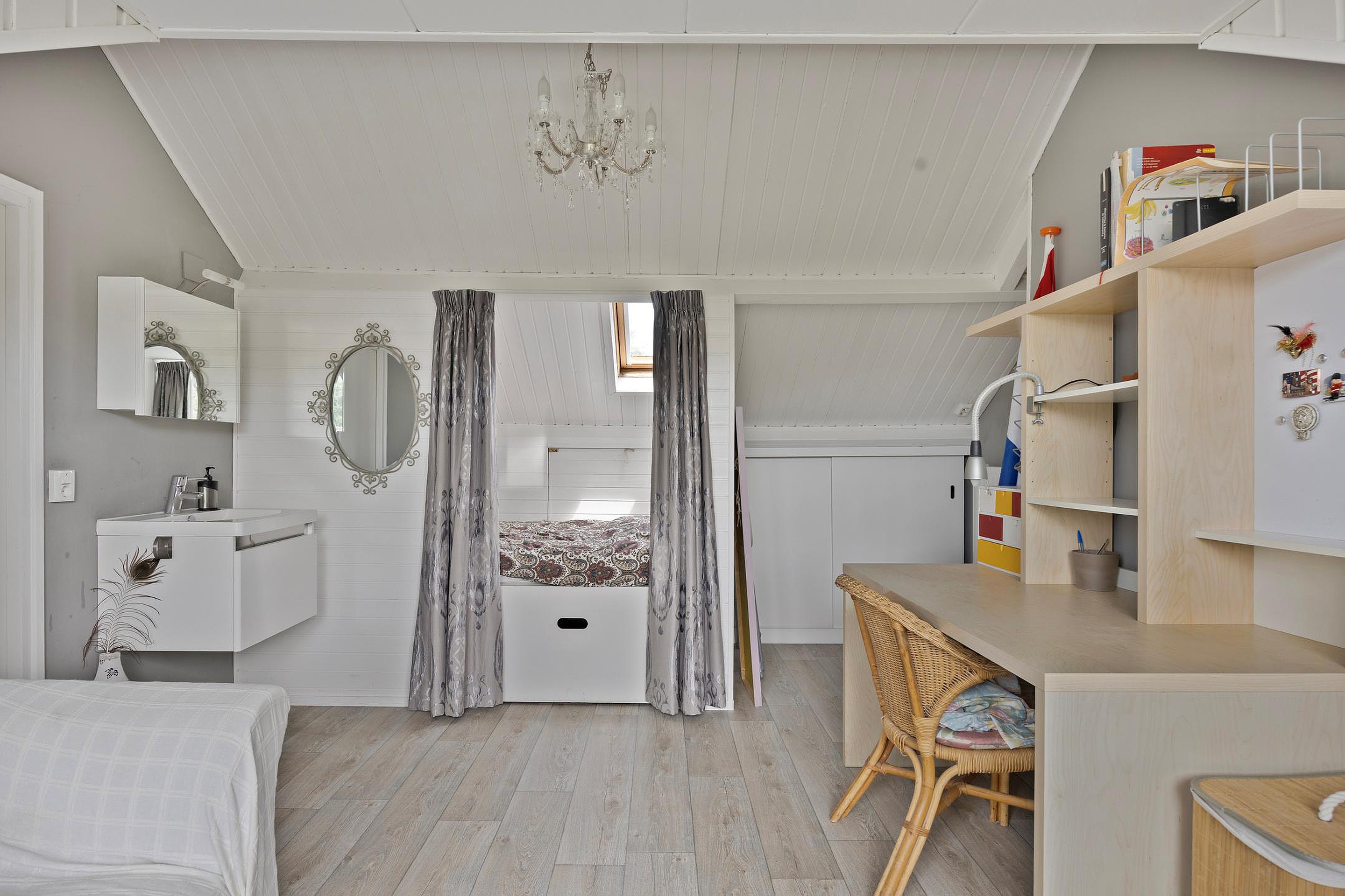 Gezellige slaapkamer met bedstee. Door de aanwezige dakkapel is de kamer extra groot van formaat en maakt de kamer extra fijn. Een perfecte kinder-/tienerkamer met eigen badkamermeubel. Extra berging treffen we achter de knieschotten.