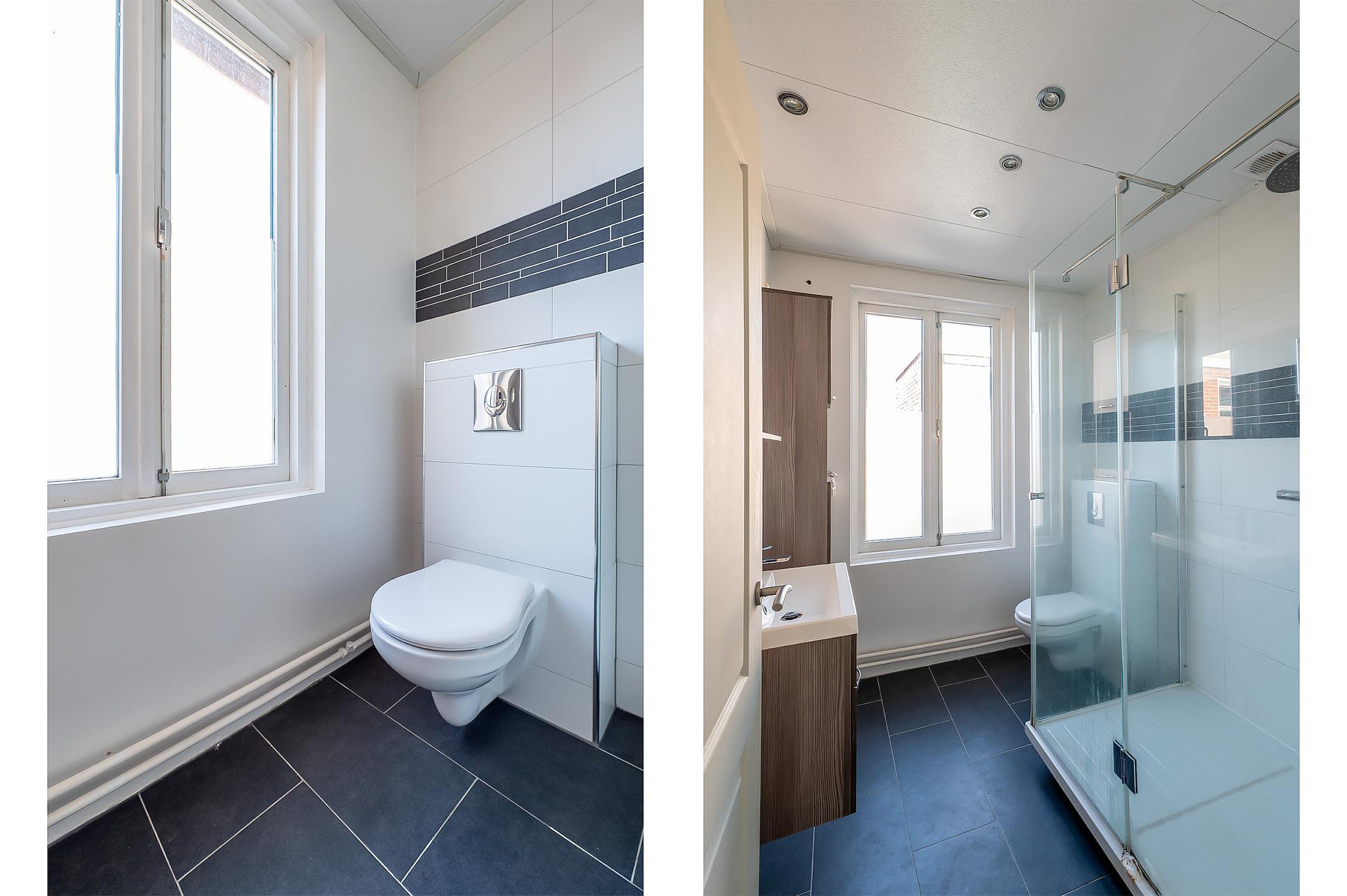 De badkamer is compleet en verzorgd, voorzien van een douche, wastafel en hangend toilet.
