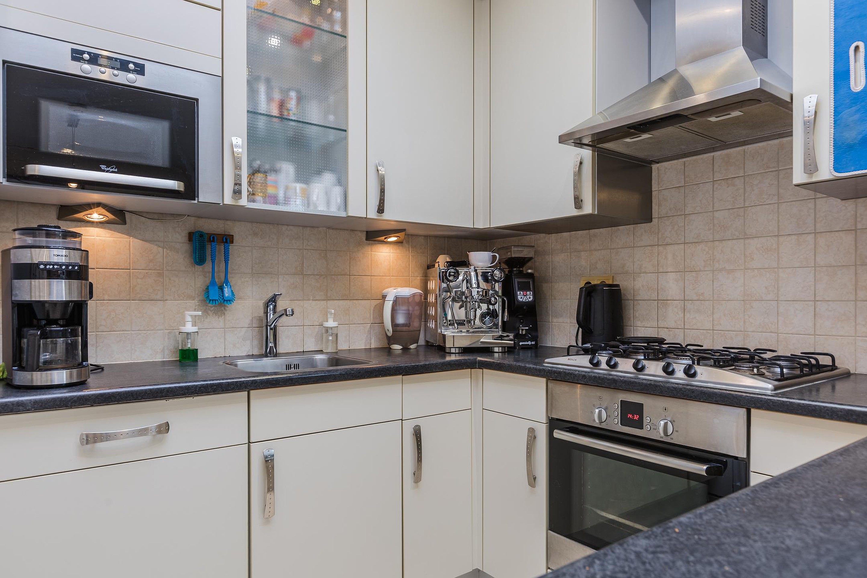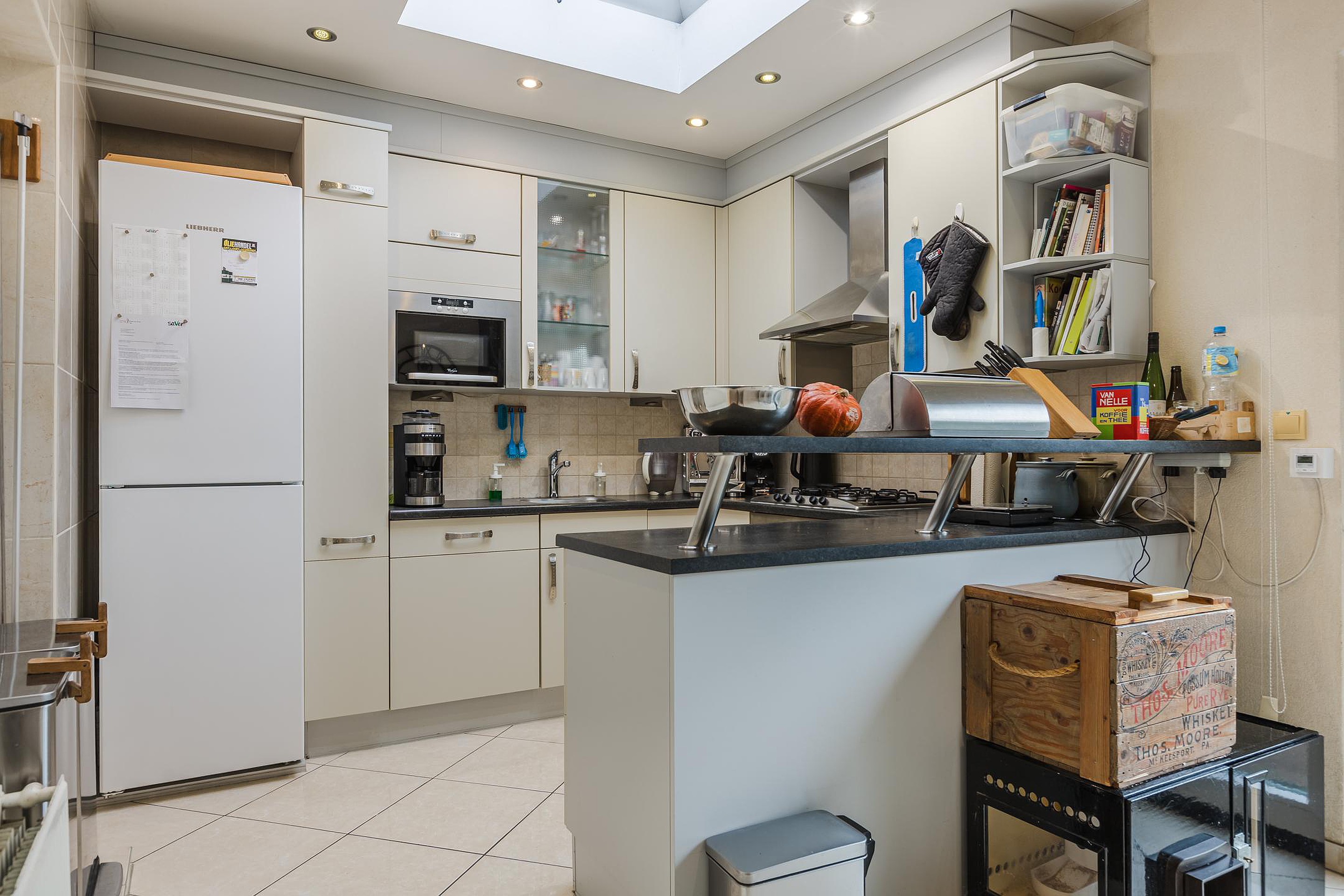 De woonkamer is licht en ruim opgezet en vormt een fijne plek voor zowel een gezellige zithoek als een royale eettafel. Aan de achterzijde is de woning uitgebouwd, waardoor een halfopen keuken is ontstaan die veel meer ruimte biedt dan gebruikelijk in dit type woning. De keuken is ingericht met diverse inbouwapparatuur en heeft een lichtkoepel en schuifpui naar de tuin. De begane grond is voorzien van vloerverwarming, wat zorgt voor een comfortabel woonklimaat.