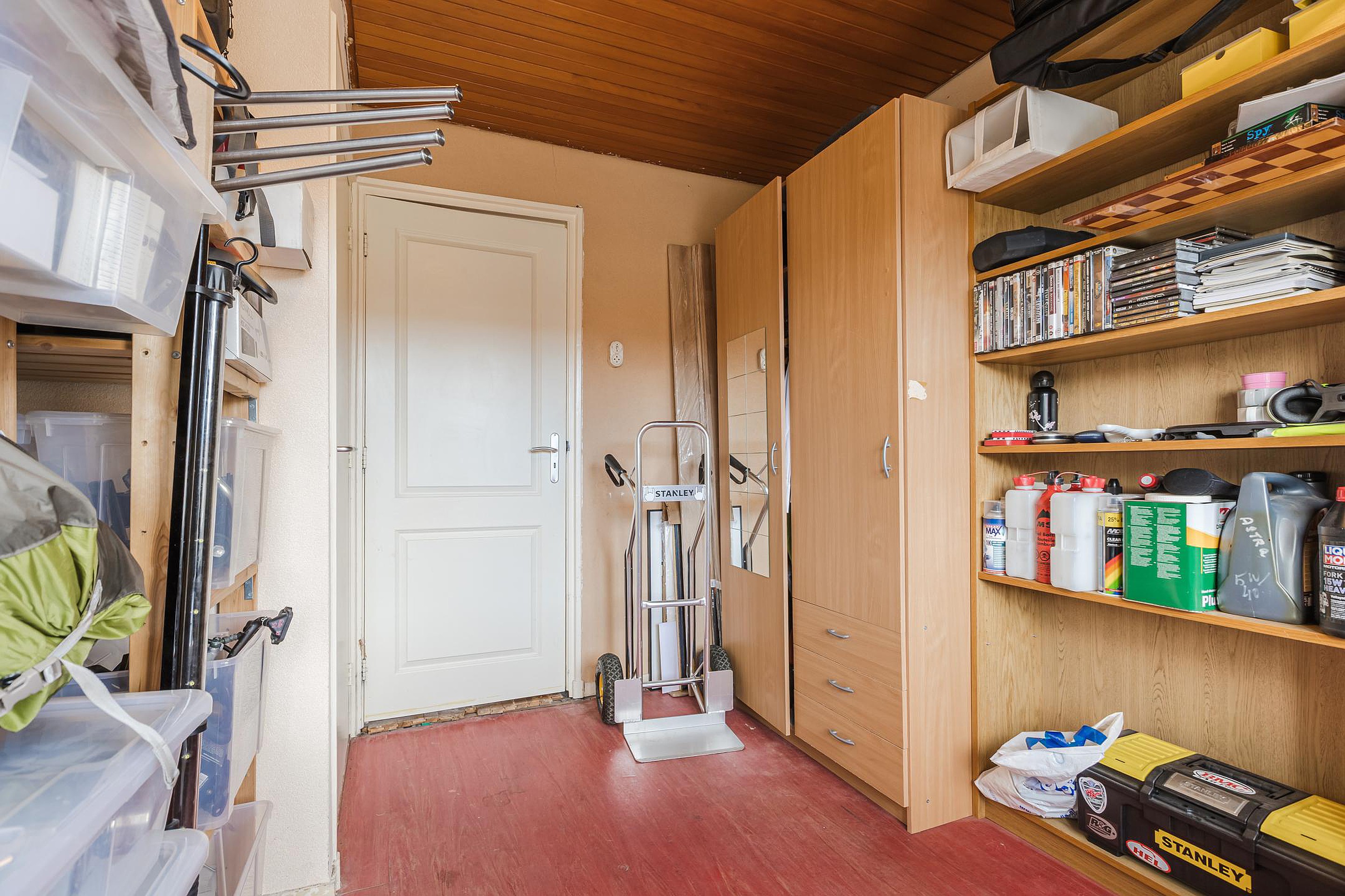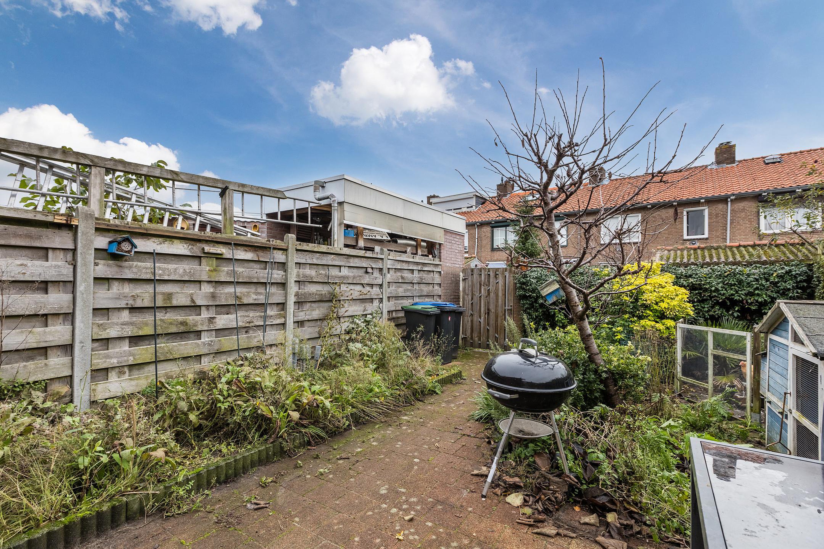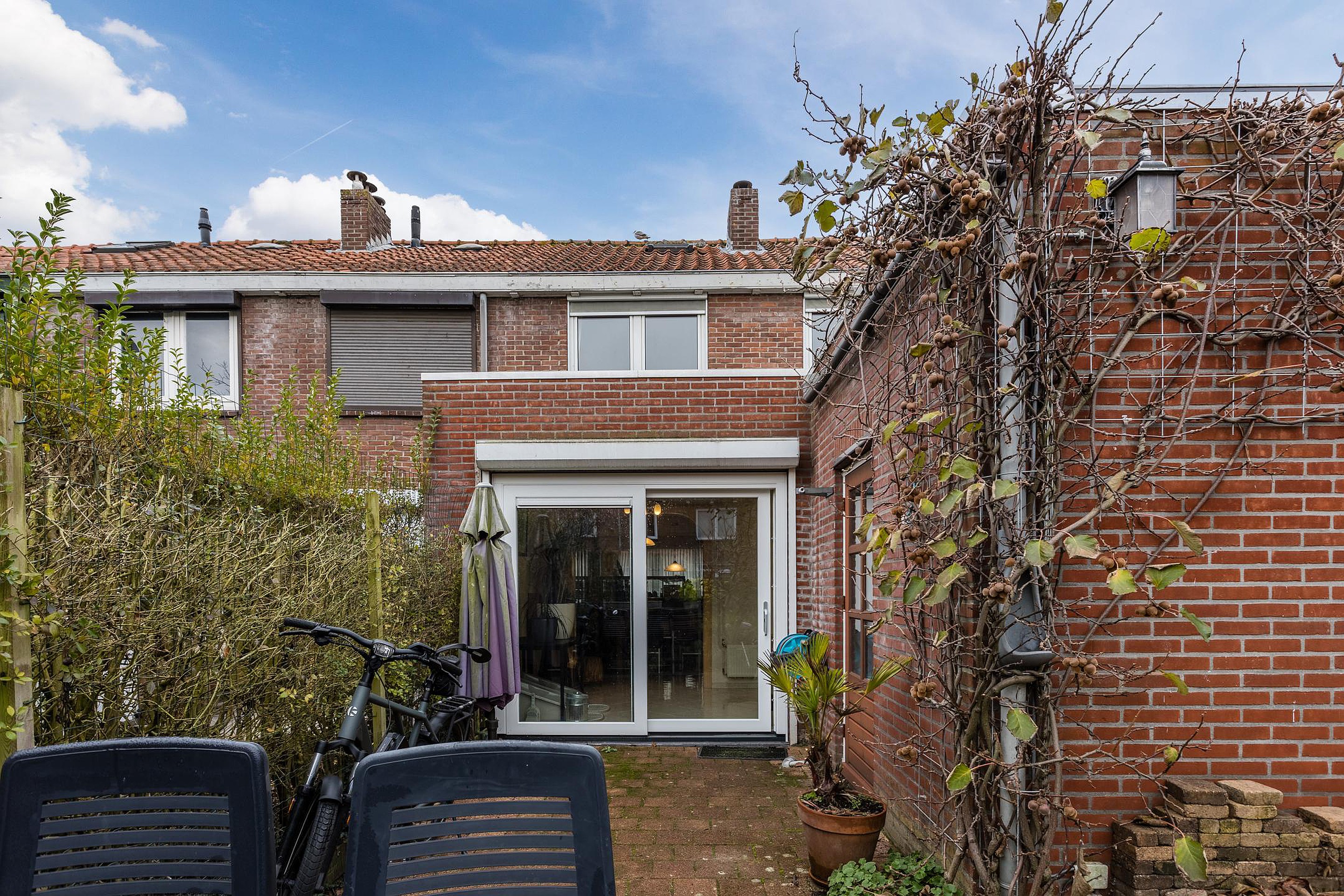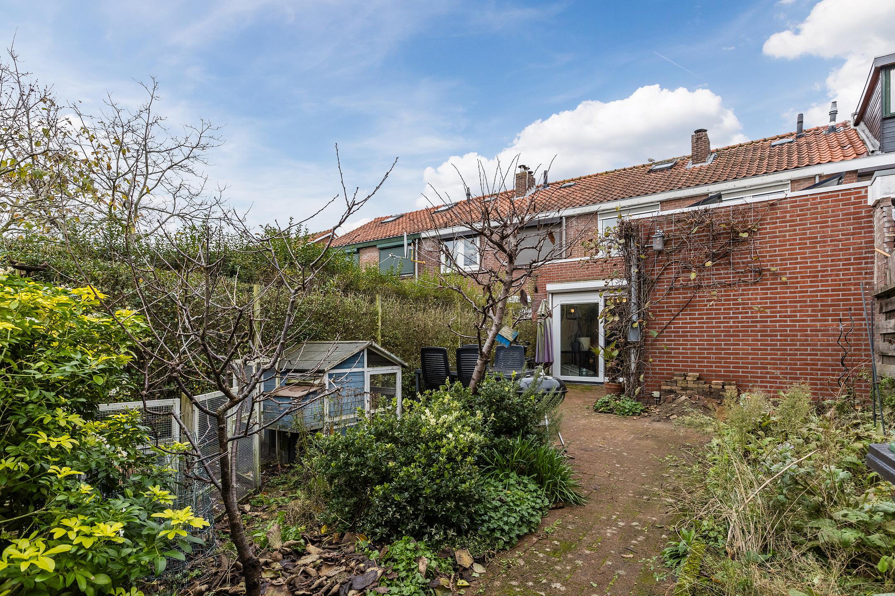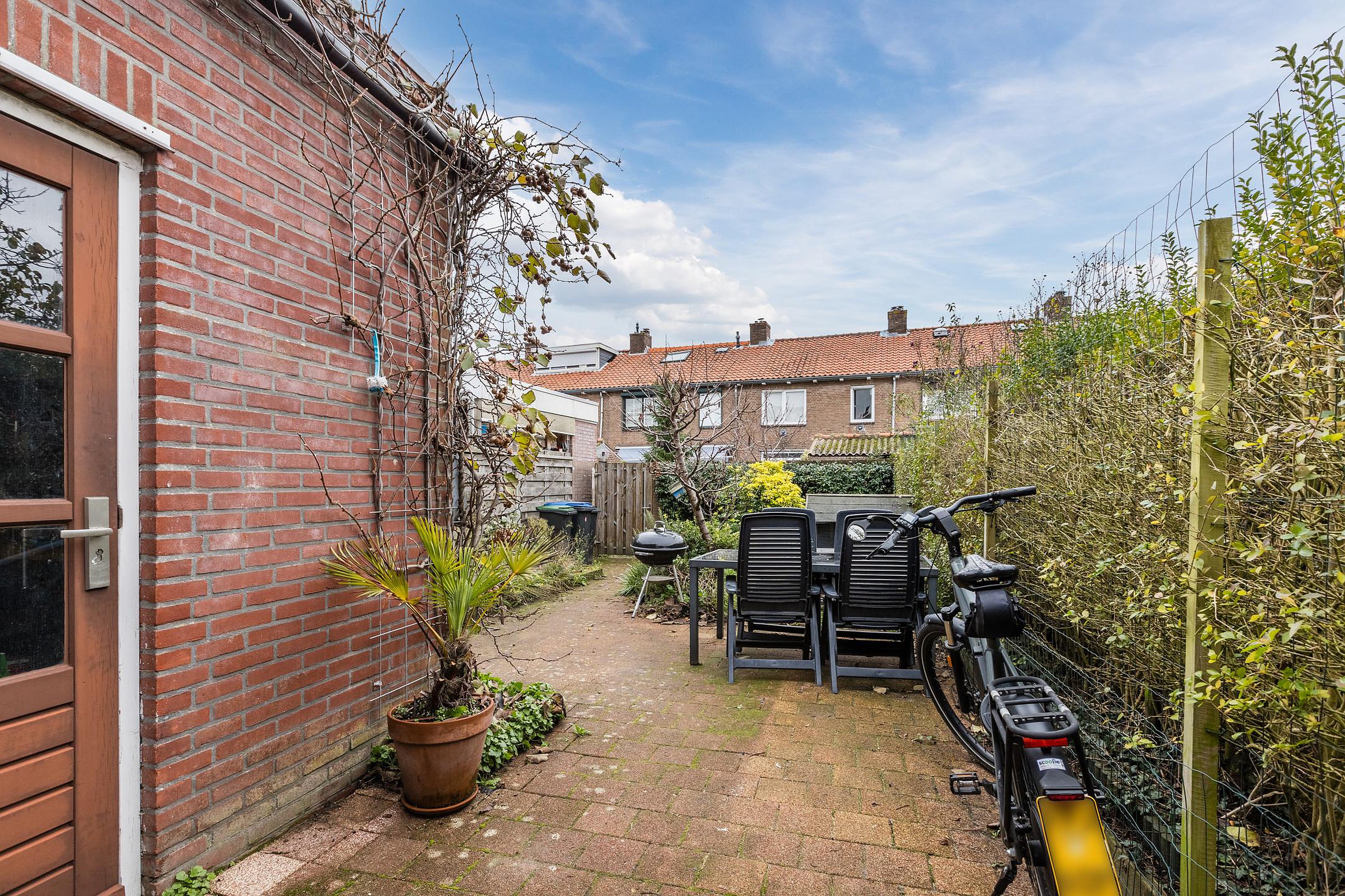De achtertuin is verzorgd, ligt prettig op de zon en heeft een achterom. Daarnaast is er een aangebouwde stenen schuur met elektra, ideaal voor fietsen, opslag of hobby’s.