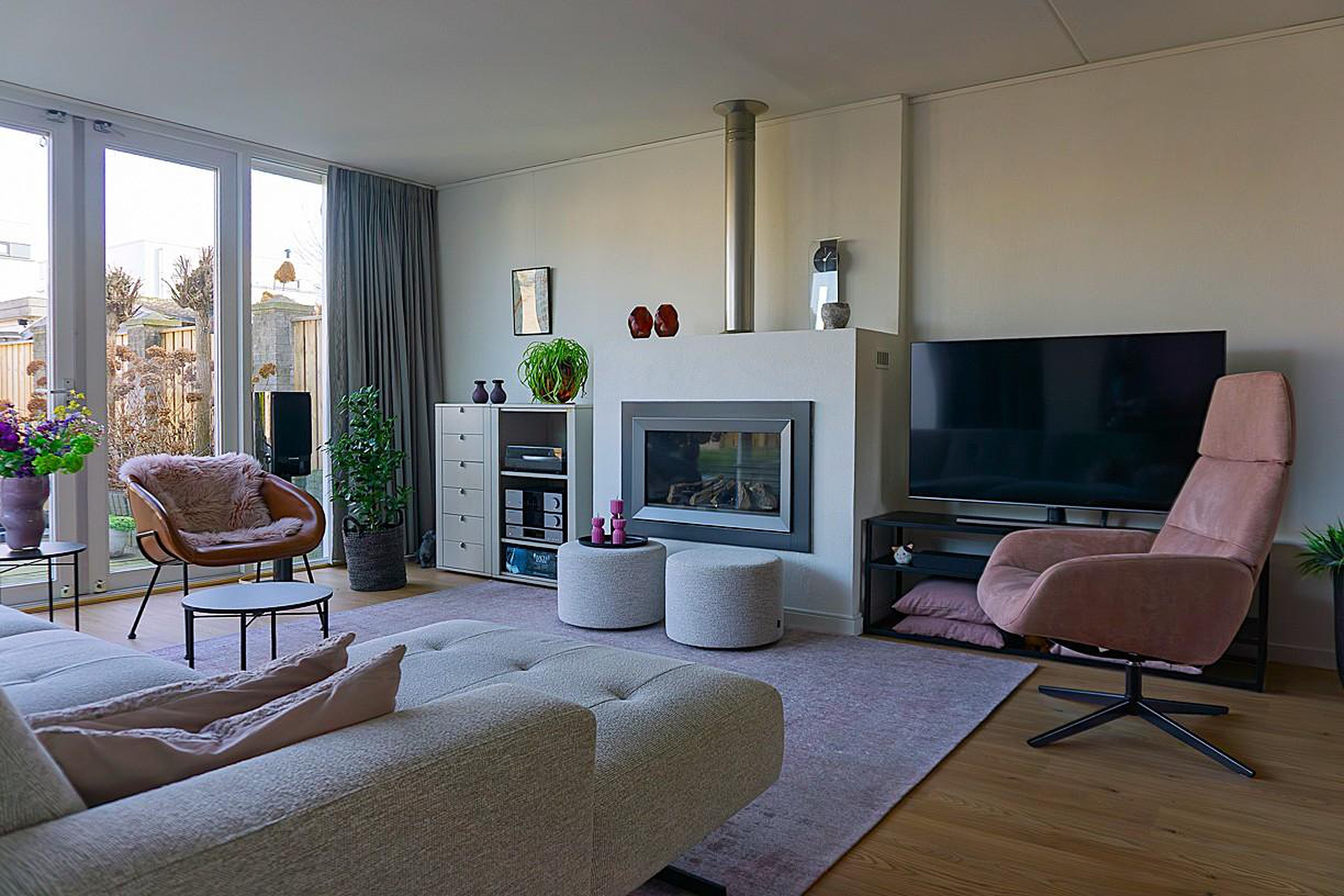 De woonkamer is in 2001 aan de achterzijde uitgebouwd. Door de vele raampartijen kent de woonkamer veel lichtinval. De tuindeuren maken hierbij de verbinding met de nette achtertuin. De uitbouw heeft gezorgd voor een ruime, gezellige woonkamer mede door de aanwezige schouw met gashaard. De woonkamer staat in open verbinding met de keuken. Op de scheiding van de keuken en de woonkamer is een ruime vaste bergkast (onder de trap) aanwezig. De woonkamer is afgewerkt met gespoten wanden en plafond. Op de vloer van de woonkamer ligt een nette, vernieuwde (2024) laminaatvloer.