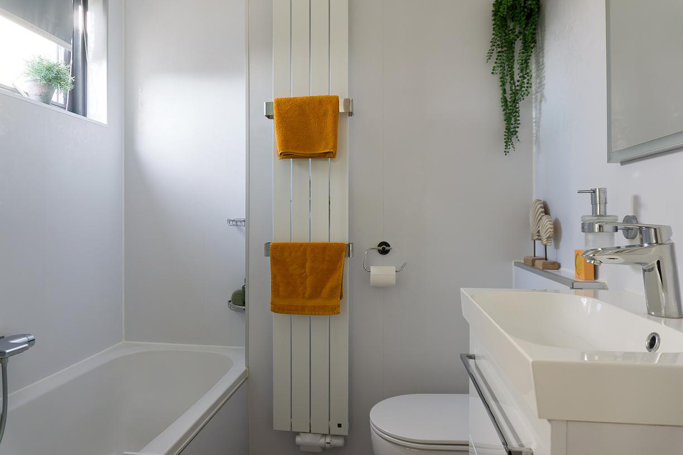Deze is aan de voorzijde van de woning gelegen en in 2020 vernieuwd. De met een designradiator verwarmde badkamer is uitgerust met een ligbad, een hangtoilet (Sanibroyeur) en een badmeubel met ingebouwde wastafel en spiegel. De wanden zijn afgewerkt met plaatmateriaal, de vloer is betegeld en het plafond is afgewerkt met spuitwerk.