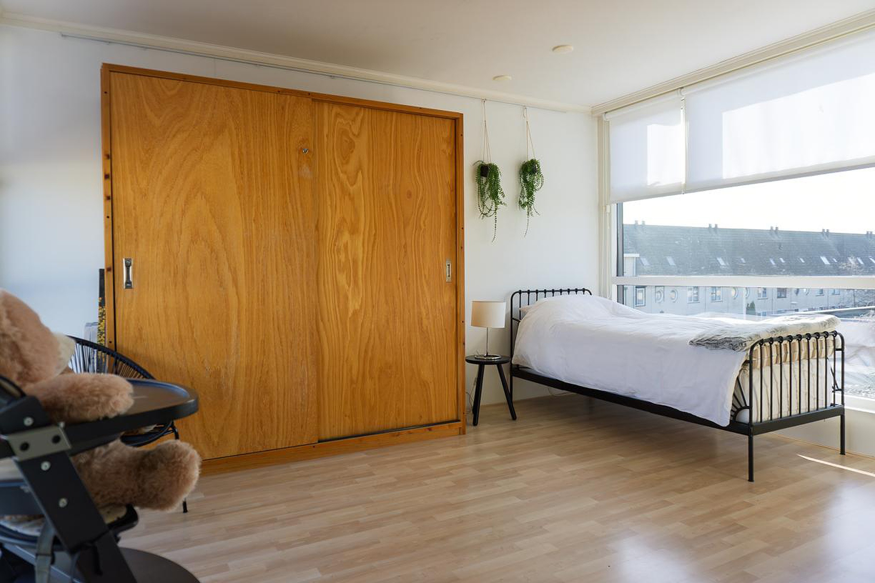 Deze ruime kamer is gelegen onder het dak. Omdat zowel aan de voorzijde als aan de achterzijde een groot raam aanwezig is, is er veel licht in deze slaapkamer. De wanden en het plafond zijn afgewerkt met stucwerk en op de vloer ligt laminaat.
