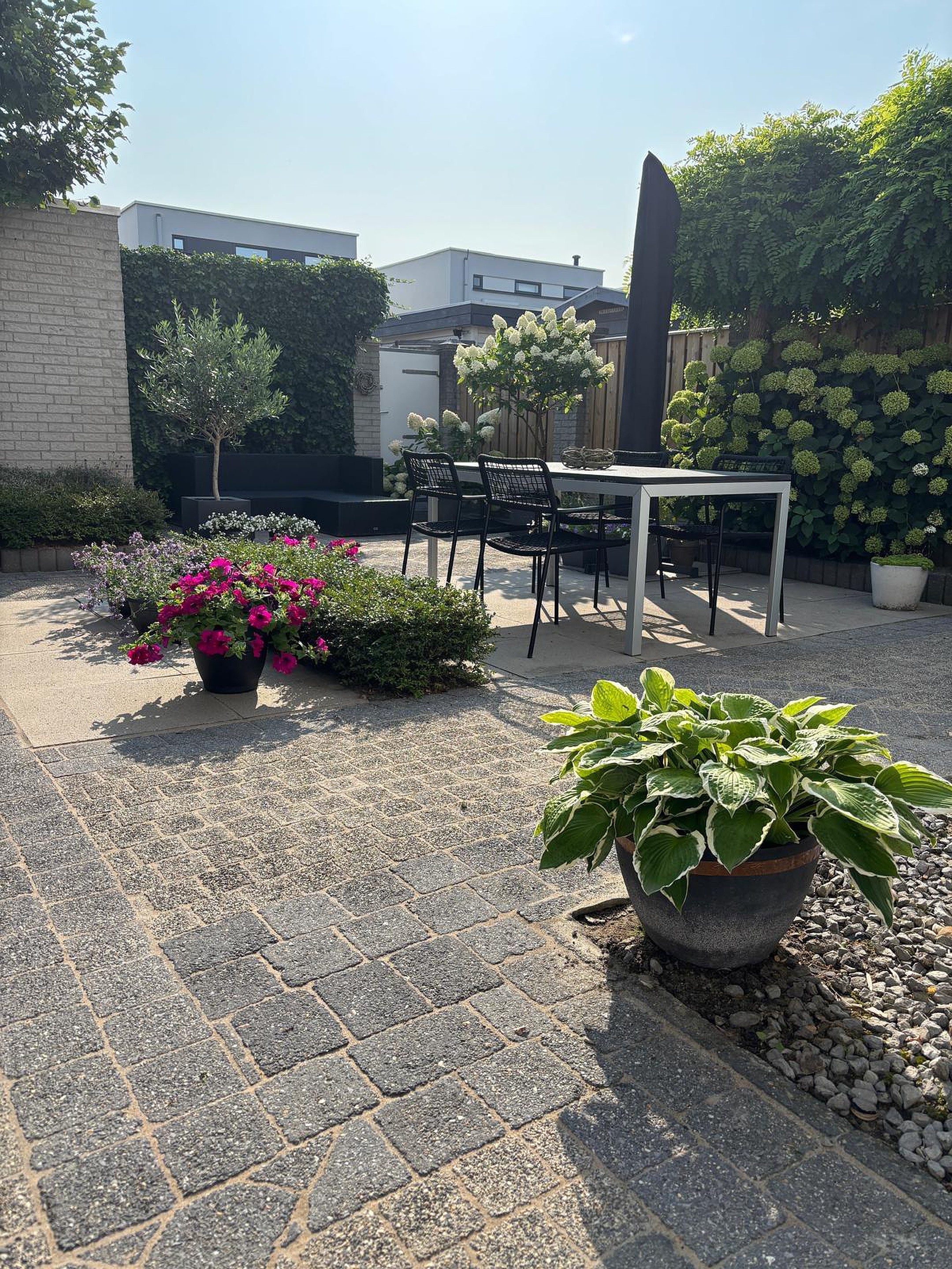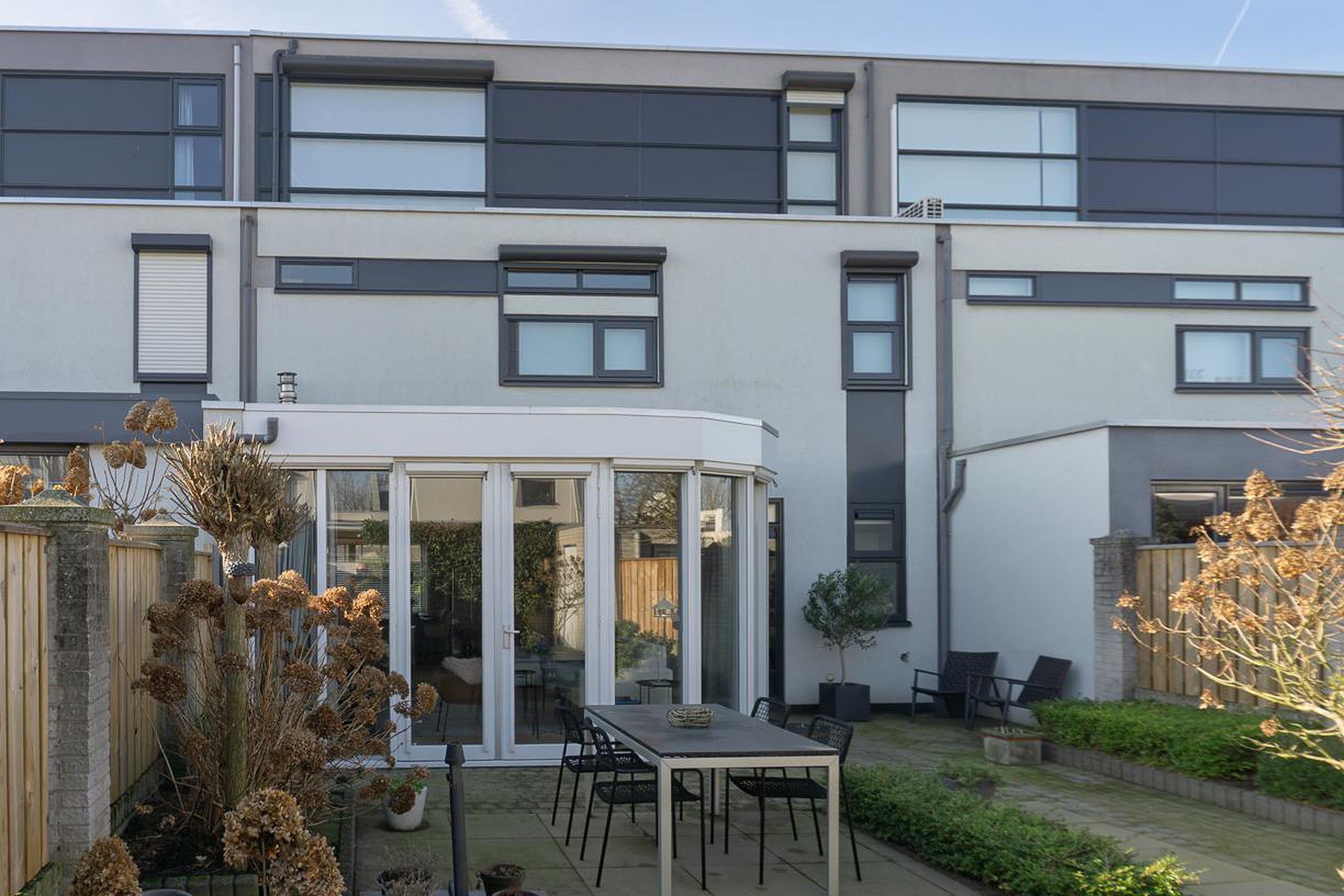 De achter de woning gelegen tuin is gericht op het oosten en is netjes onderhouden. Door de ligging van de tuin heb je het grootste deel van de dag veel zon in de tuin. De tuin is aangelegd met bestrating, plantenborders en enkele bomen. Achter in de tuin staat de berging. De tuin is omheind met een houten schutting (vernieuwd in 2024) tussen stenen pinanten en heeft een achterom die uitkomt op de achter de woning gelegen brandgang.