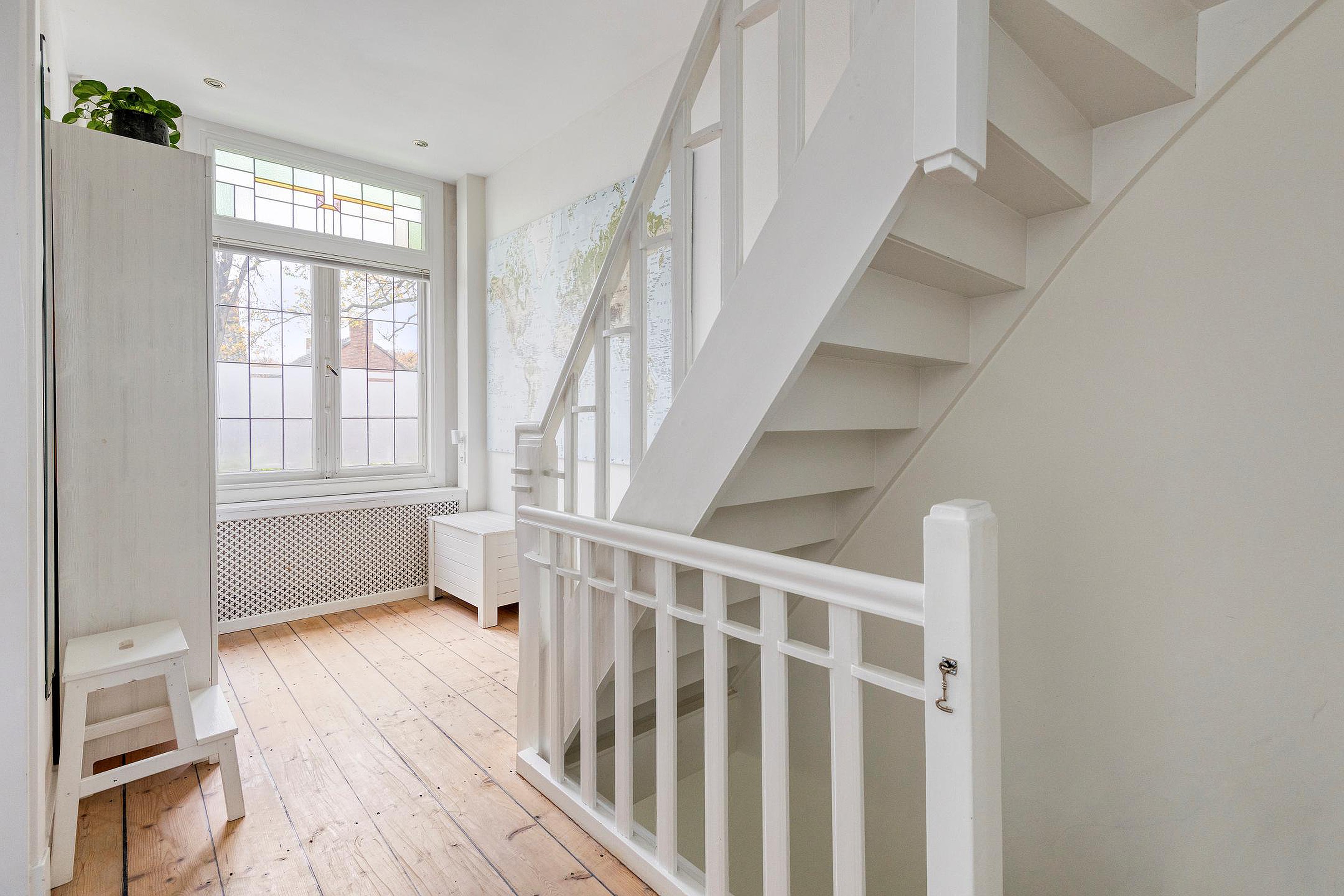Fijne binnenkomst van de woning in deze ruim opgezette hal. Direct valt het mooie afwerkingsniveau op. Authentieke details als de paneeldeuren en het glas-in-lood laten het karakter van de woning volop zien. Via de hal is er toegang tot de woonkamer, het toilet, de meterkast en de trapopgang.