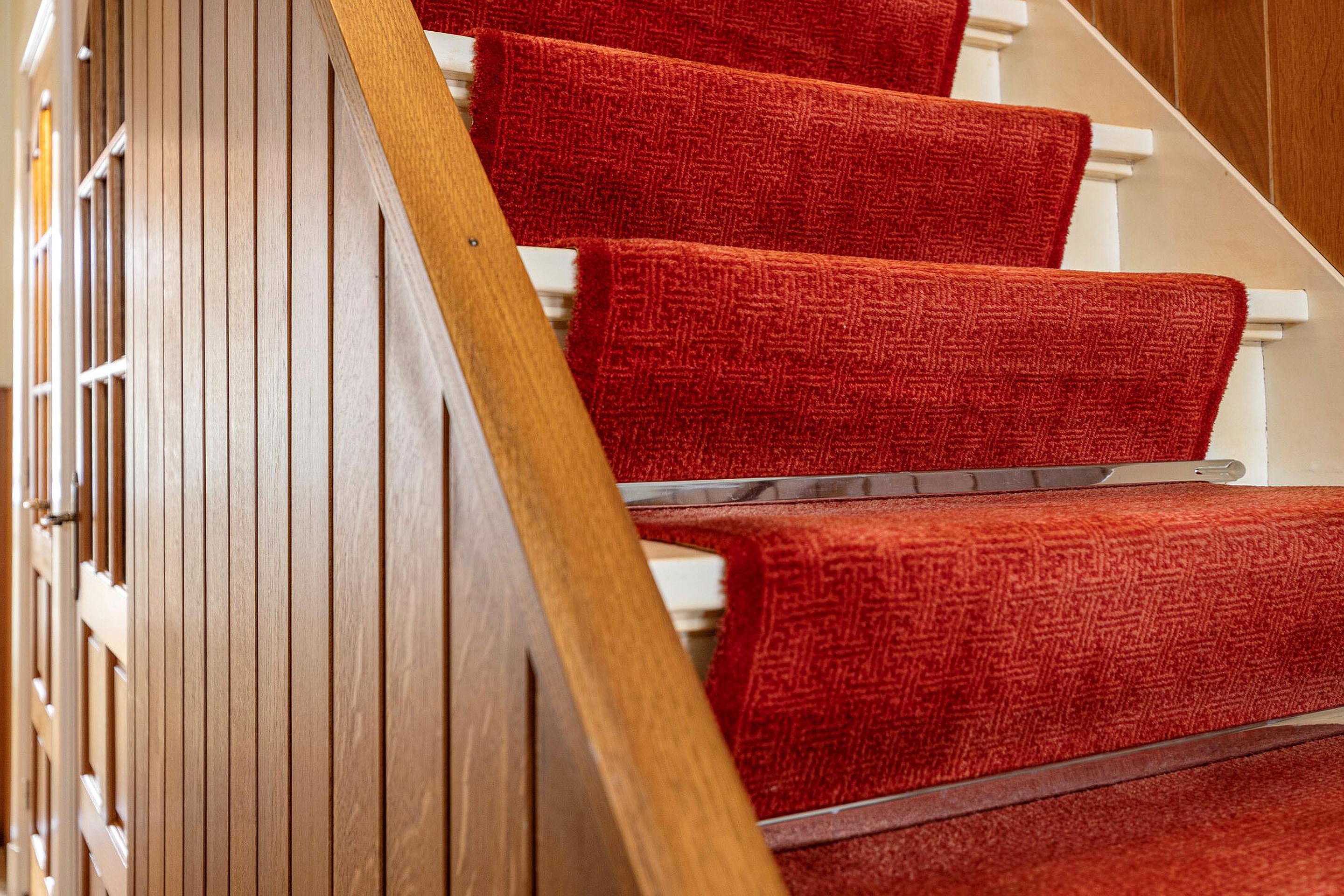 De ruimte is afgewerkt met vloerbedekking, behangen wanden en een zachtboard plafond.