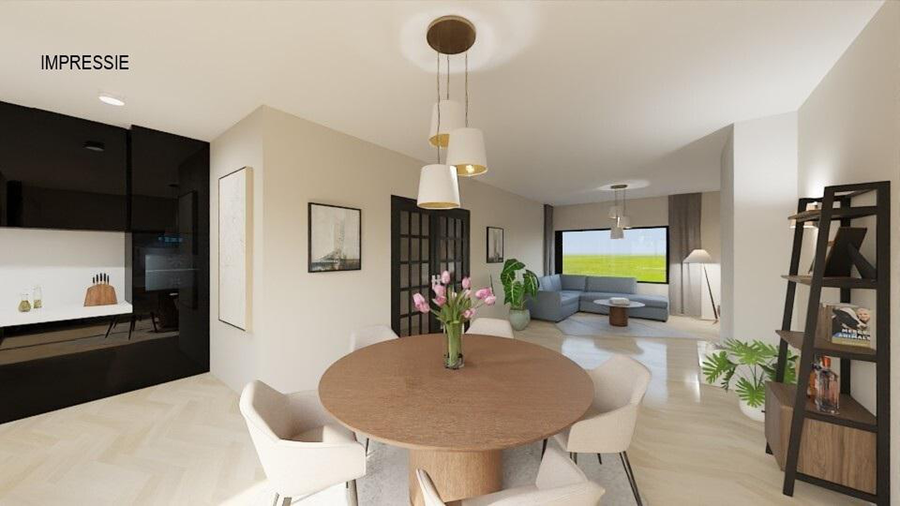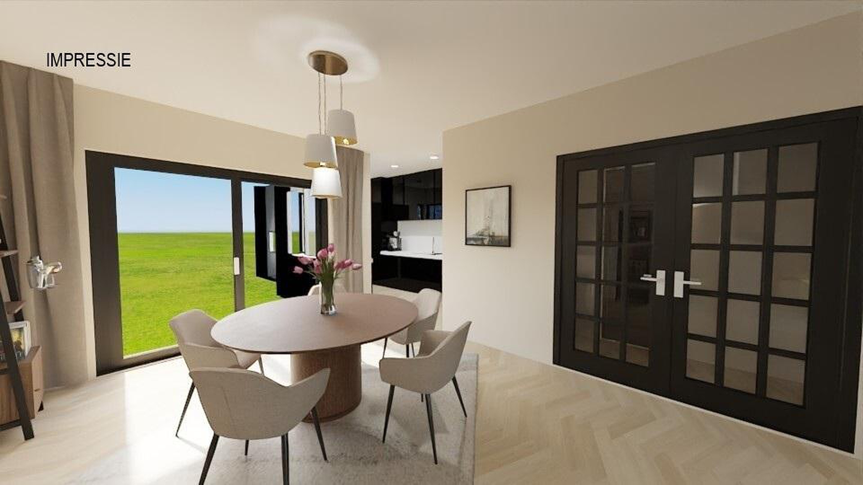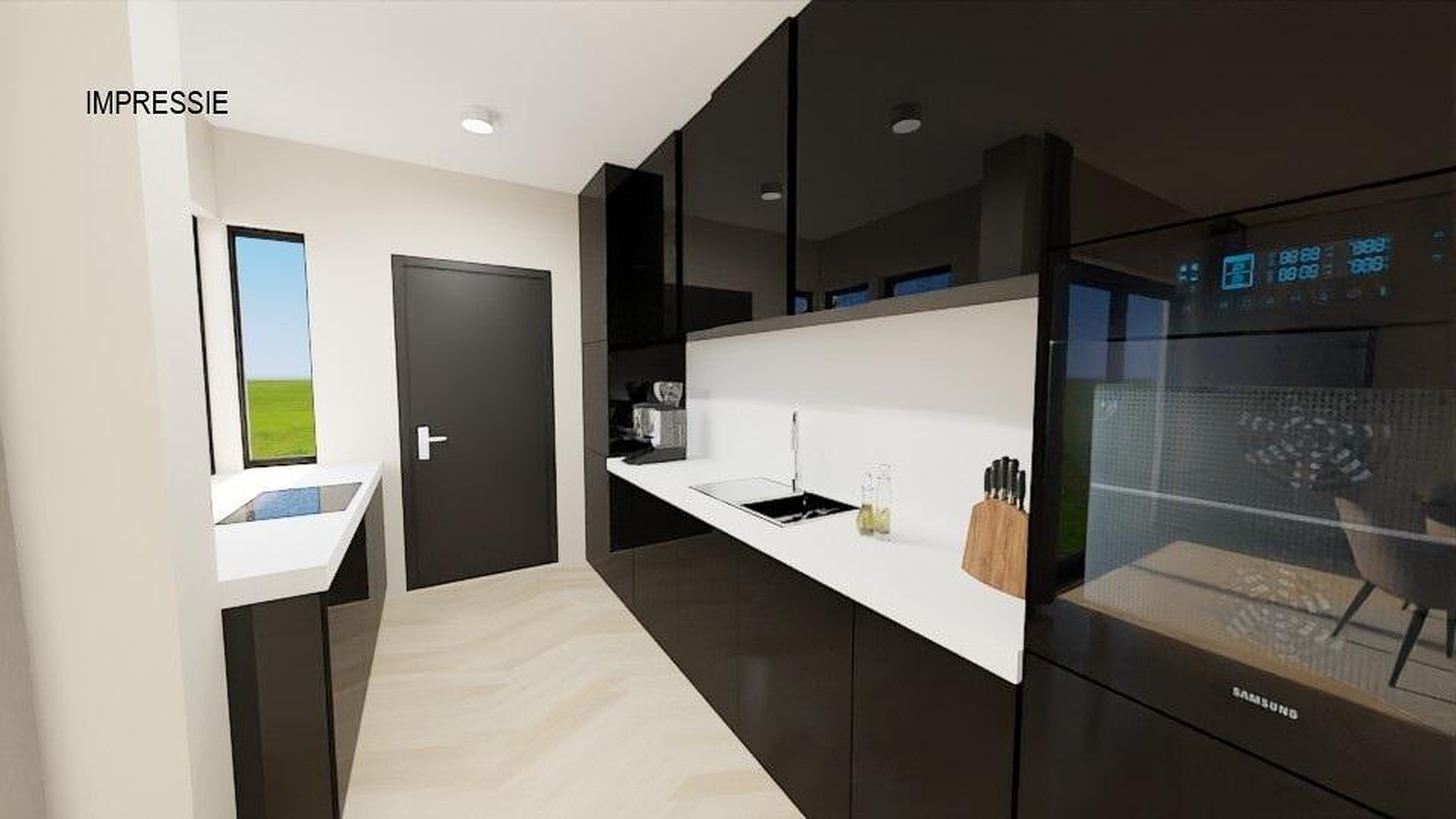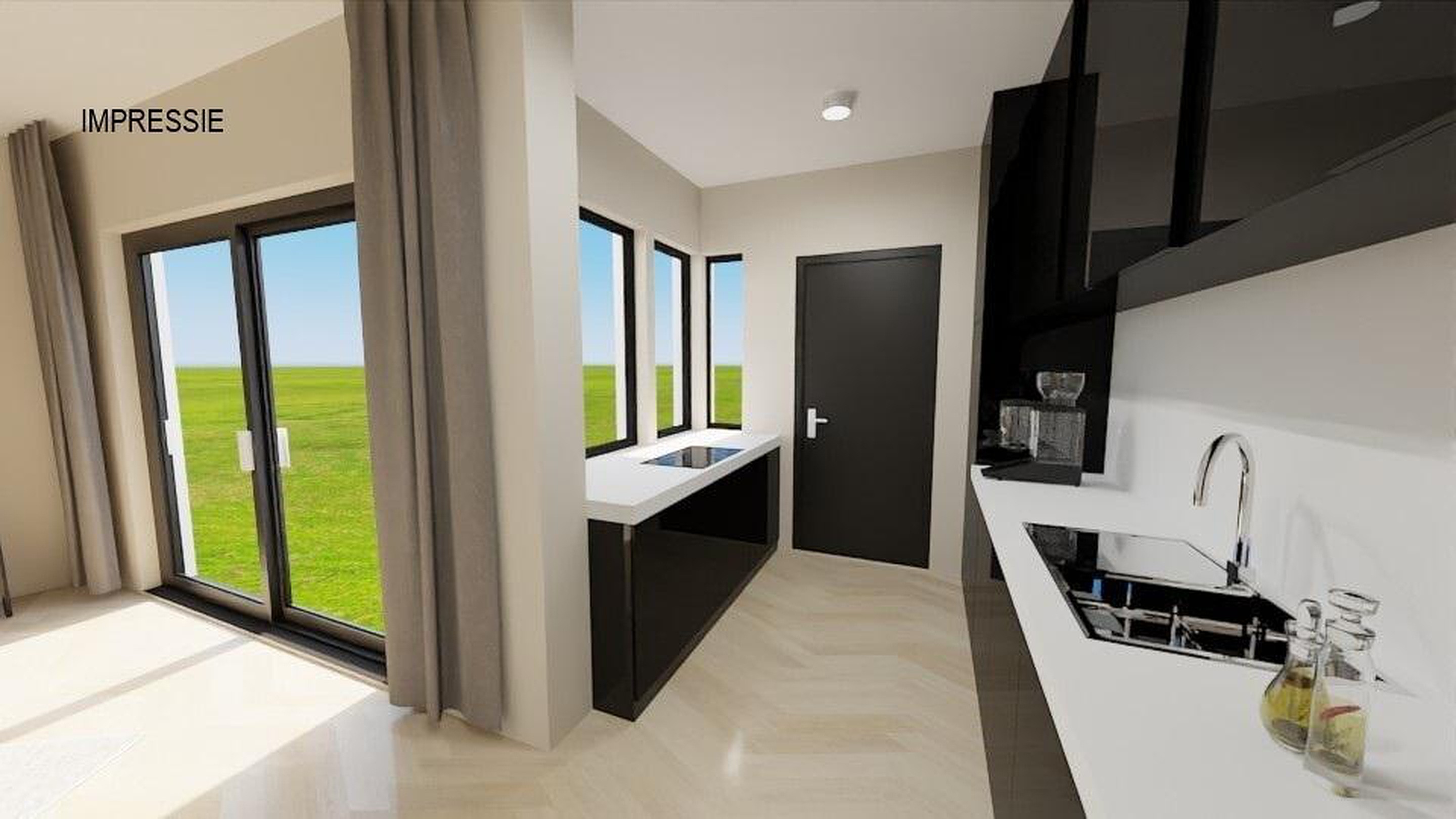 Voor de bouwperiode een ruim opgezette keuken. Via de raampartijen kan het daglicht goed binnenstromen en is er zicht op de tuin. Zo kun je de kinderen in de gaten houden. Met het doorbreken van een muur kun je een heerlijke openkeuken creëren die met alle gemakken is voorzien. Momenteel is er een kunststof aanrechtblok met RVS-werkblad aanwezig en enkele losse kasten. Via de keuken is er toegang tot de bijkeuken.