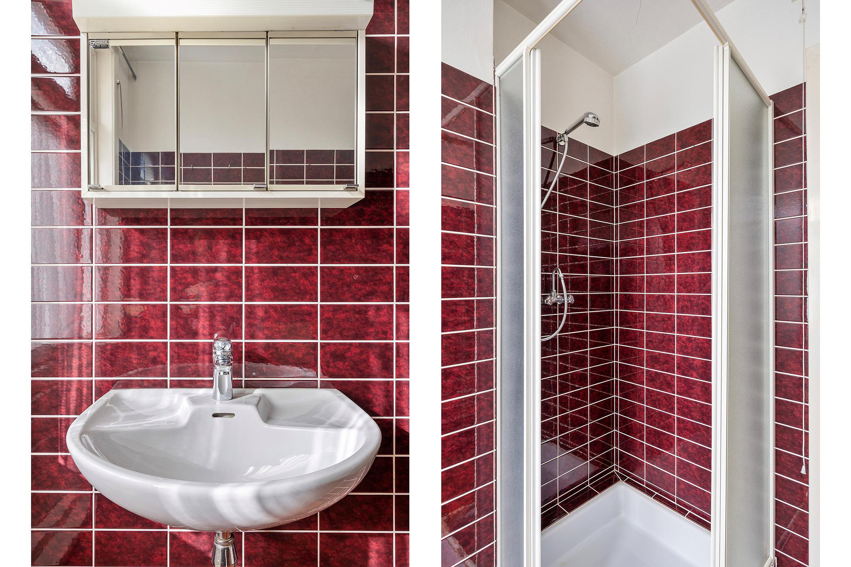 De ruimte is afgewerkt met een tegelvloer, grotendeel betegelde wanden en een gestuukte plafond.