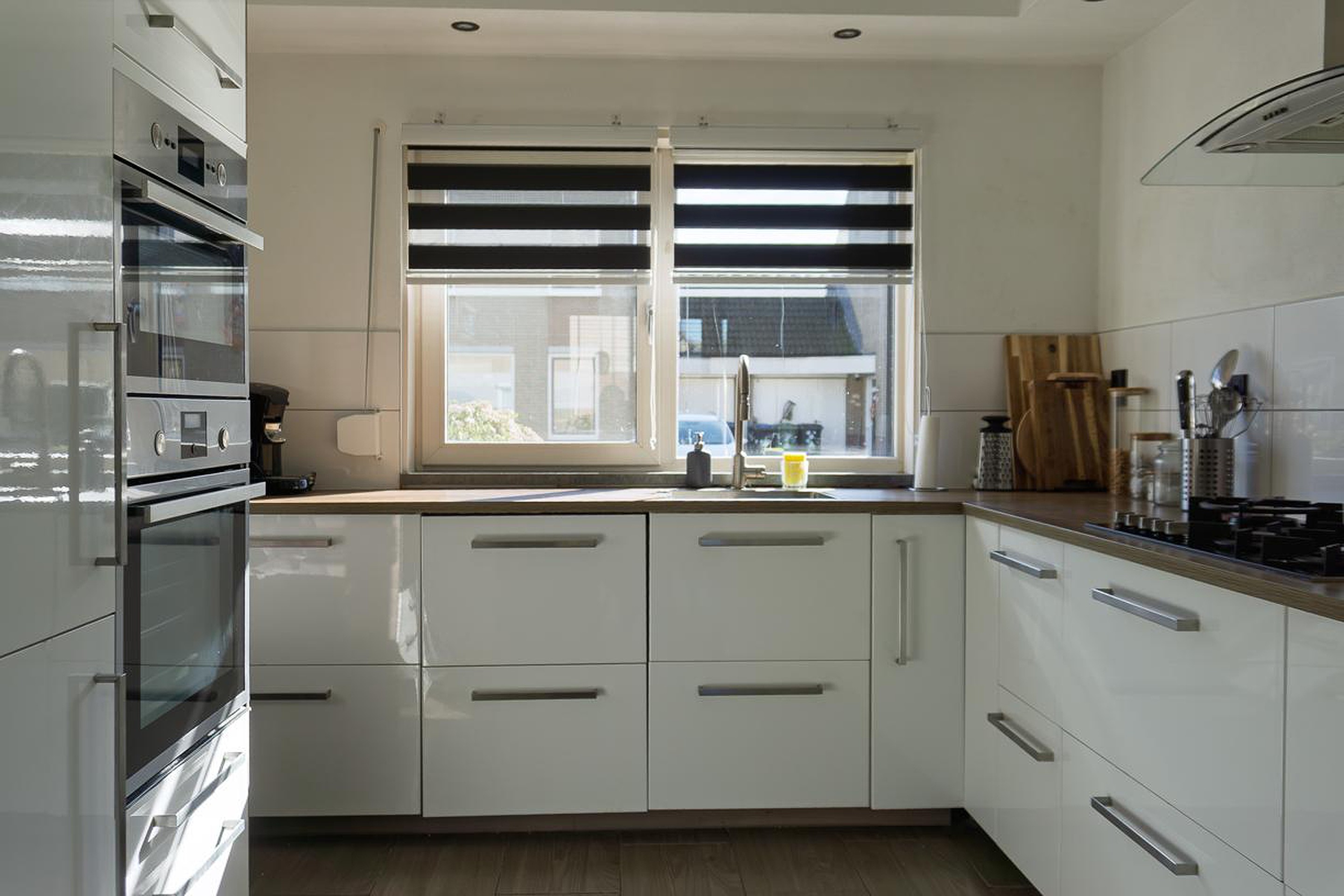 De keuken staat in halfopen verbinding met de woonkamer en is aan de voorzijde van de woning gelegen. Vanuit de keuken heb je uitzicht over de Zwartewaal. Het in L-vorm opgestelde keukenblok beschikt over voldoende onderkasten en -lades, een kunststof werkblad met spoelbak en mengkraan. Ingebouwd zijn een 5-pits gaskookplaat (incl. wok brander) met hierboven de afzuigkap en een vaatwasser. Hiernaast staat een apparatenwand. In de apparatenwand zijn aanwezig een combi-oven/grill/magnetron, een combi-oven/grill en een koel/vriescombinatie. De achterwand boven het werkblad is deels betegeld. De afwerking bestaat verder uit spuitwerk op de wanden en het plafond. De vloer is betegeld.
