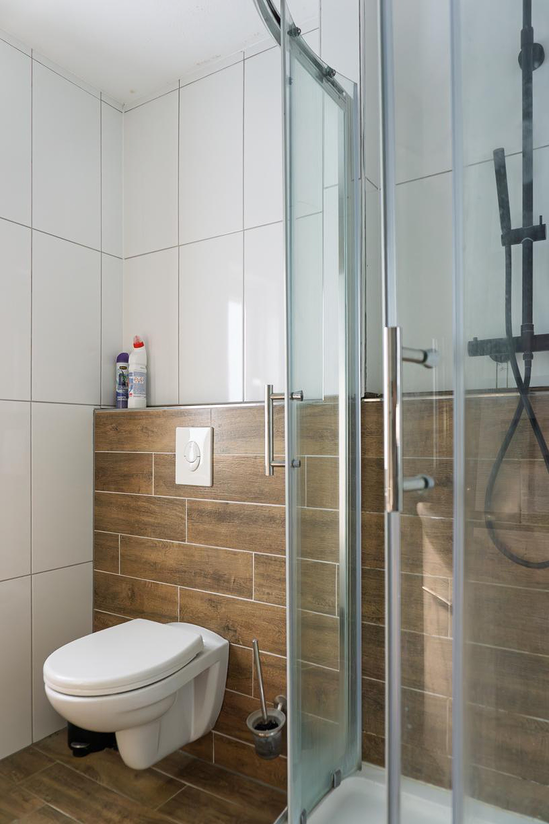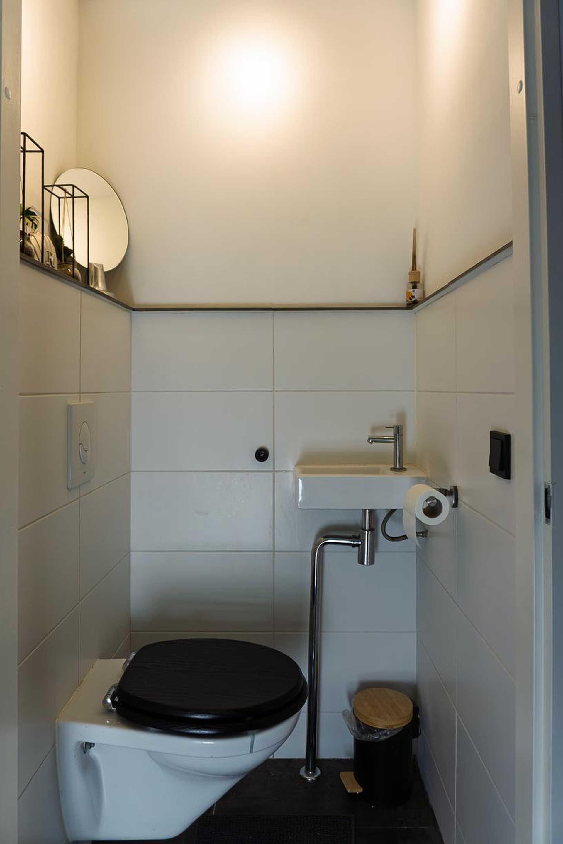 Het toilet bestaat uit een hangcloset en fontein. Het toilet is betegeld tot ongeveer halfhoog. Hierboven zijn de wanden en het plafond afgewerkt met spuitwerk.