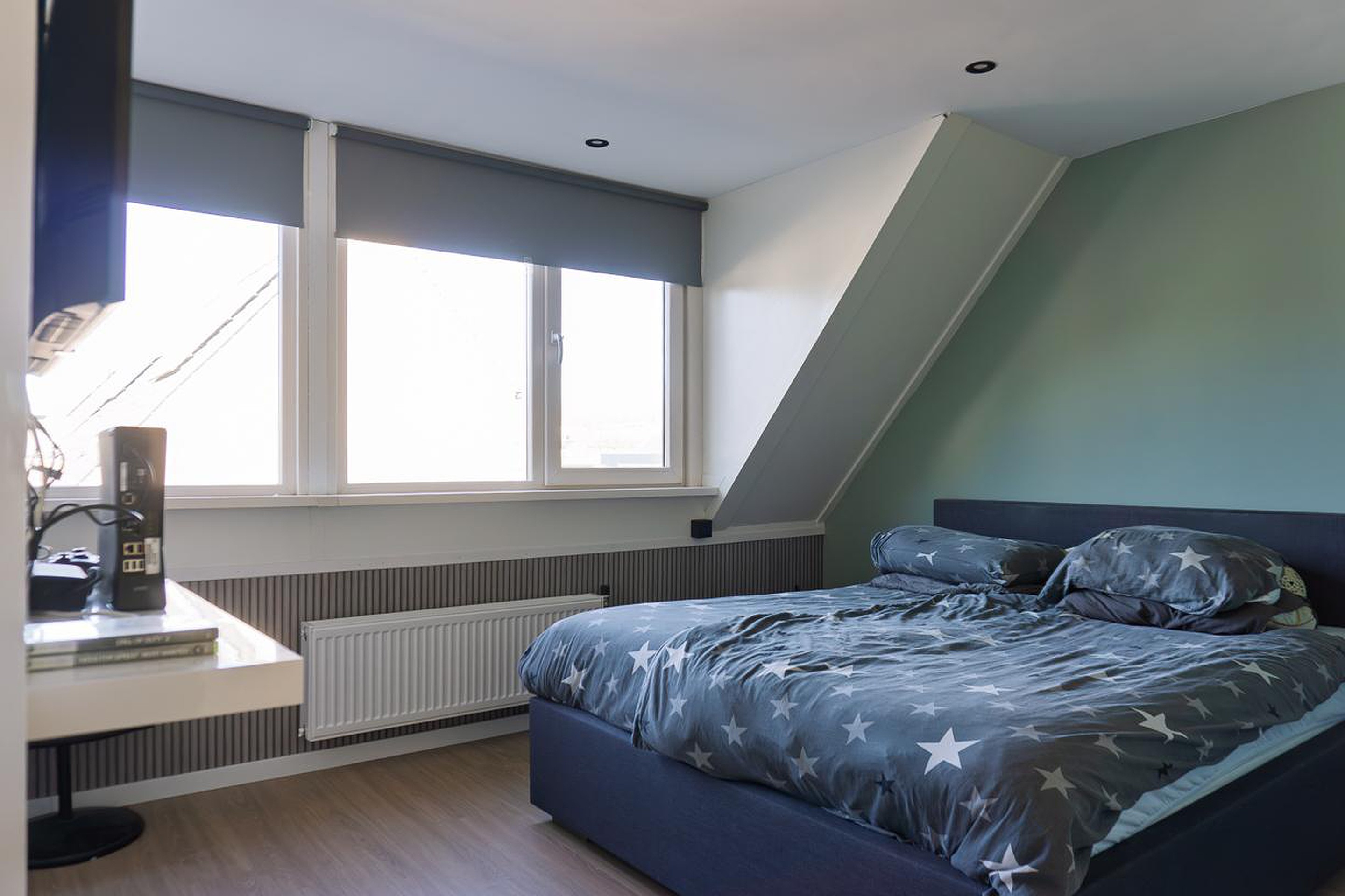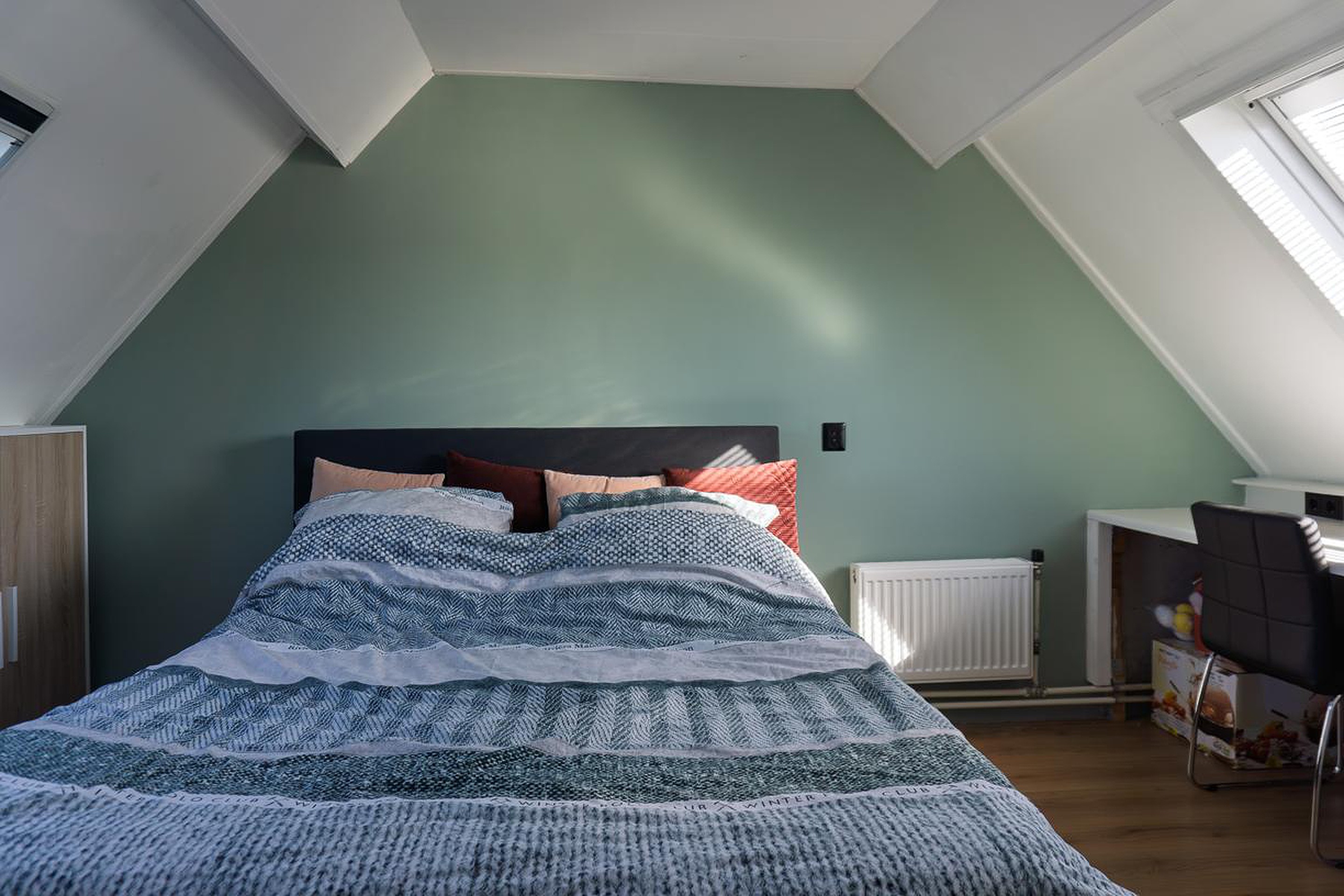 De ruime zolderkamer beschikt aan zowel de voor- als achterzijde over een dakvenster. In deze slaapkamer kan een 2-persoonsbed staan en een bureau. De wanden en het plafond op de zolderkamer zijn afgewerkt met stucwerk en op de vloer ligt laminaat. De (geïsoleerde) dakplaten zijn gesausd.