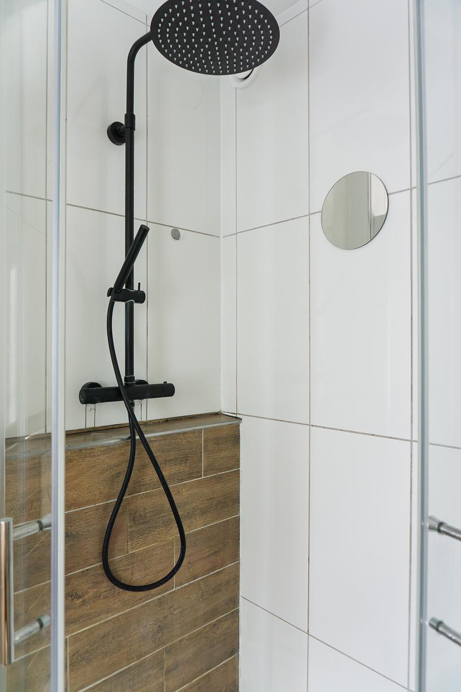 De verwarmde badkamer beschikt over een hoek-/instapdouche met regendouche en handsproeier, een hangcloset en een wastafel waaronder een badkamermeubel aanwezig is. De vloer en de wanden van de badkamer zijn volledig betegeld. Het plafond is afgewerkt met spuitwerk.