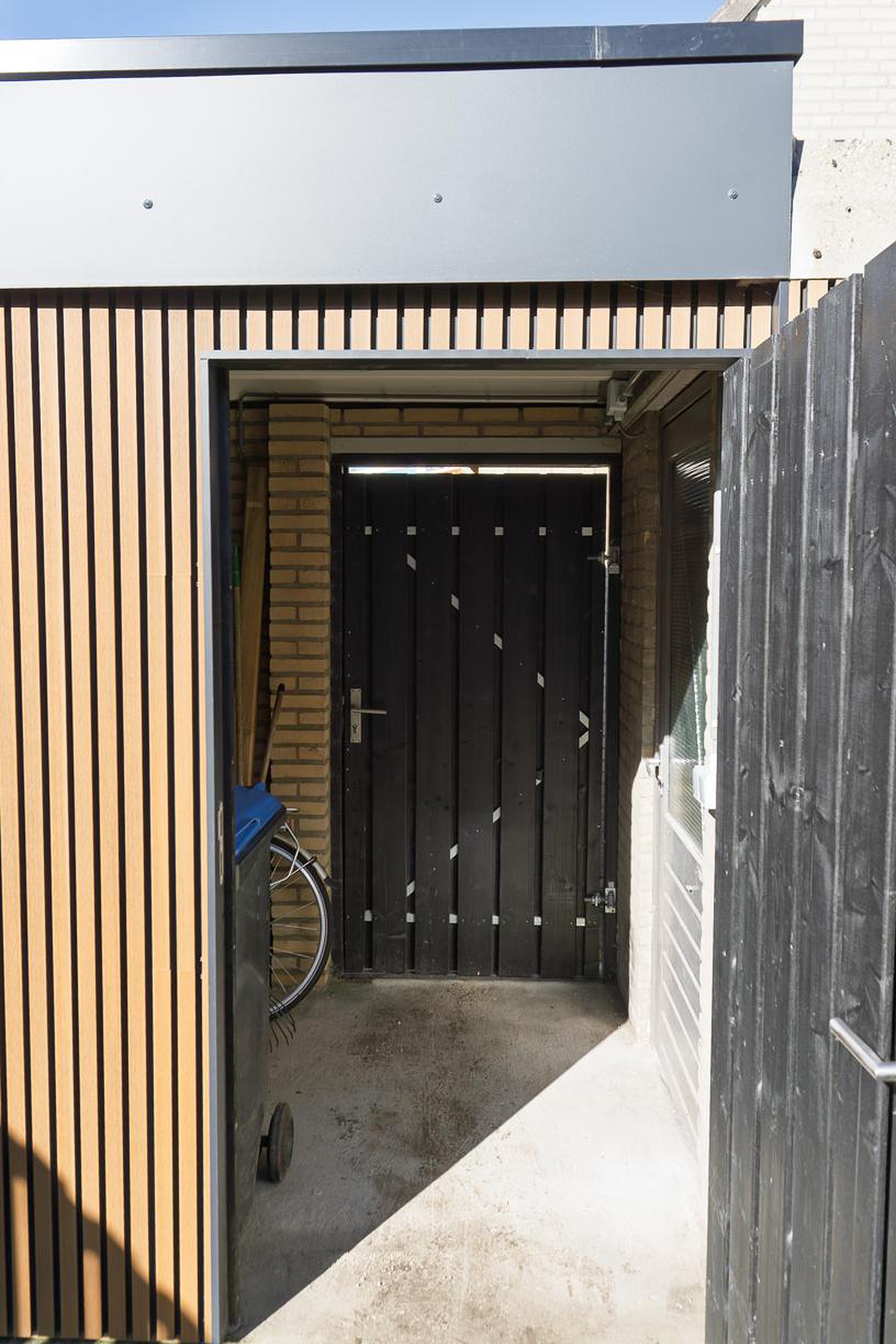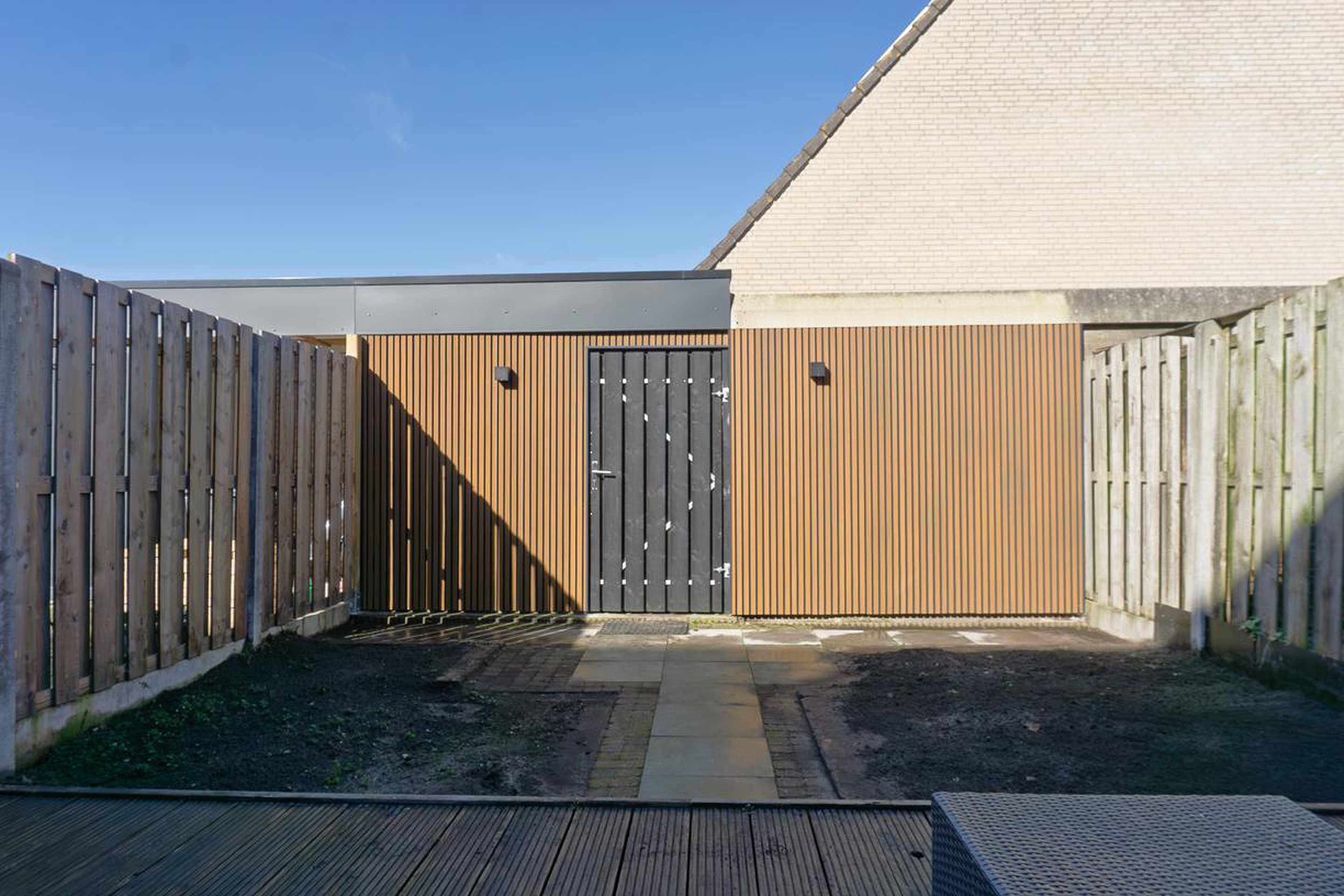 Vanuit de woonkamer loop je via de tuindeur de nog verder aan te leggen tuin in. De op het noordwesten gesitueerde tuin is aangelegd met deels een houten vlonder en nog te beplanten borders. Achter in de tuin staat een met hout beklede (dubbele) berging met hierin de deur naar de achter de woning gelegen brandgang. De tuin is omheind door een houten schutting.