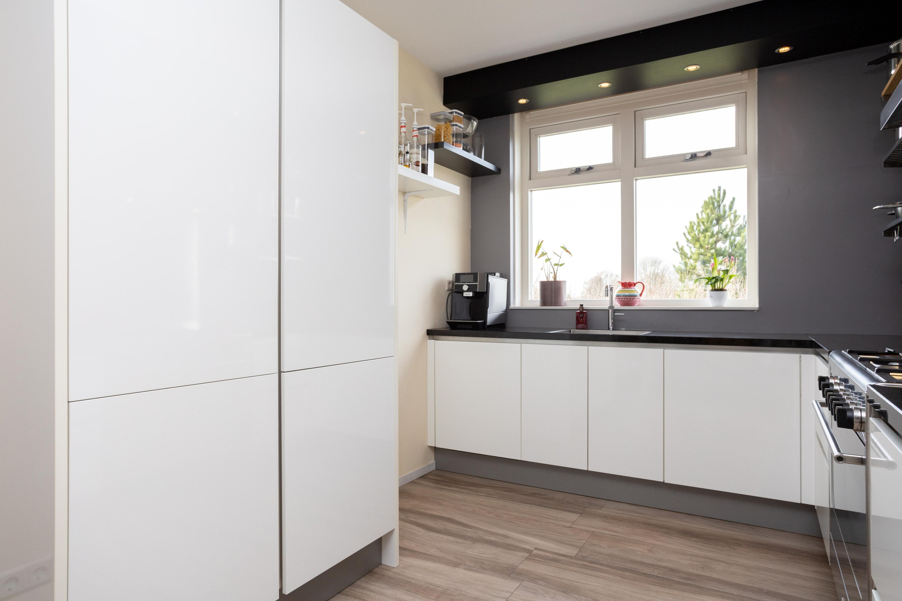 Ruime entree met meterkast, garderobe en toilet met fonteintje. Vanuit de entree toegang tot de ruime living. Wat direct opvalt zijn de grote ramen, heerlijk al dat licht. Op de vloer plavuizen met vloerverwarming, wat een comfort. Ook fijn dat er airconditioning aanwezig is. De luxe keuken is aan de voorzijde gesitueerd en is voorzien van een Quooker, 5 pits gaskookplaat, oven, koelkast en een vriezer. Het geheel is afgewerkt met een composiet blad. Vanuit de woonkamer toegang tot het heerlijke zonneterras.