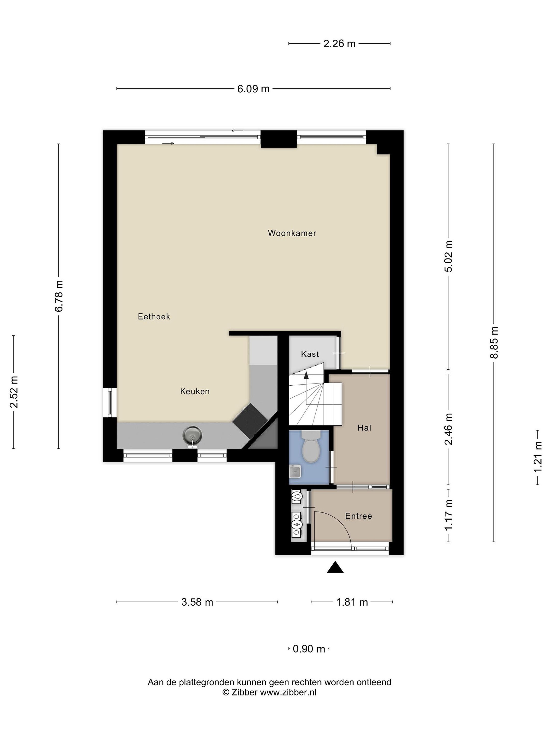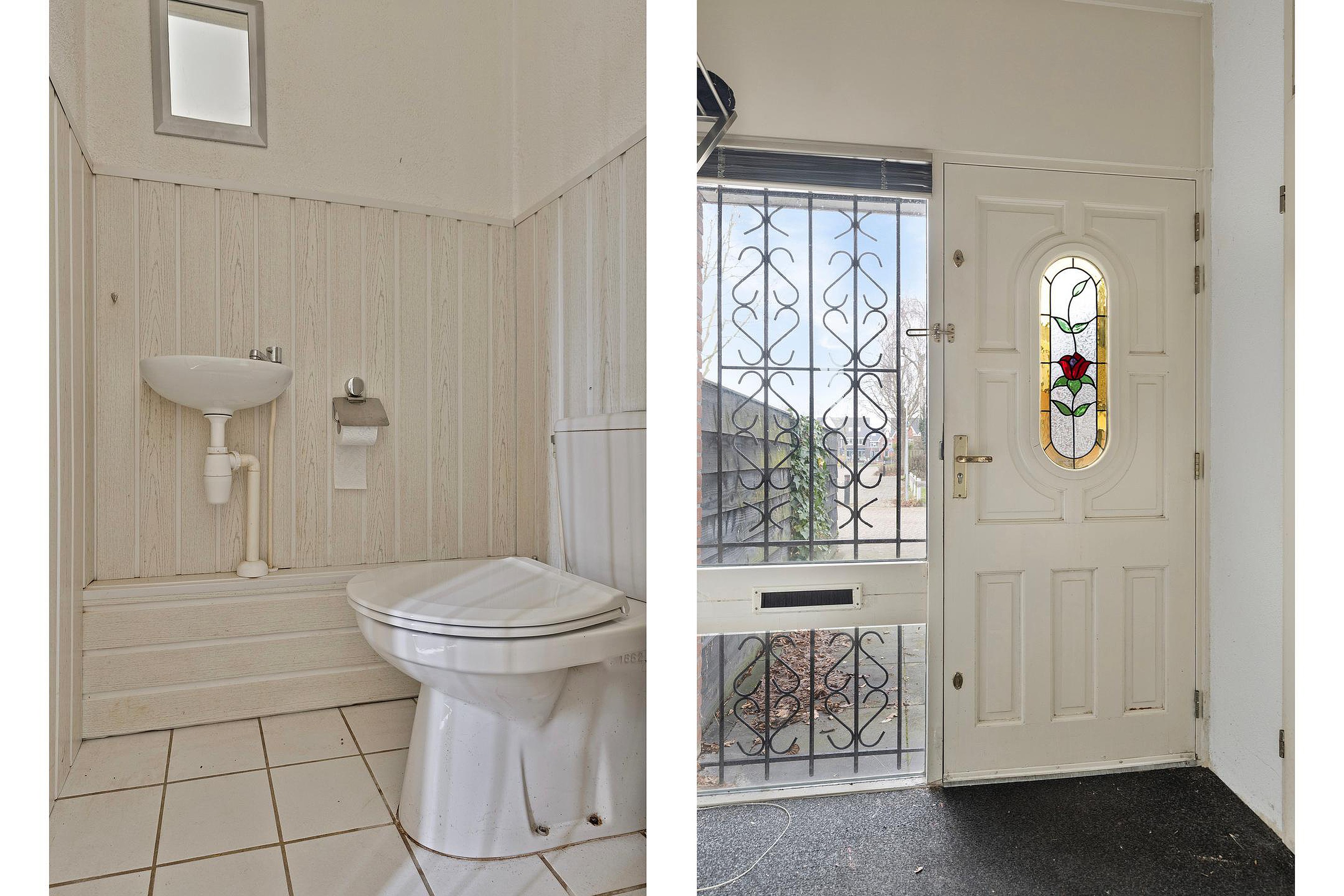 Entree, hal met meterkast, toilet, trap naar de 1e verdieping en toegang tot de woonkamer.