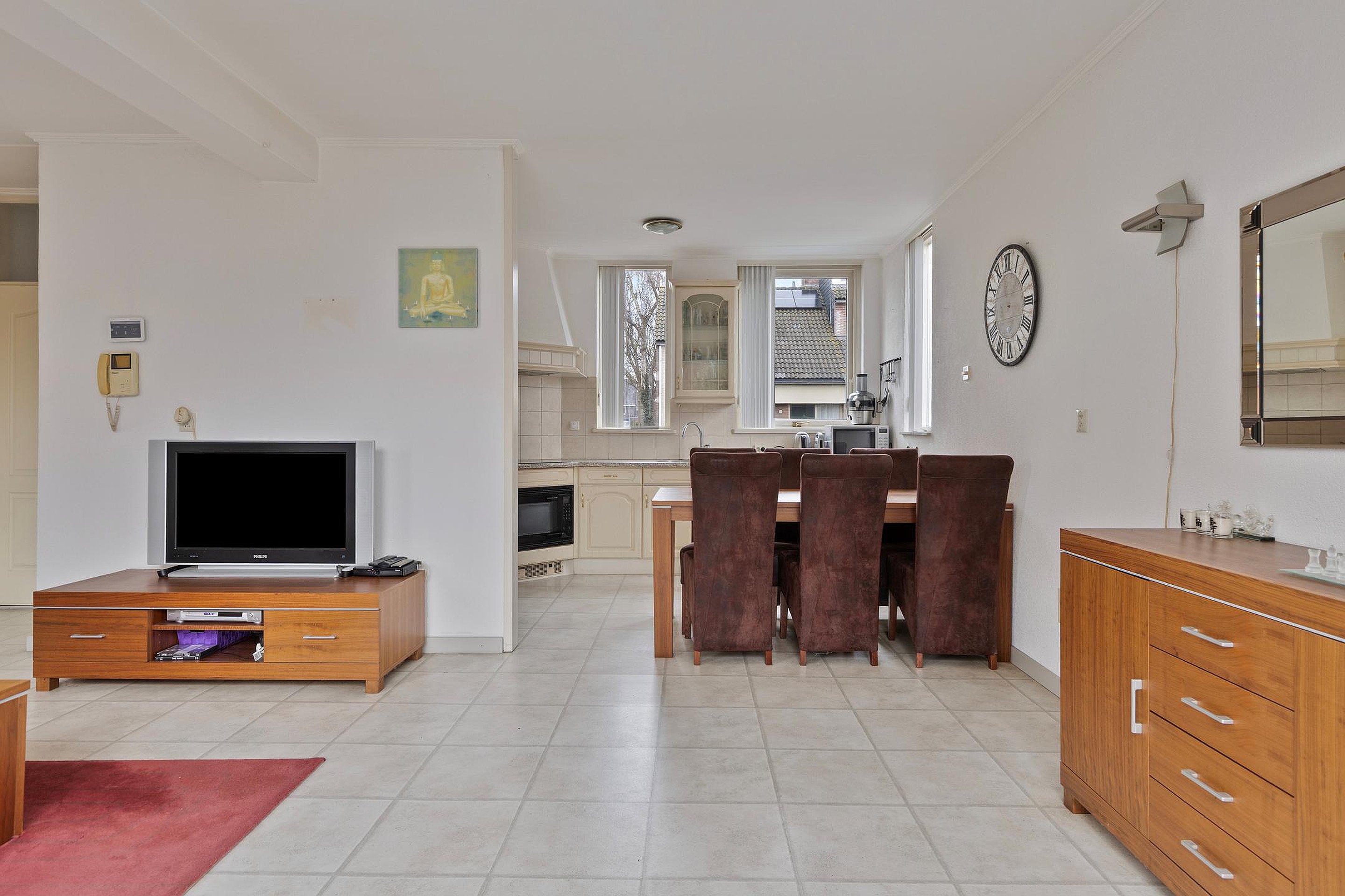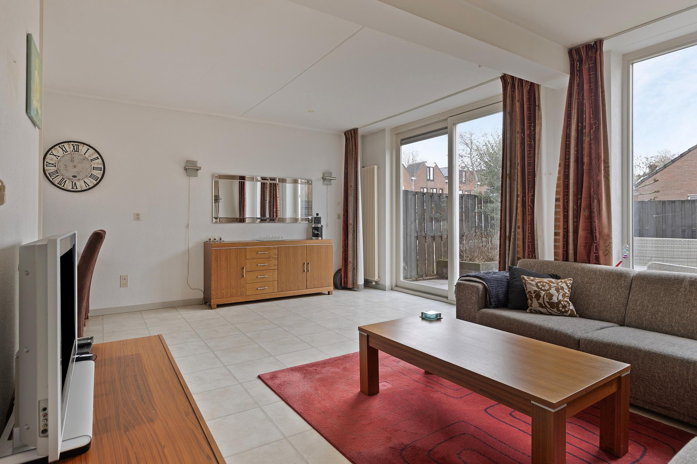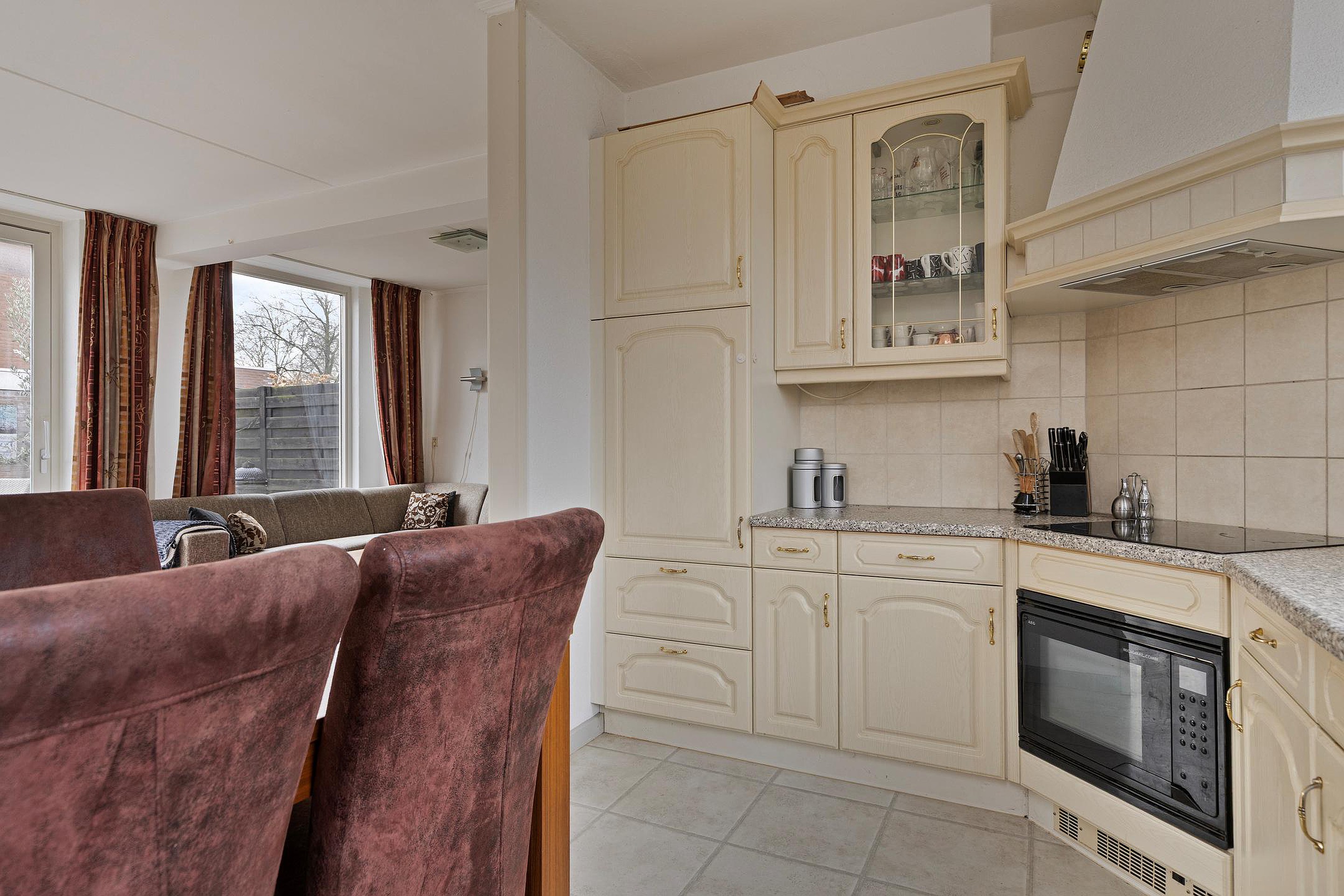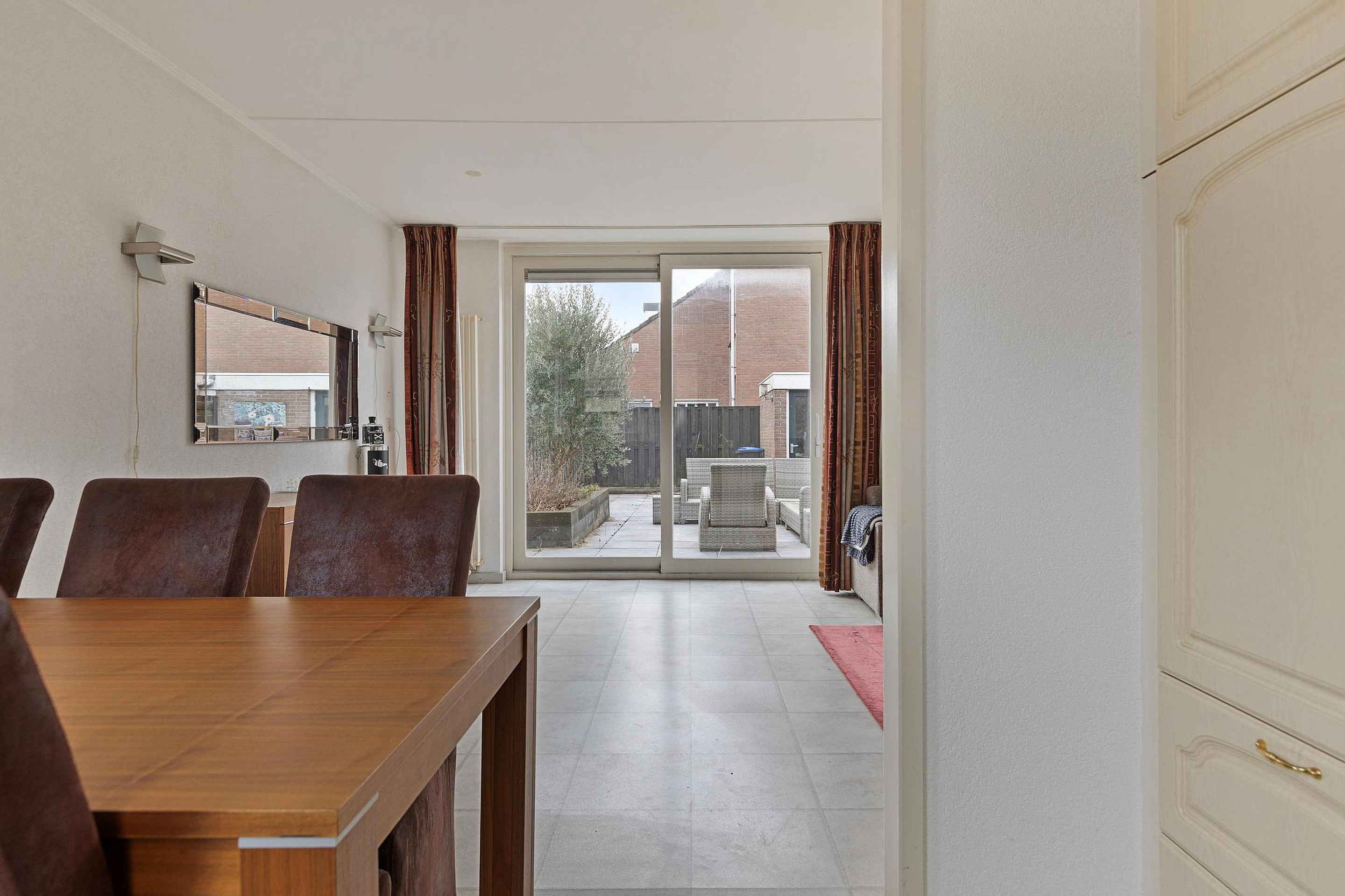De woonkamer is gelegen aan de achterzijde van de woning, is tuingericht en heeft een open keuken met in hoek opgestelde keukeninrichting. Middels een schuifpui is er toegang tot de achtertuin.