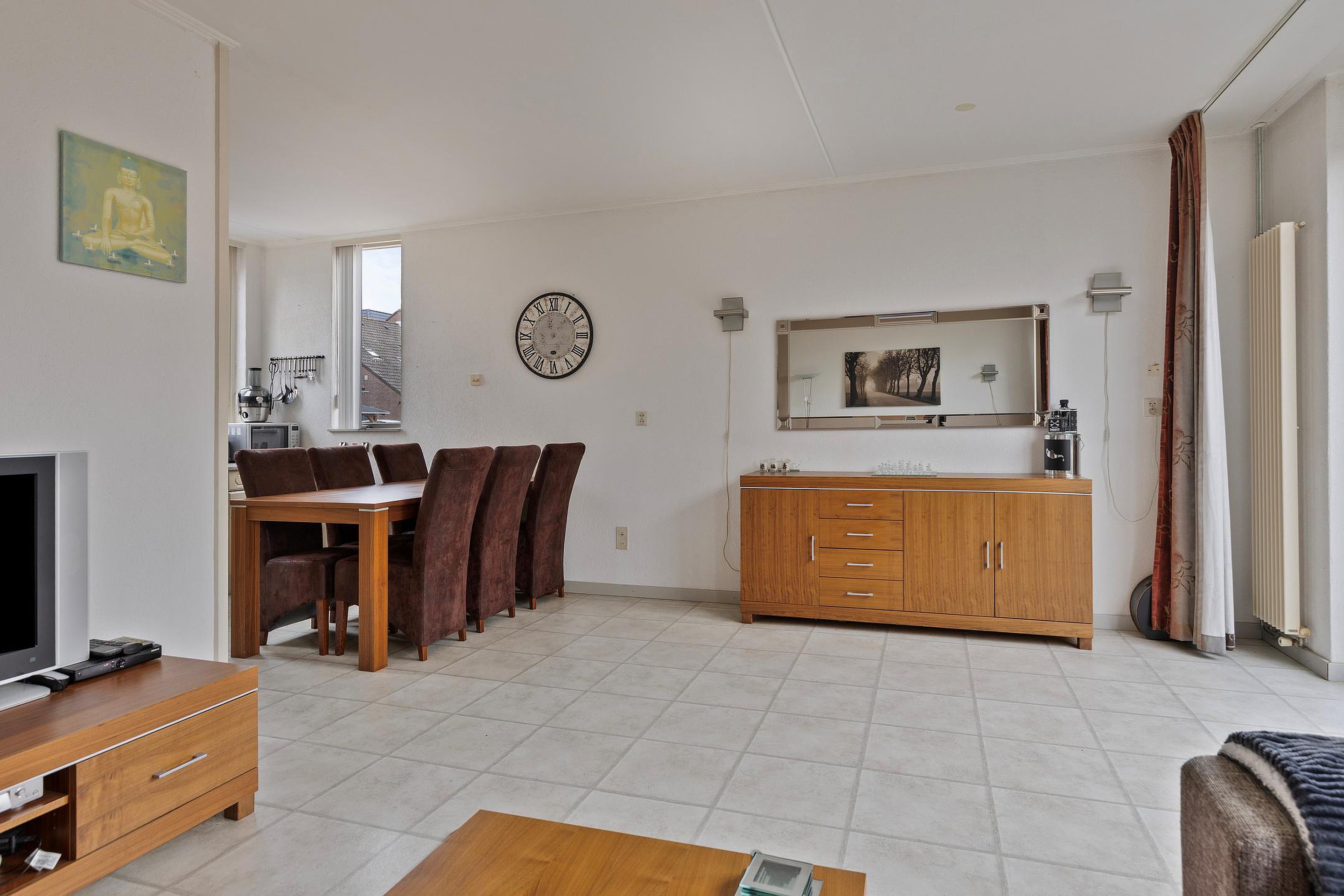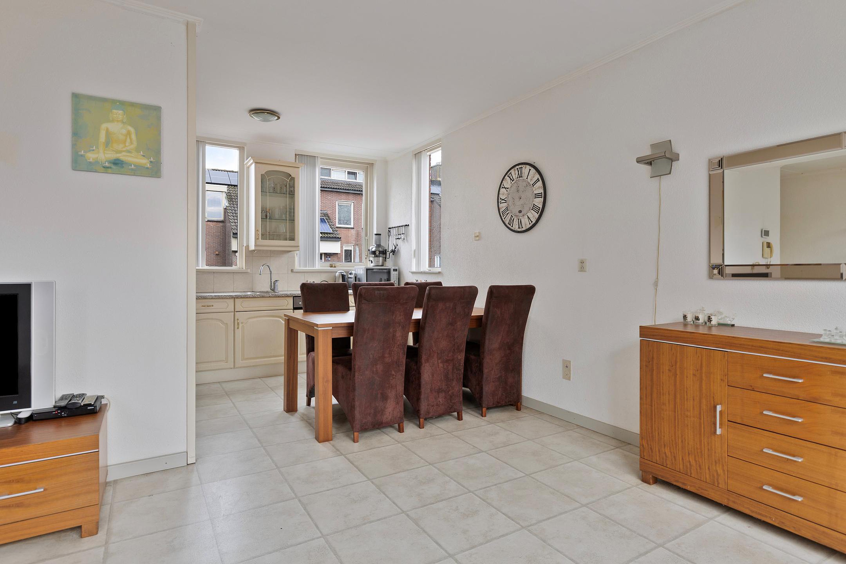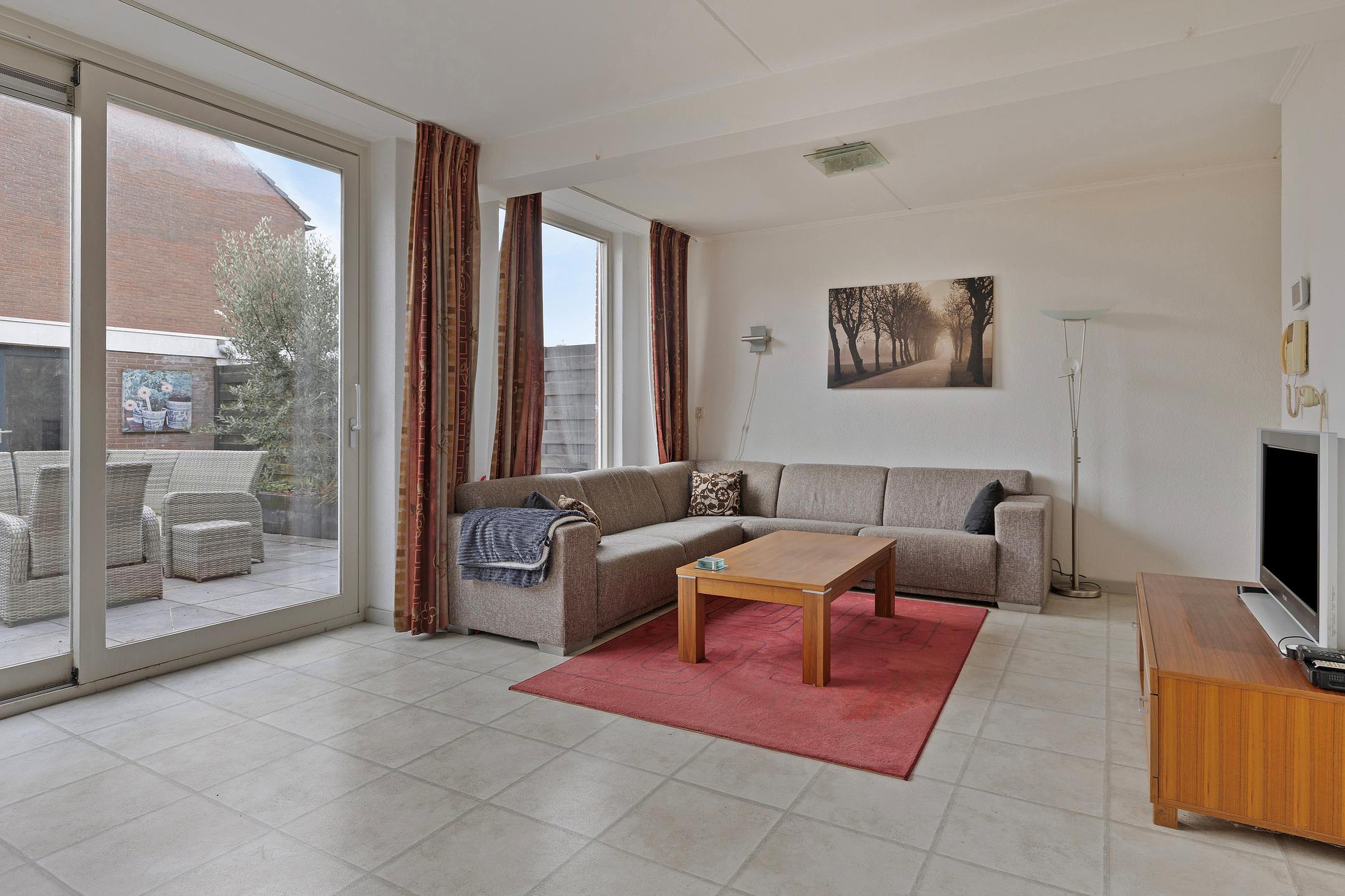De woonkamer is gelegen aan de achterzijde van de woning, is tuingericht en heeft een open keuken met in hoek opgestelde keukeninrichting. Middels een schuifpui is er toegang tot de achtertuin.