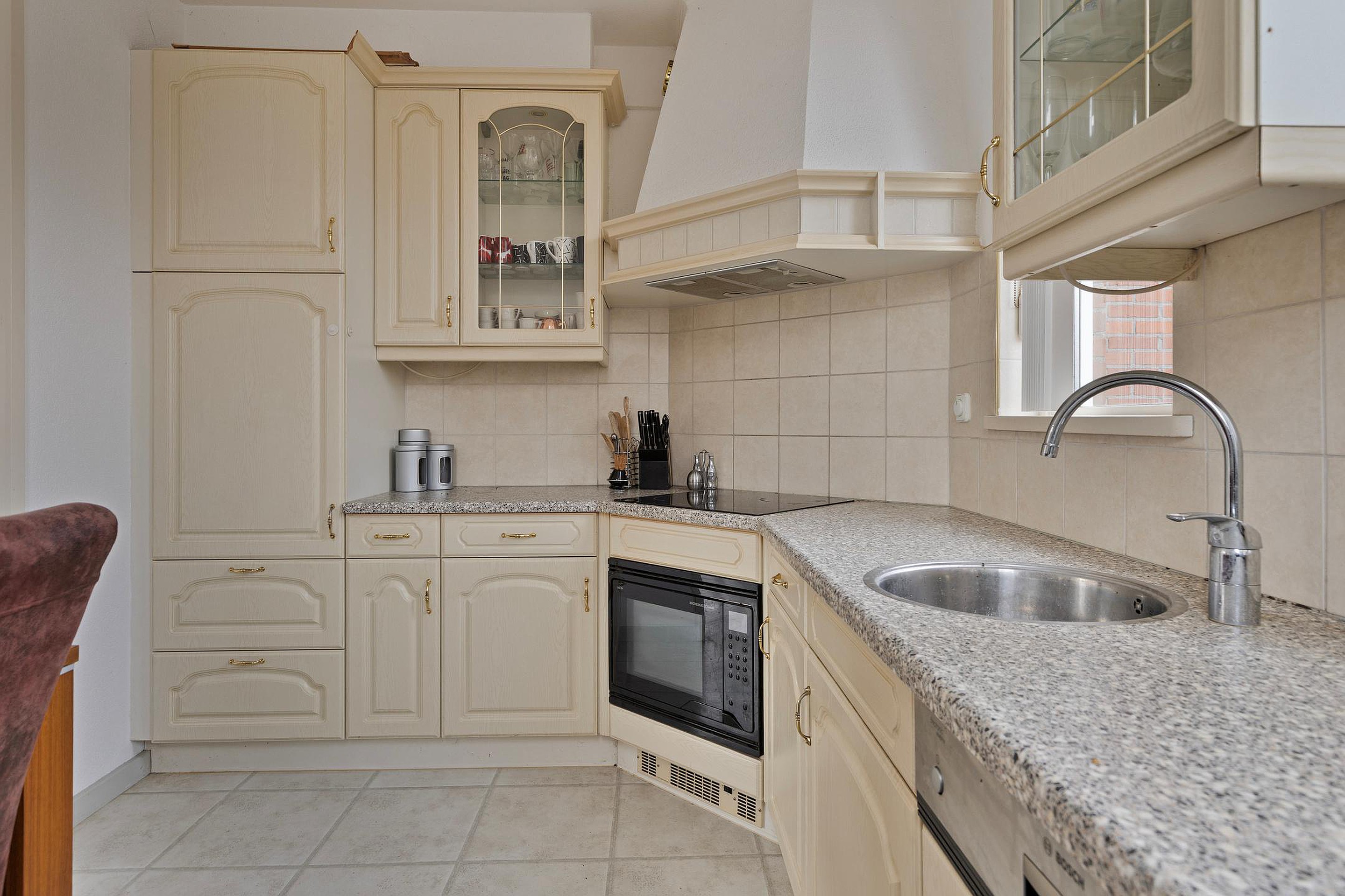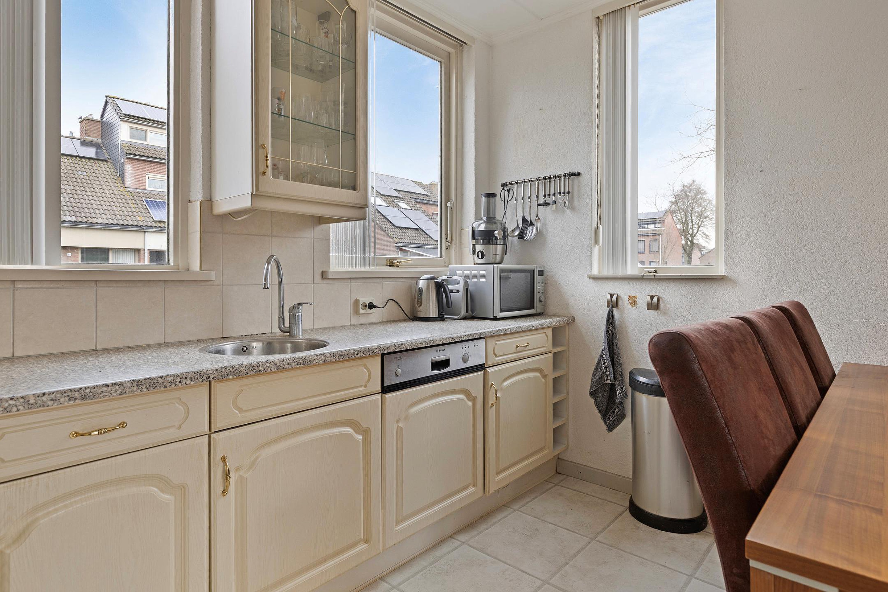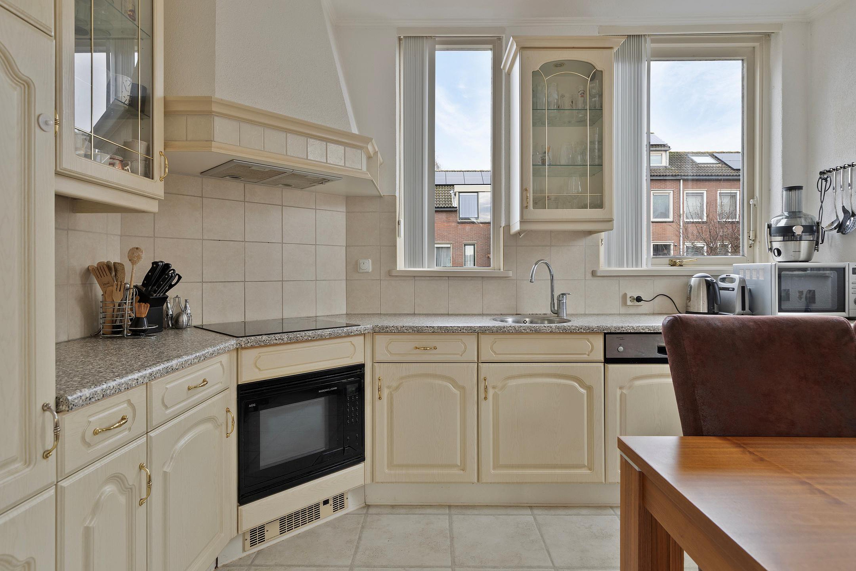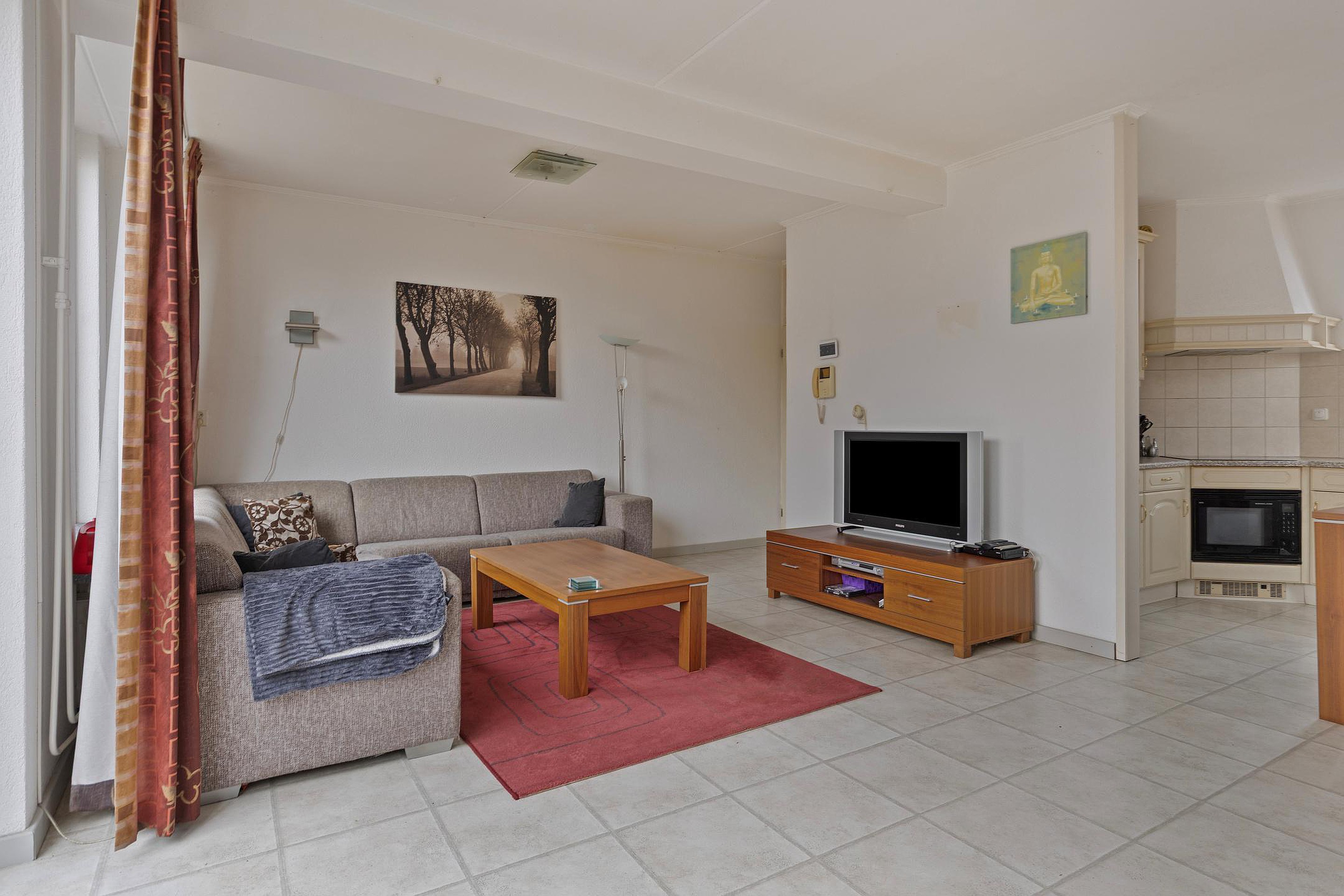 De woonkamer is gelegen aan de achterzijde van de woning, is tuingericht en heeft een open keuken met in hoek opgestelde keukeninrichting. Middels een schuifpui is er toegang tot de achtertuin.