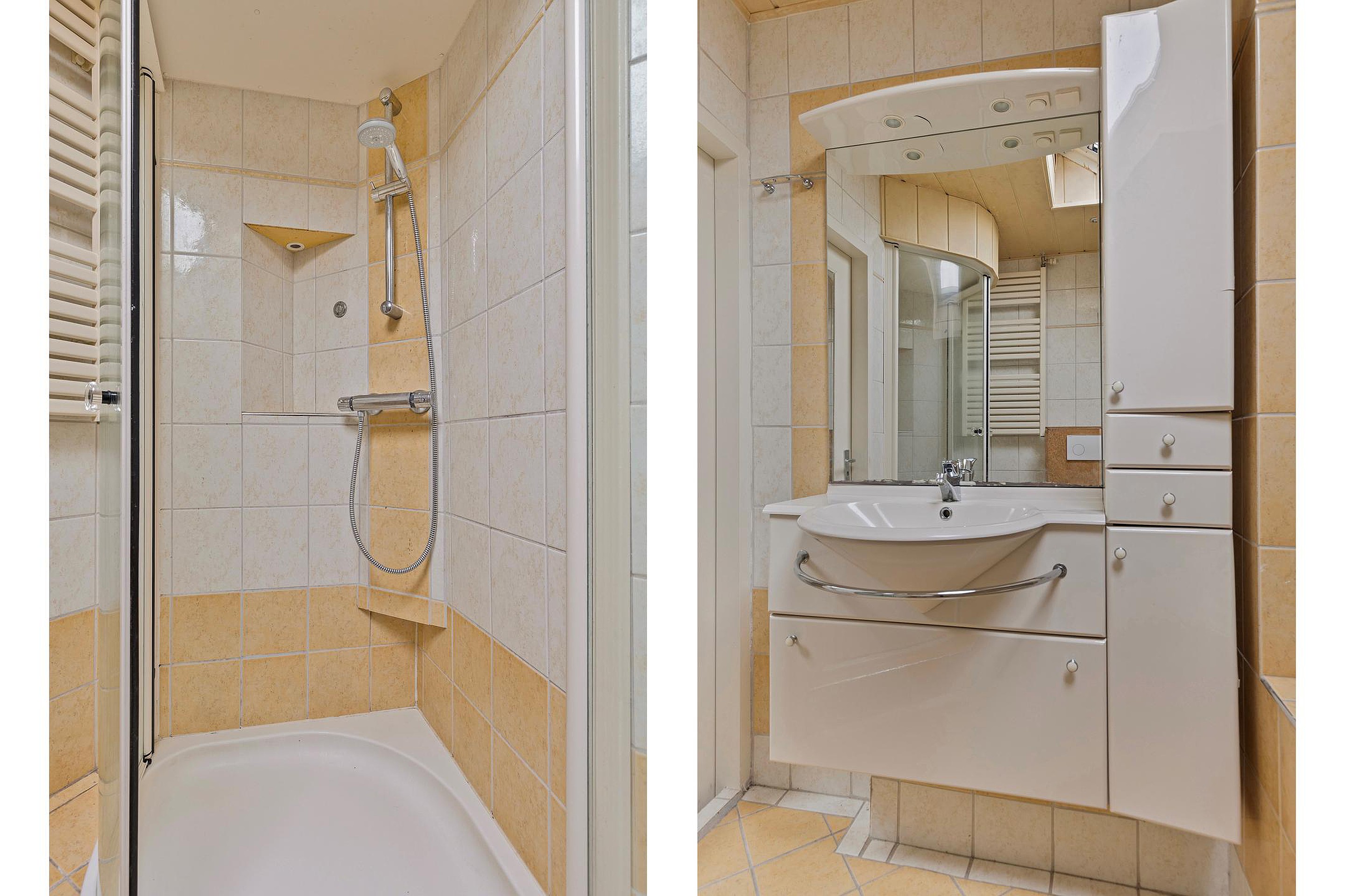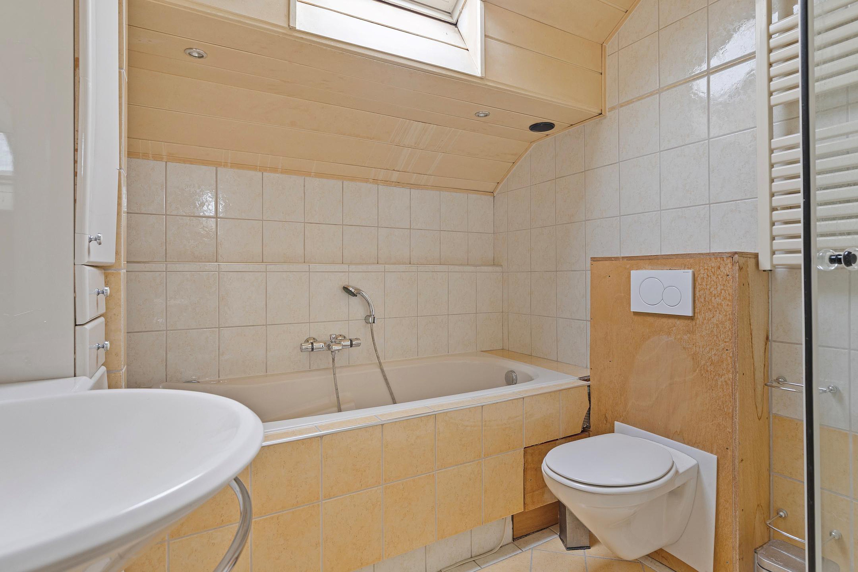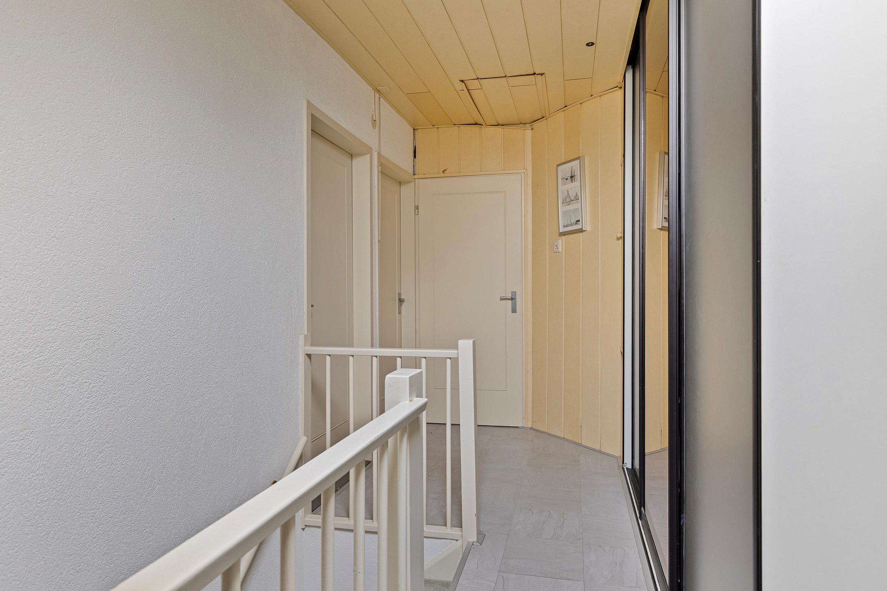 Overloop met veel bergruimte, opstelplaats van de CV ketel, wasmachineaansluiting en toegang tot 2 slaapkamers en de badkamer welke is voorzien van een ligbad, douche, toilet en wastafel.