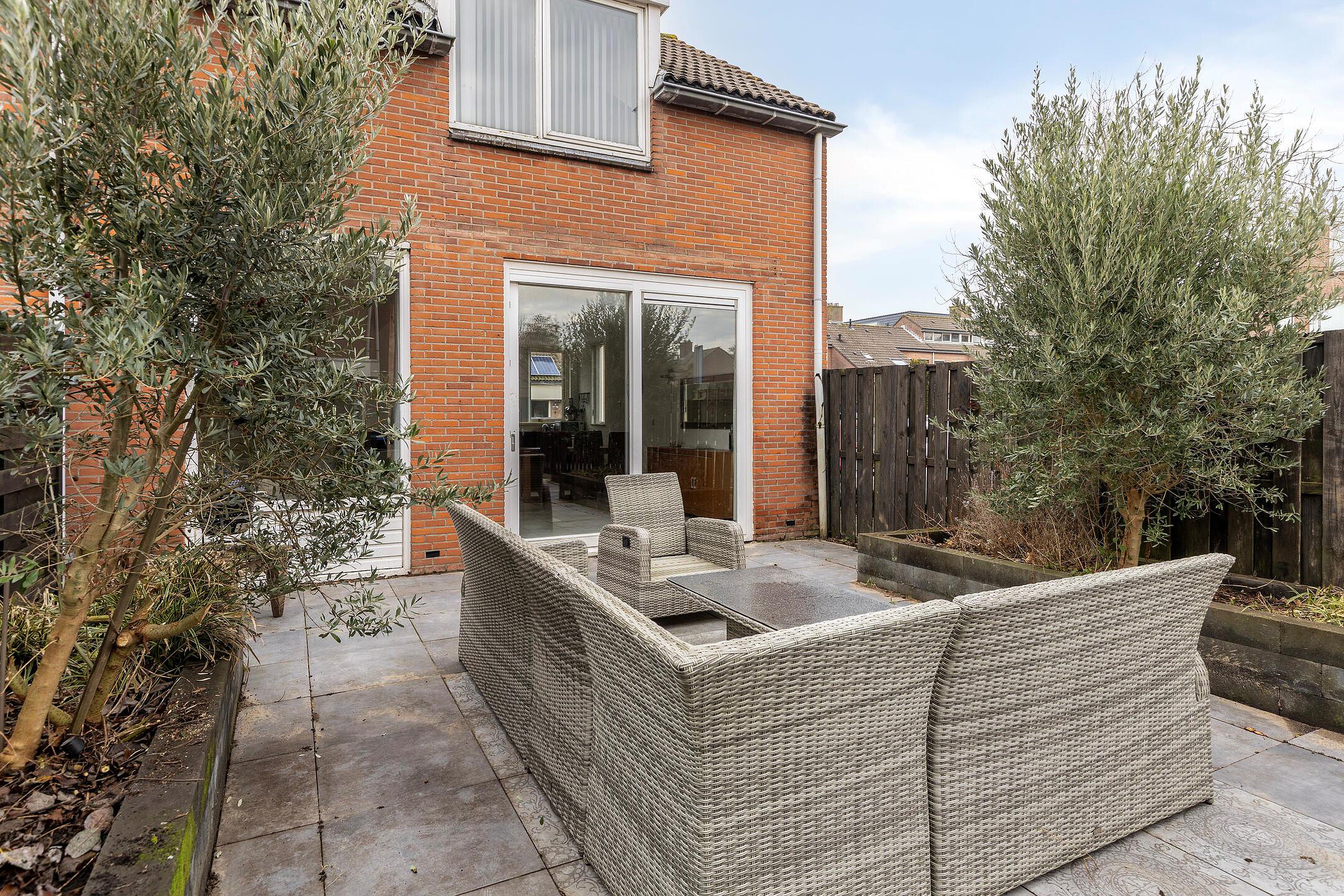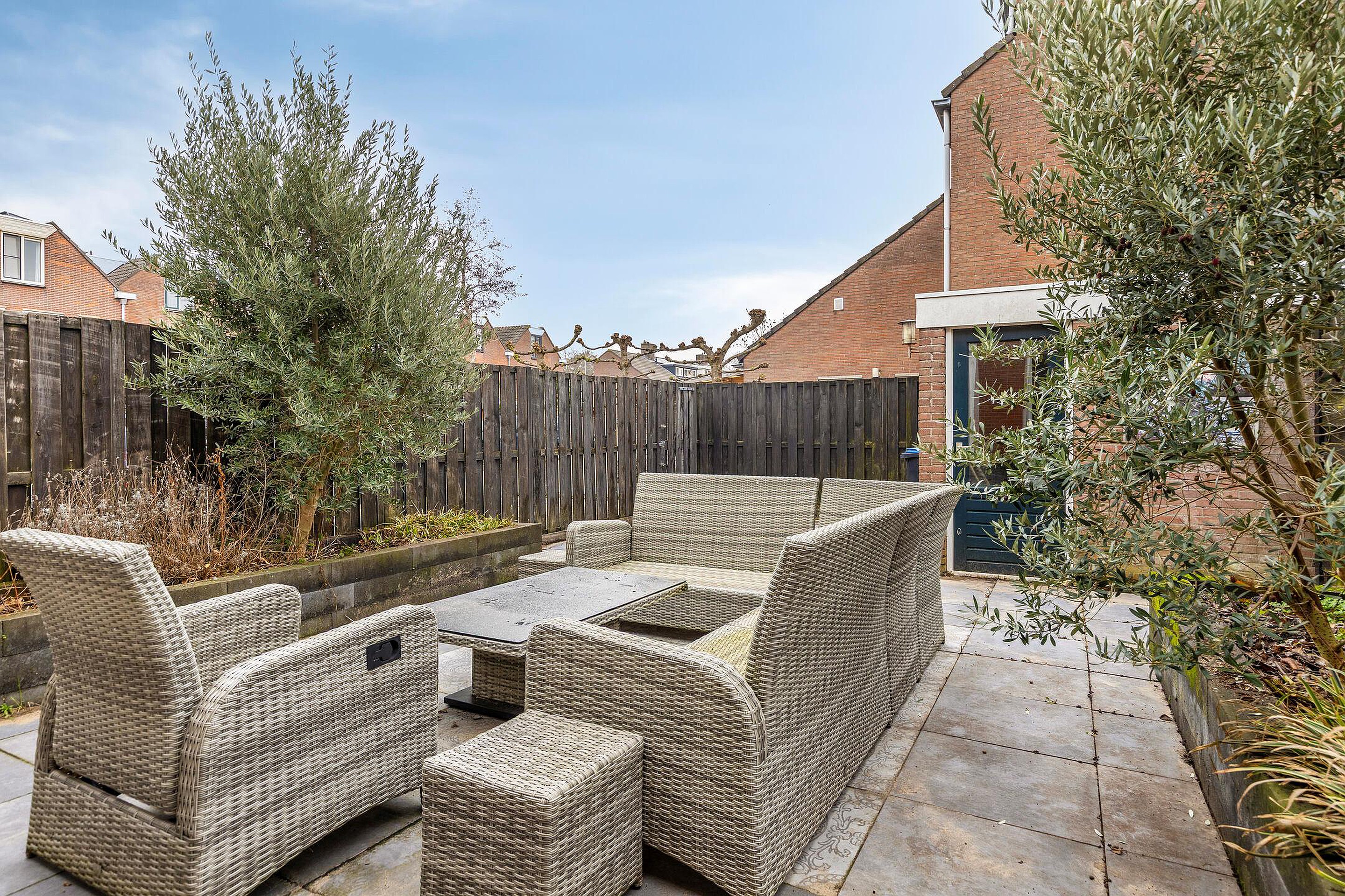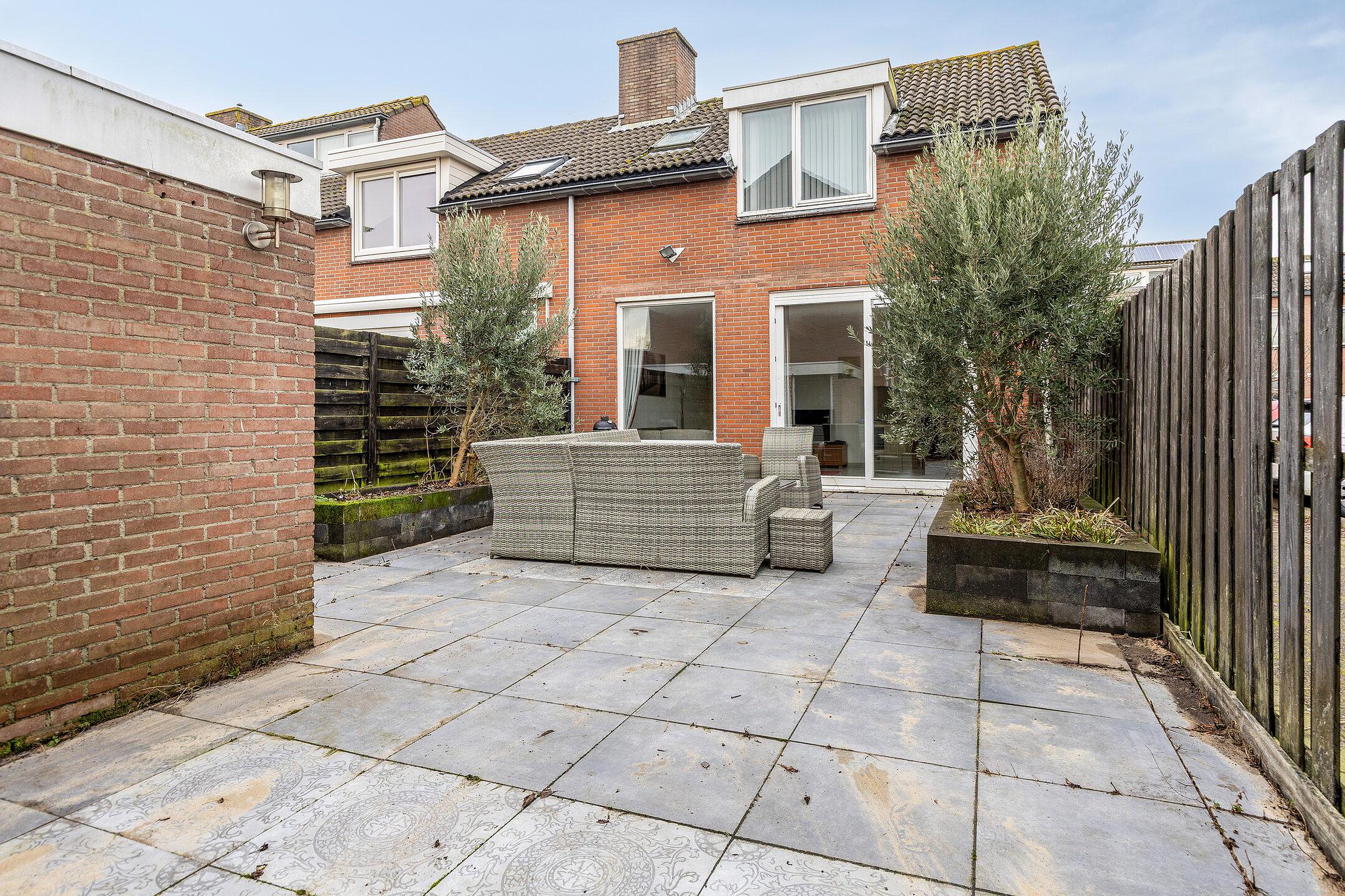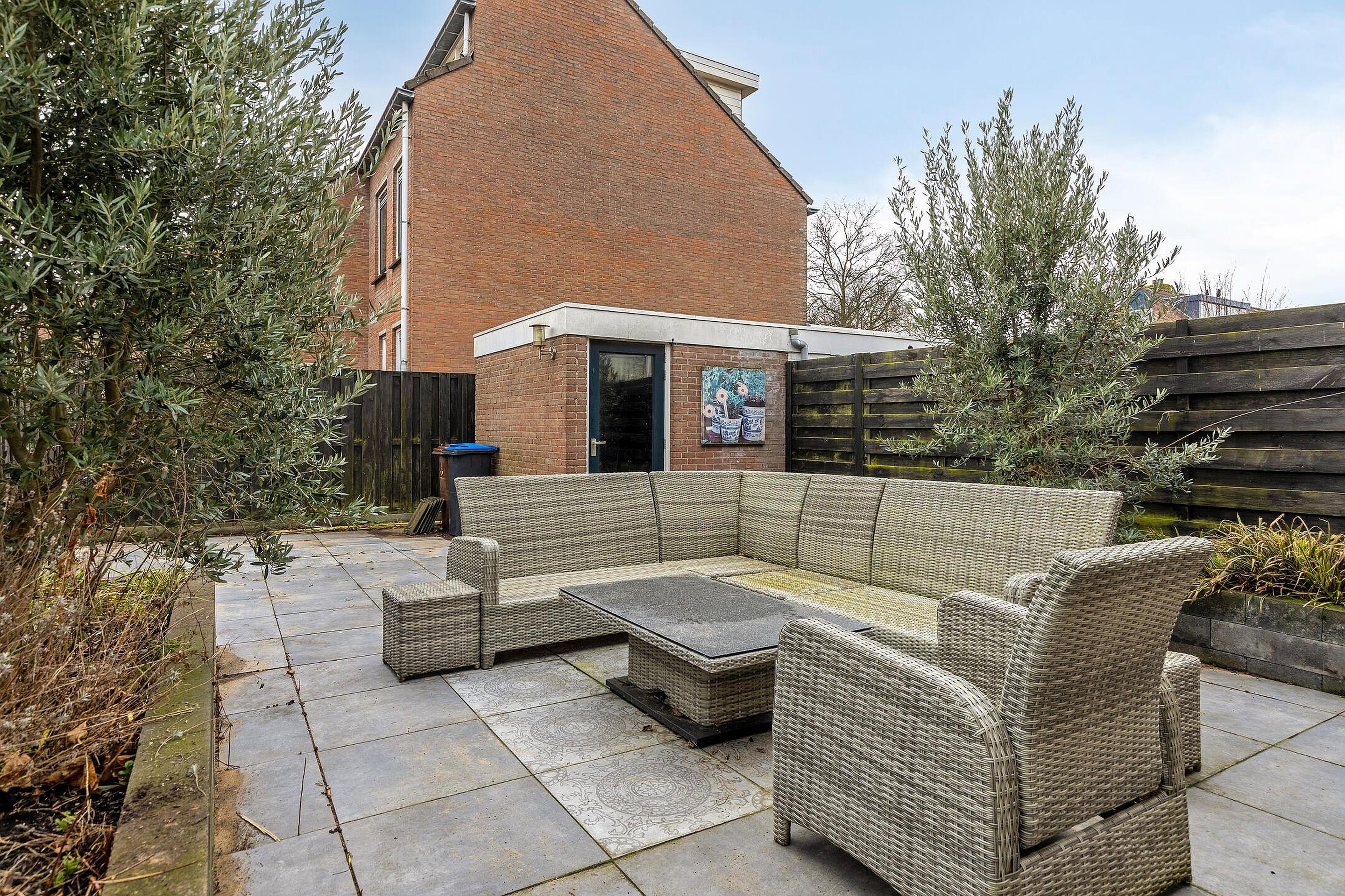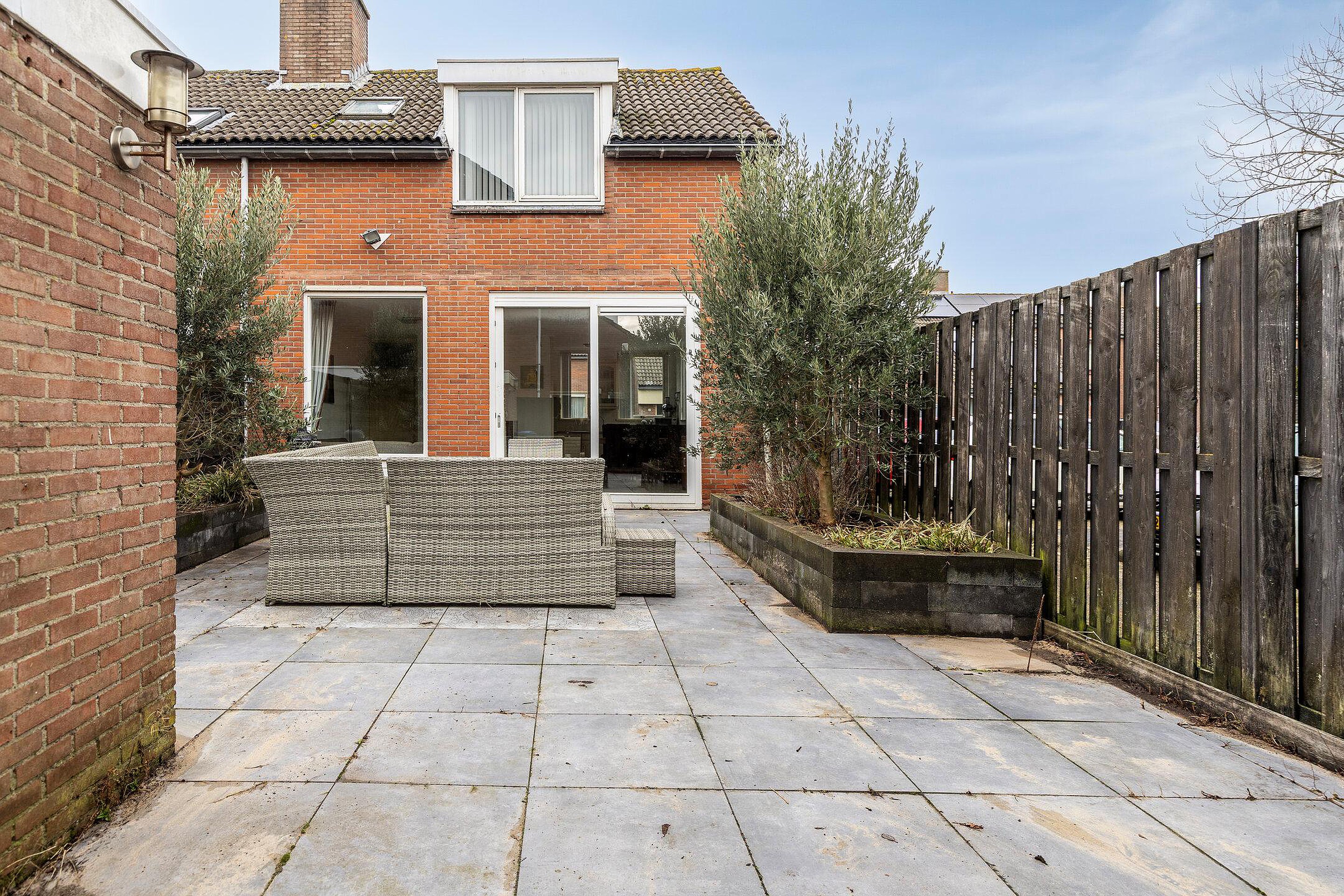 De achtertuin is grotendeels betegeld met diverse plantenperken en heeft een vrijstaande stenen berging met achterom.