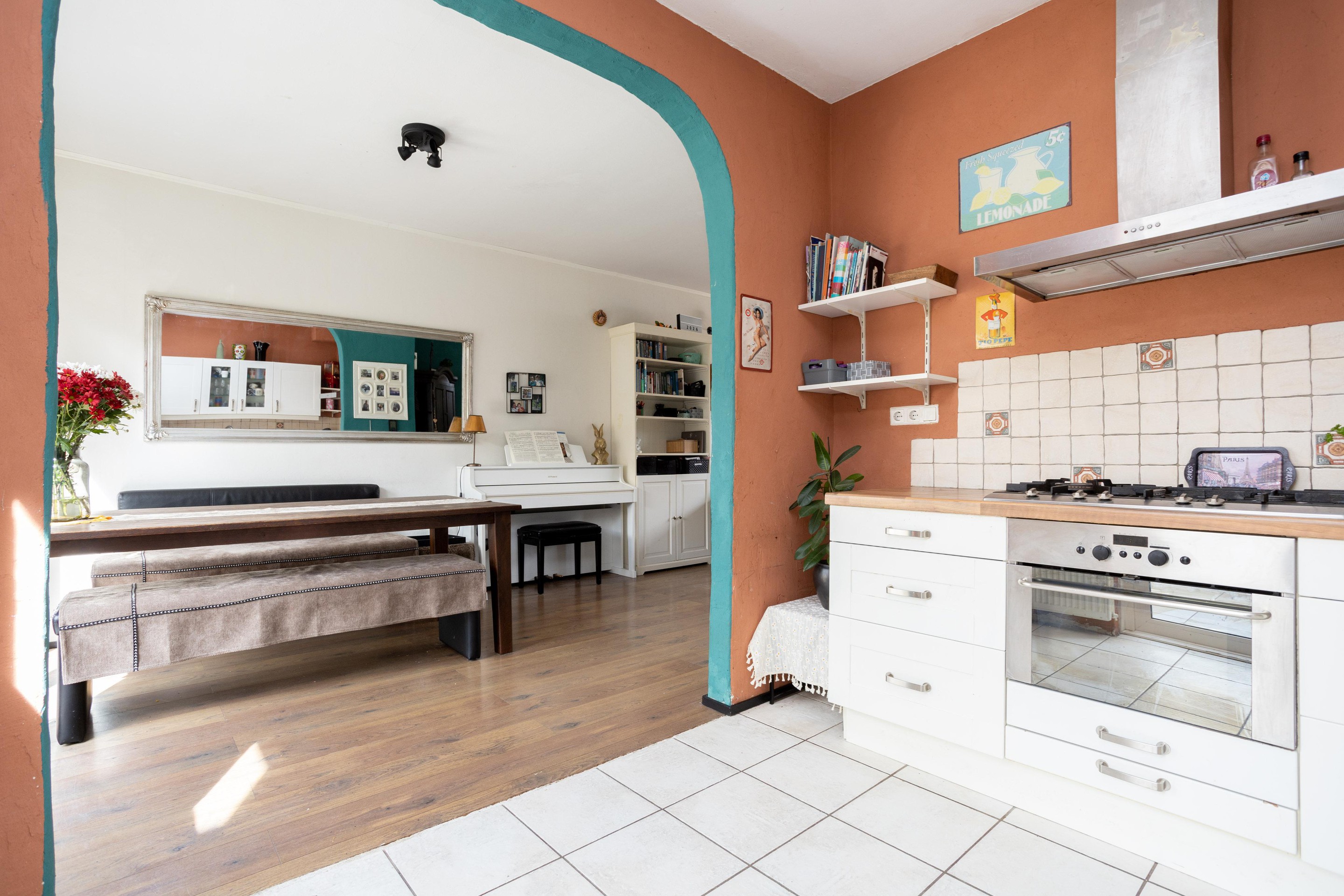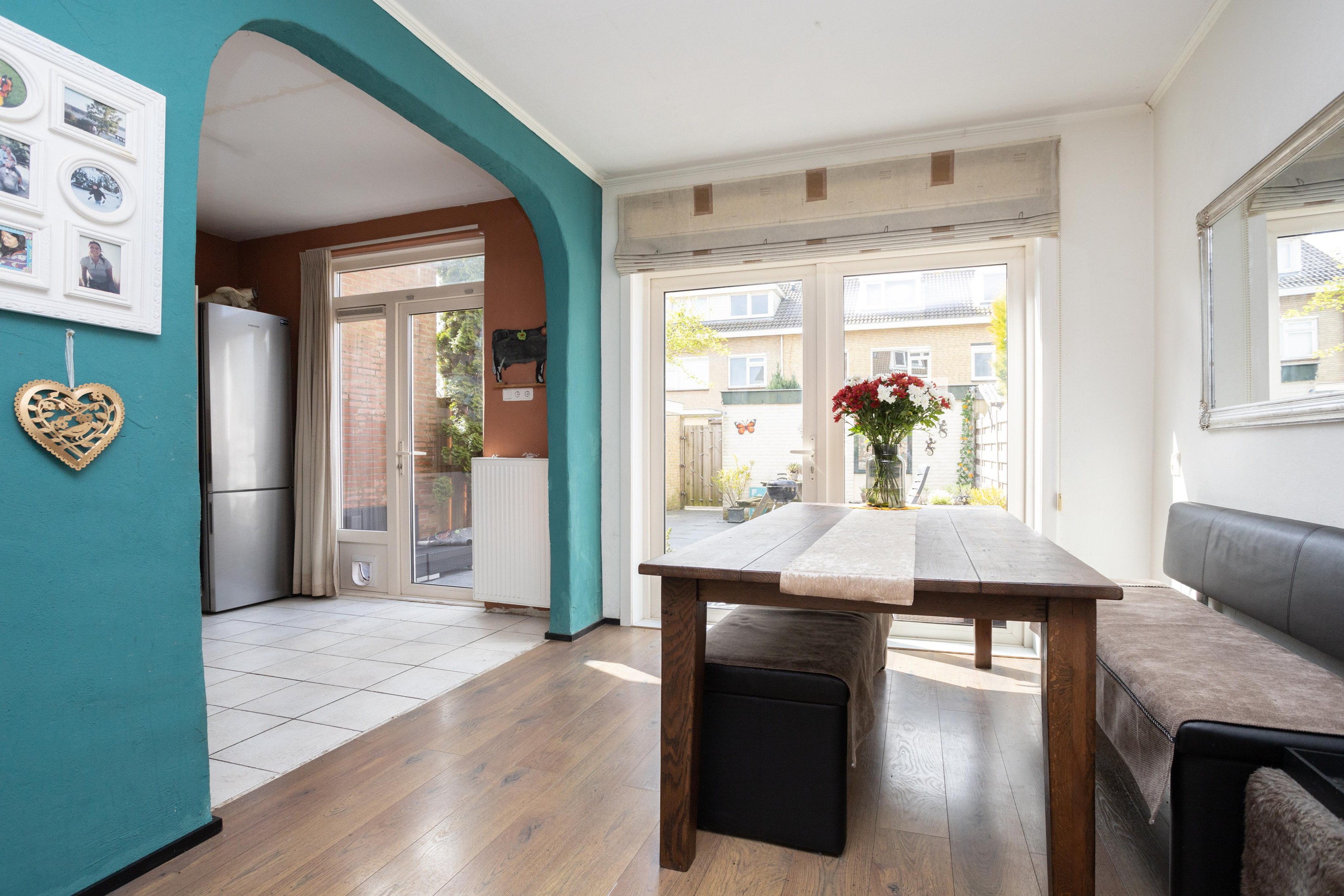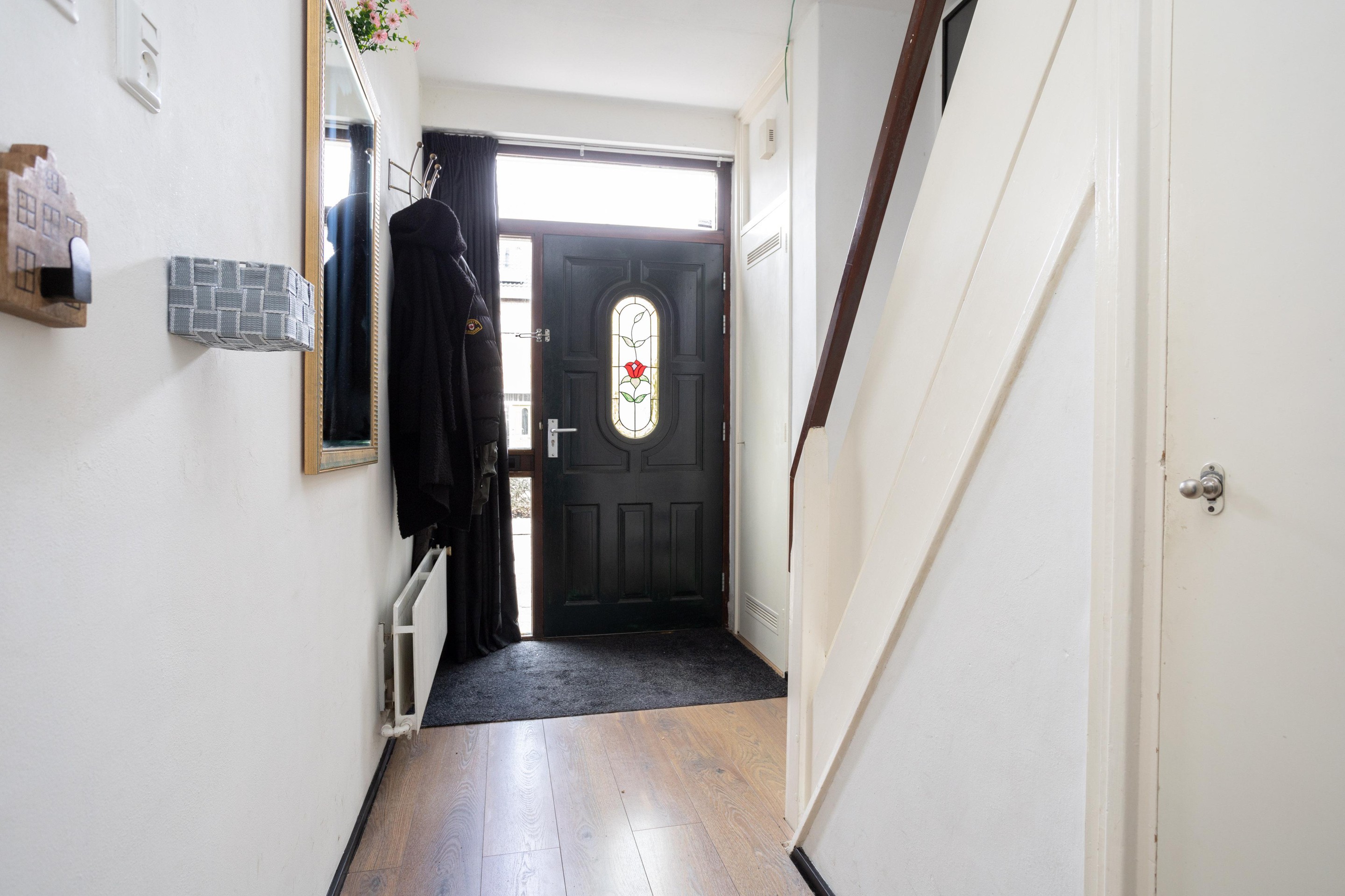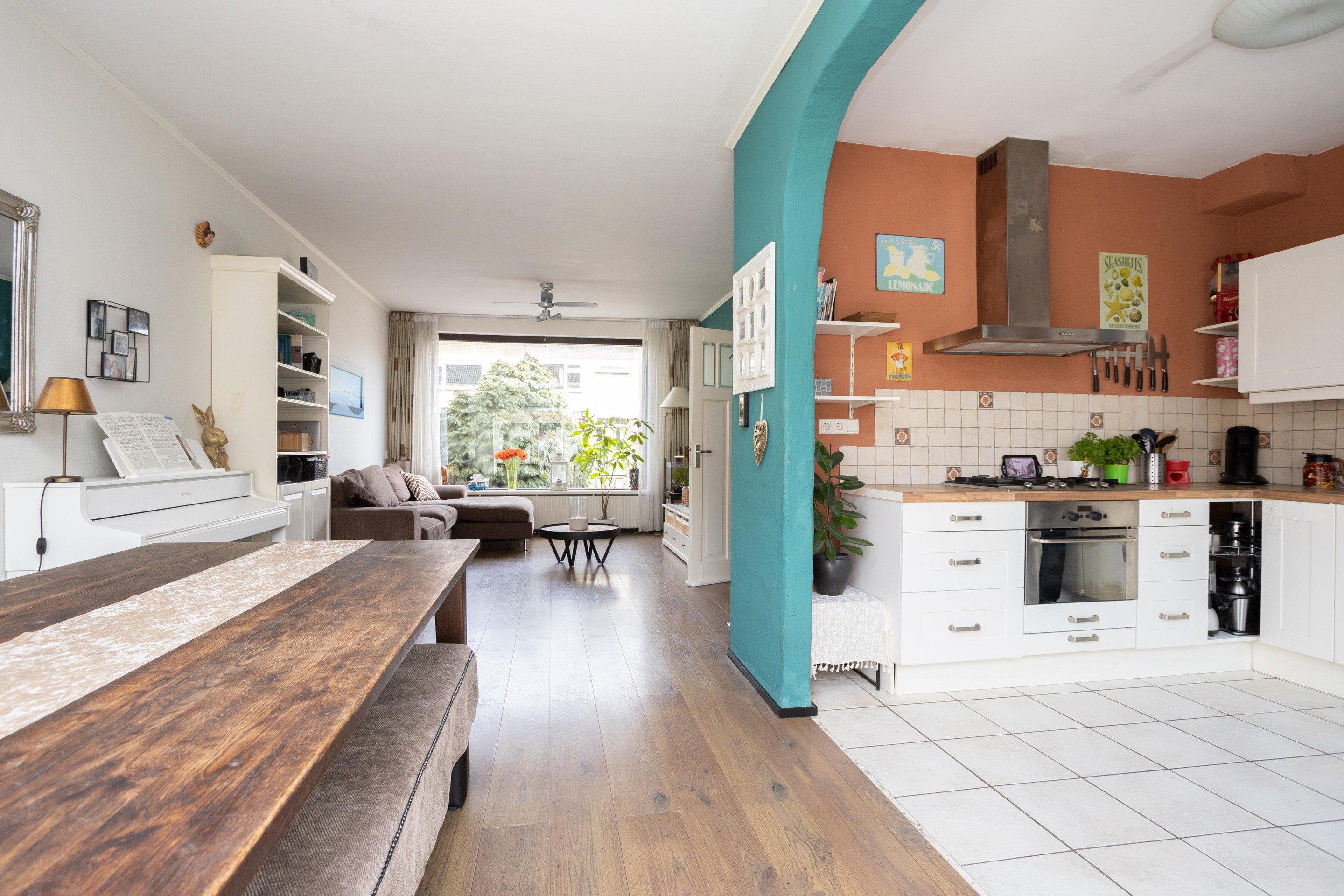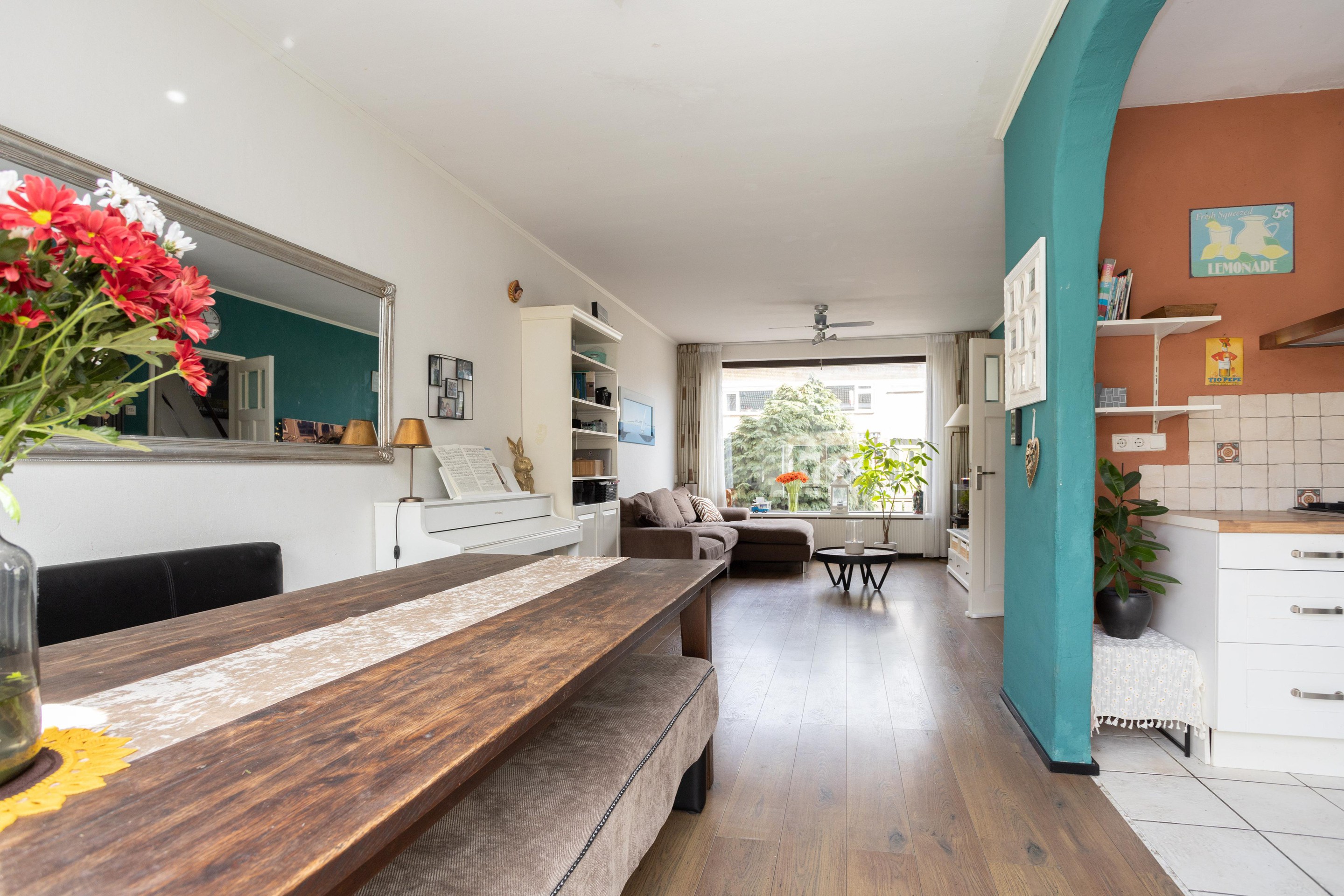 Entree woning: ruim entree met meterkast, trapkast, toilet met fonteintje en toegang tot de ruime en lichte woonkamer; bij binnenkomst vallen direct de grote ramen; heerlijk al dat licht! Op de vloer ligt laminaat. De open keuken is aan de achterzijde van de woning gelegen.