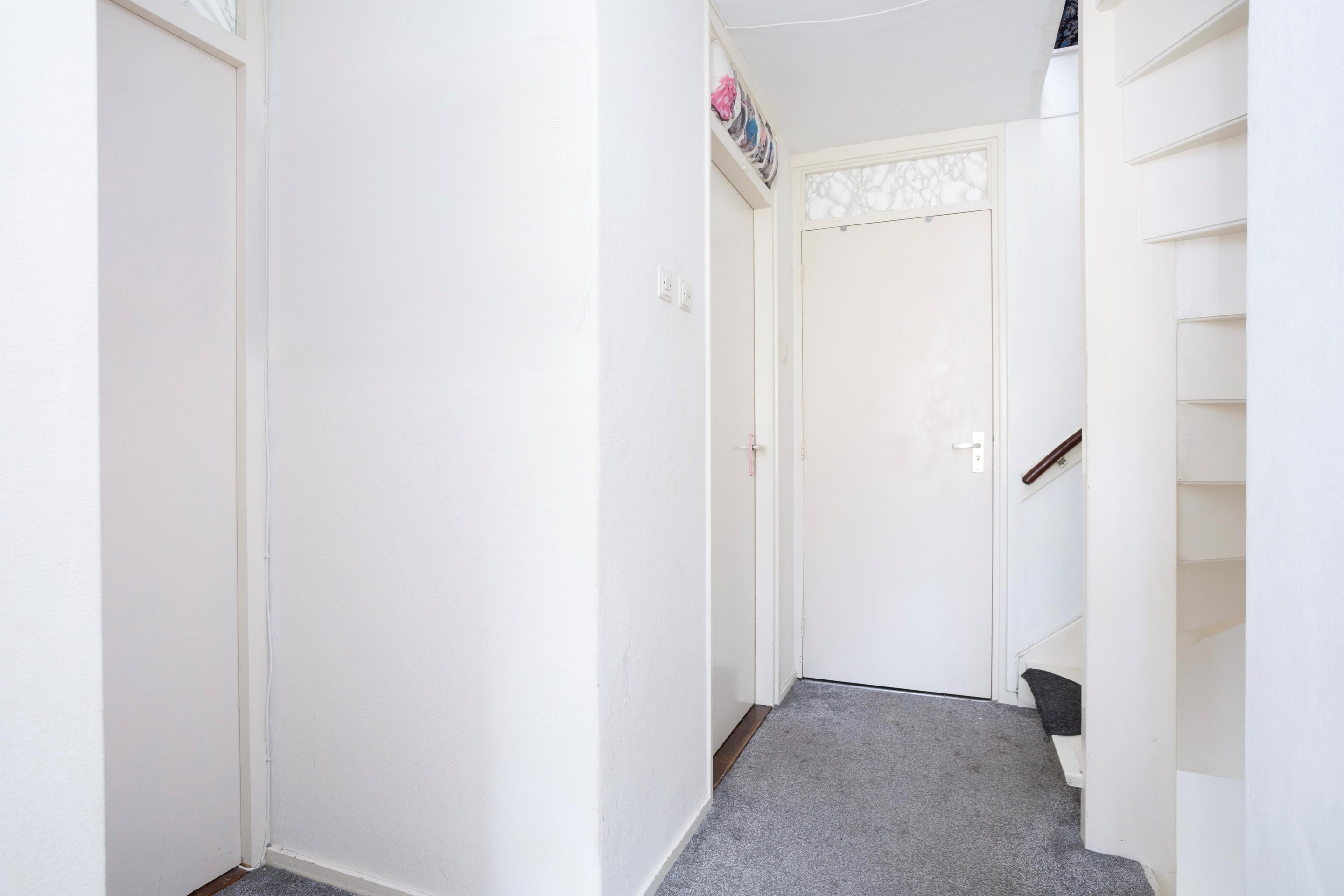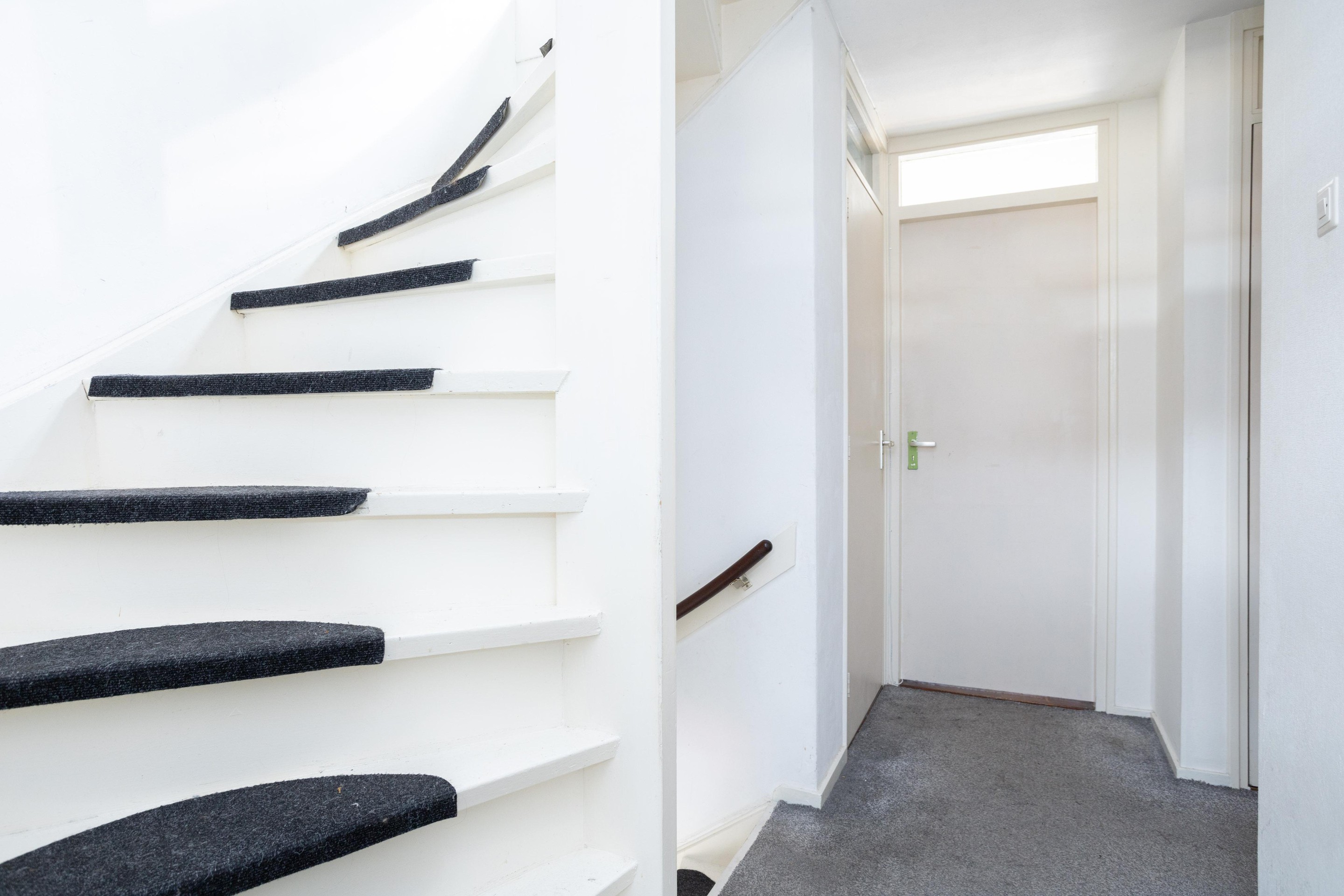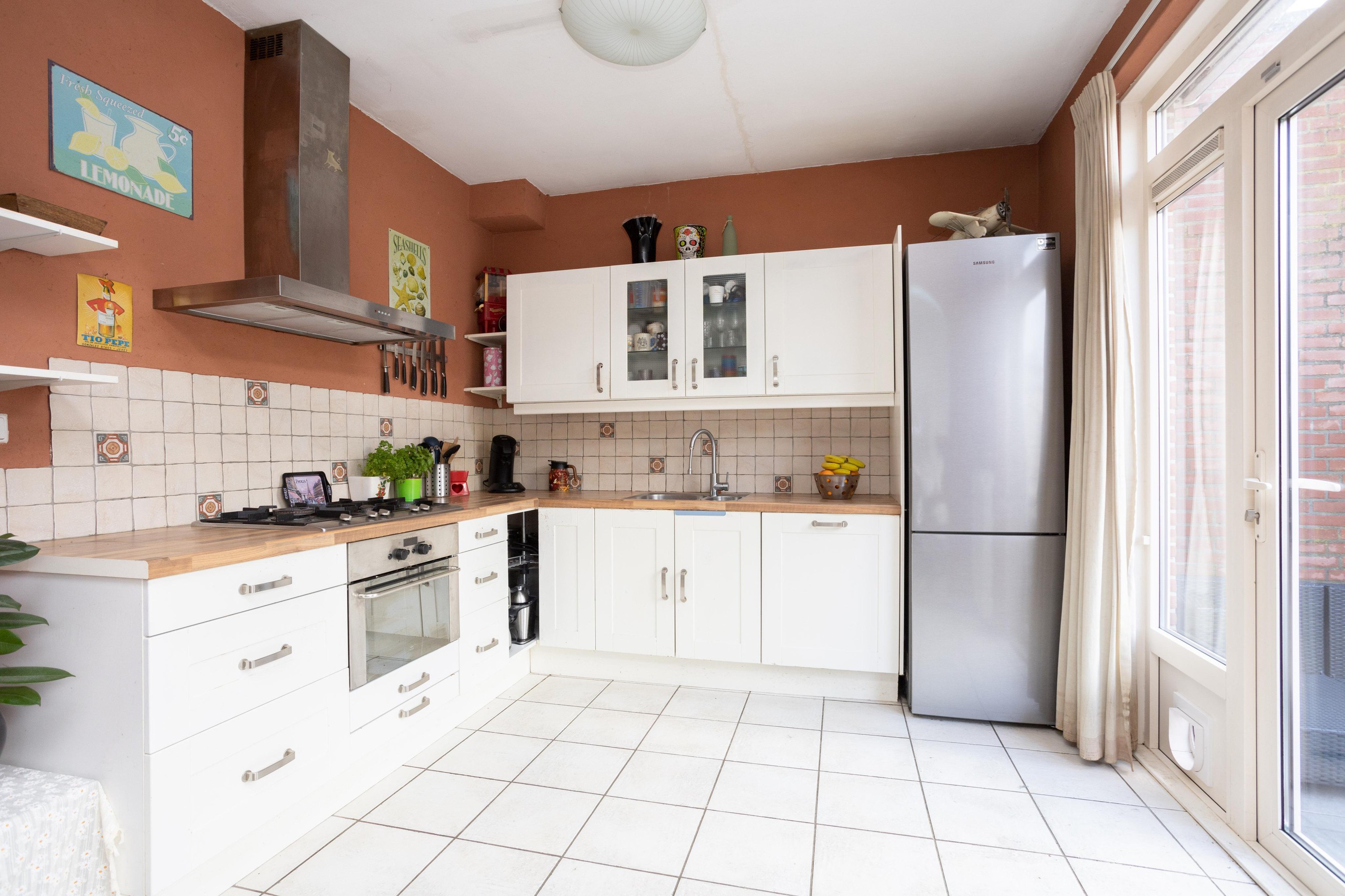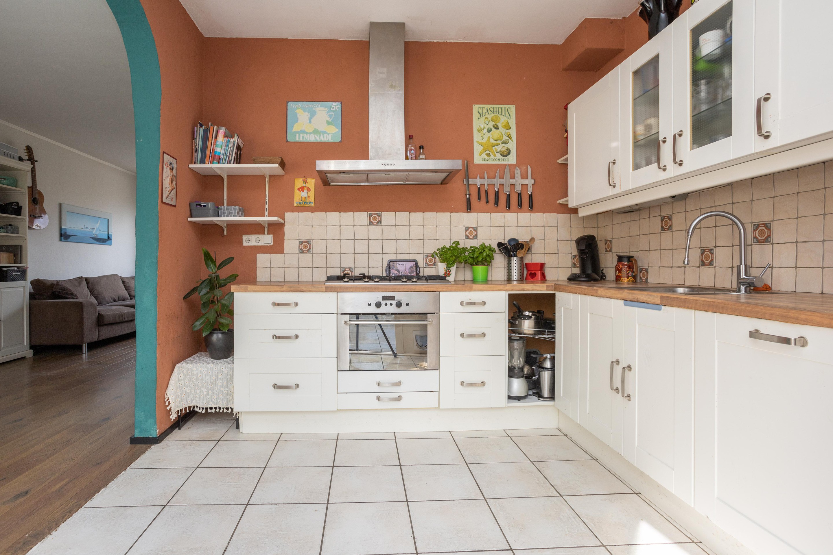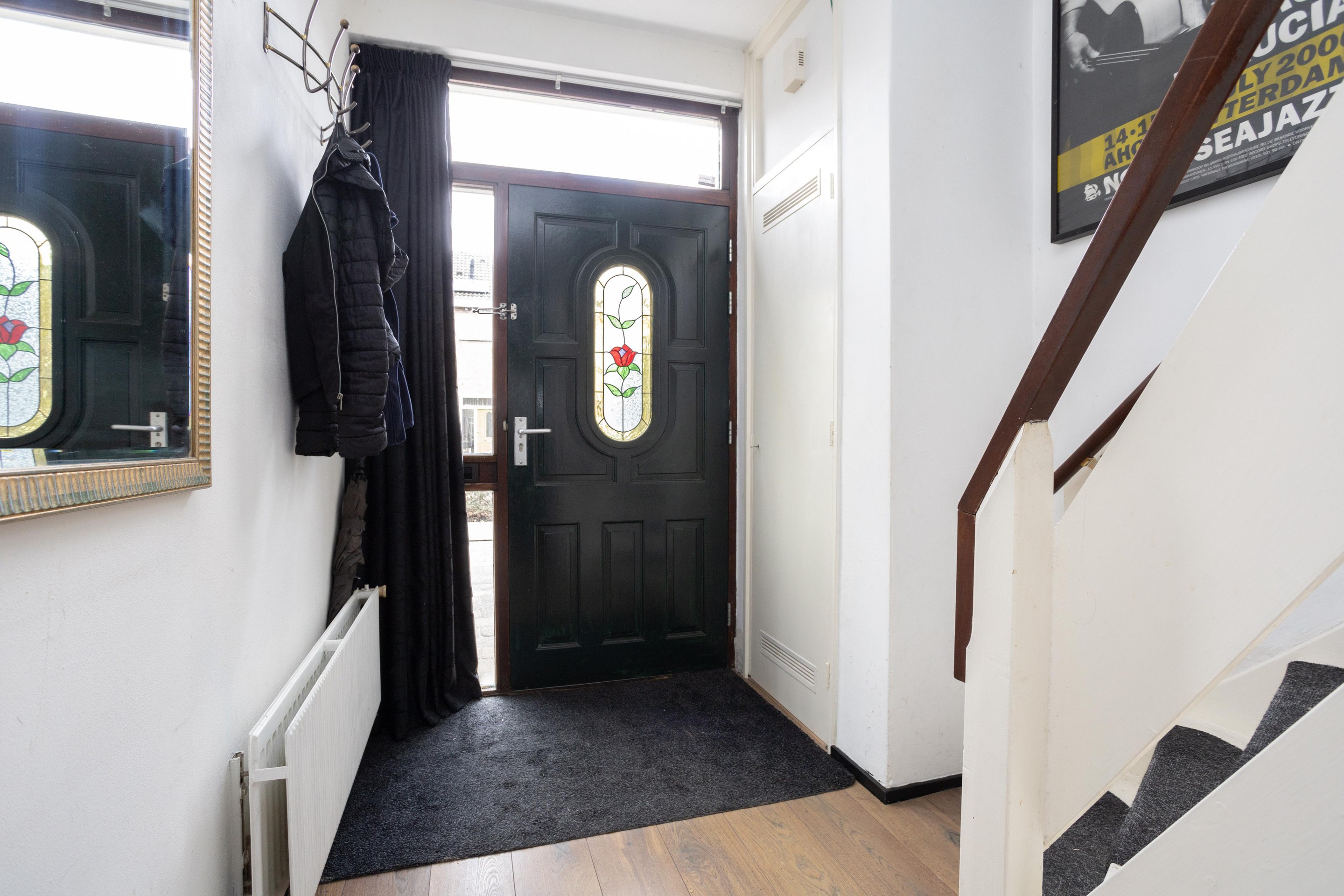 Entree woning: ruim entree met meterkast, trapkast, toilet met fonteintje en toegang tot de ruime en lichte woonkamer; bij binnenkomst vallen direct de grote ramen; heerlijk al dat licht! Op de vloer ligt laminaat. De open keuken is aan de achterzijde van de woning gelegen.