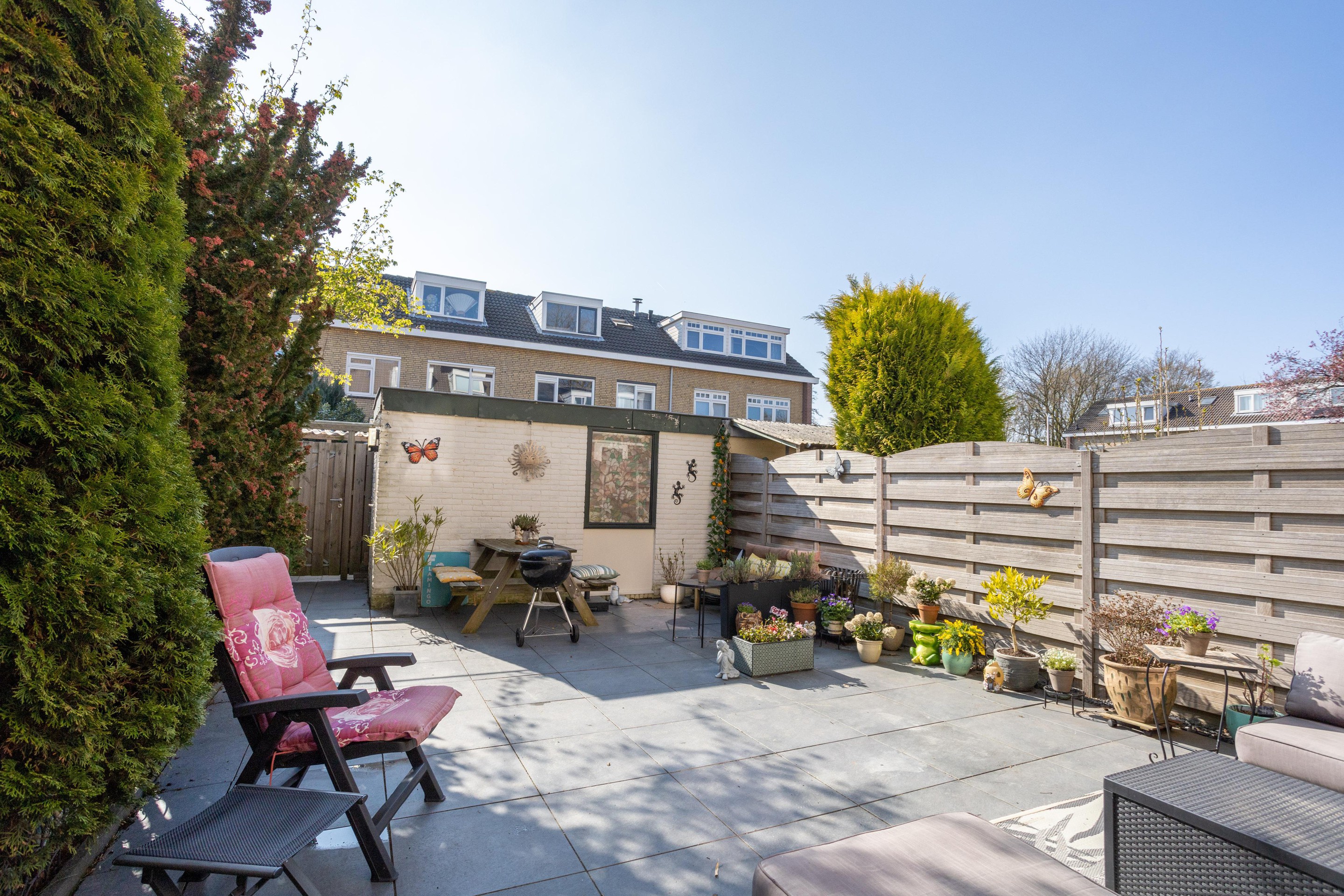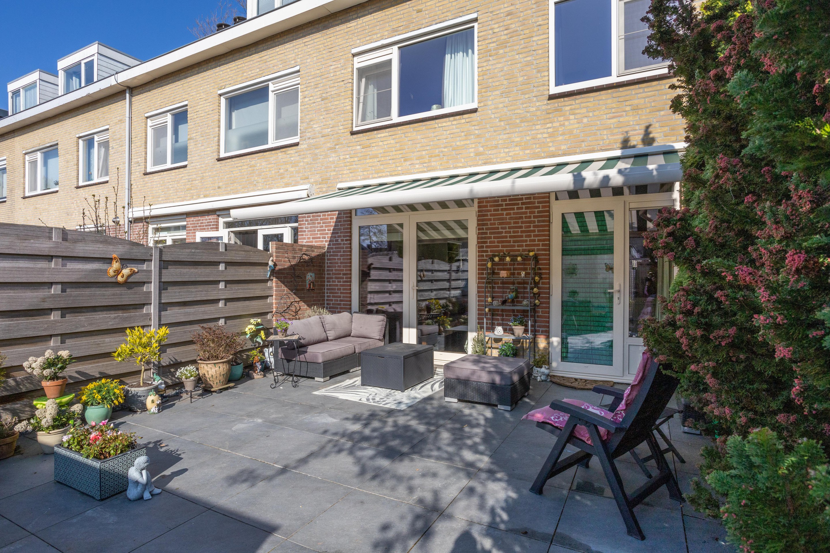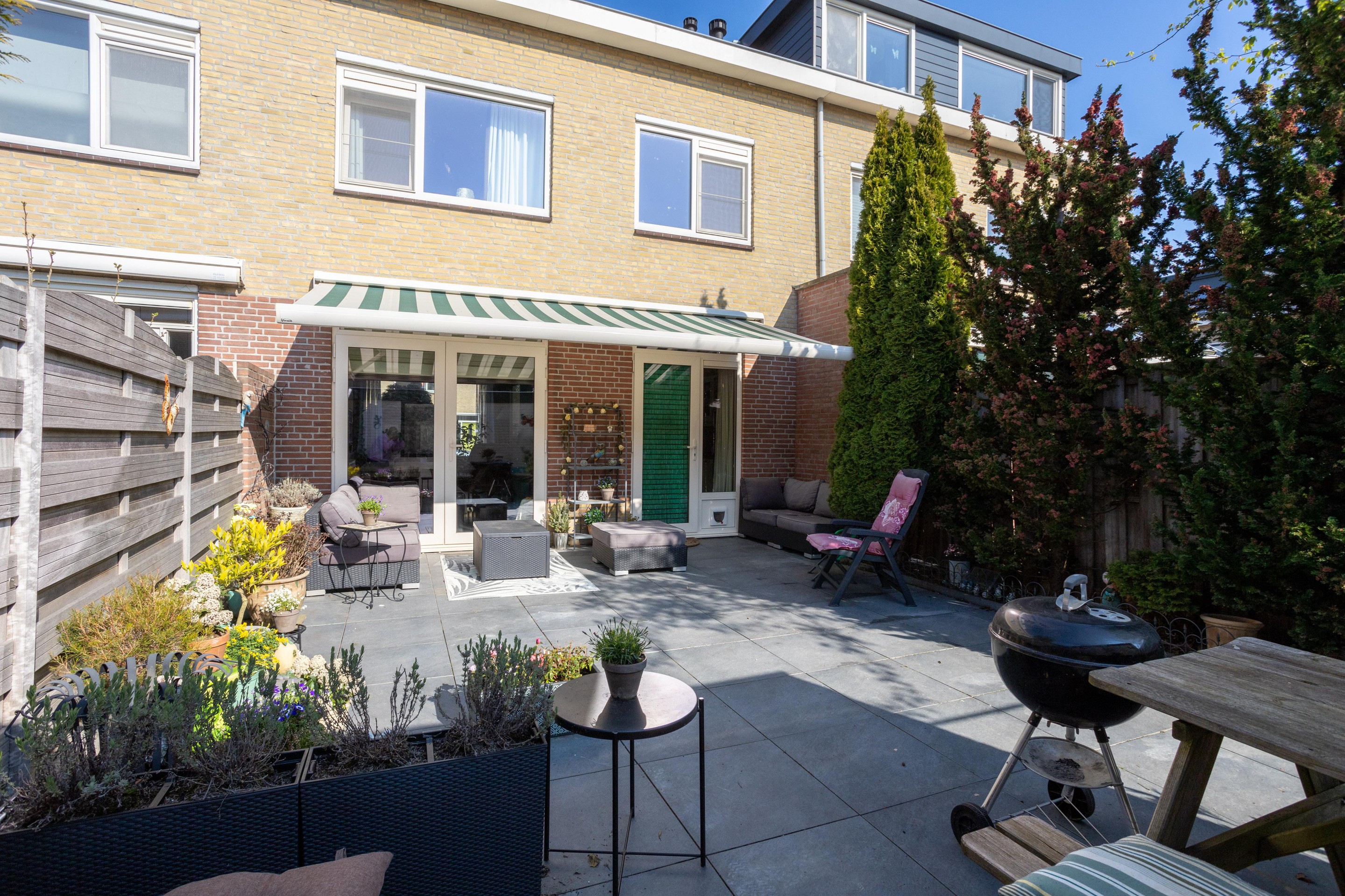 De achtertuin is zowel vanuit de woning als achterom te bereiken. De tuin is gelegen op het zonnige zuidwesten en is voorzien van een stenen berging. Ook fijn dat er een zonnescherm aanwezig is.