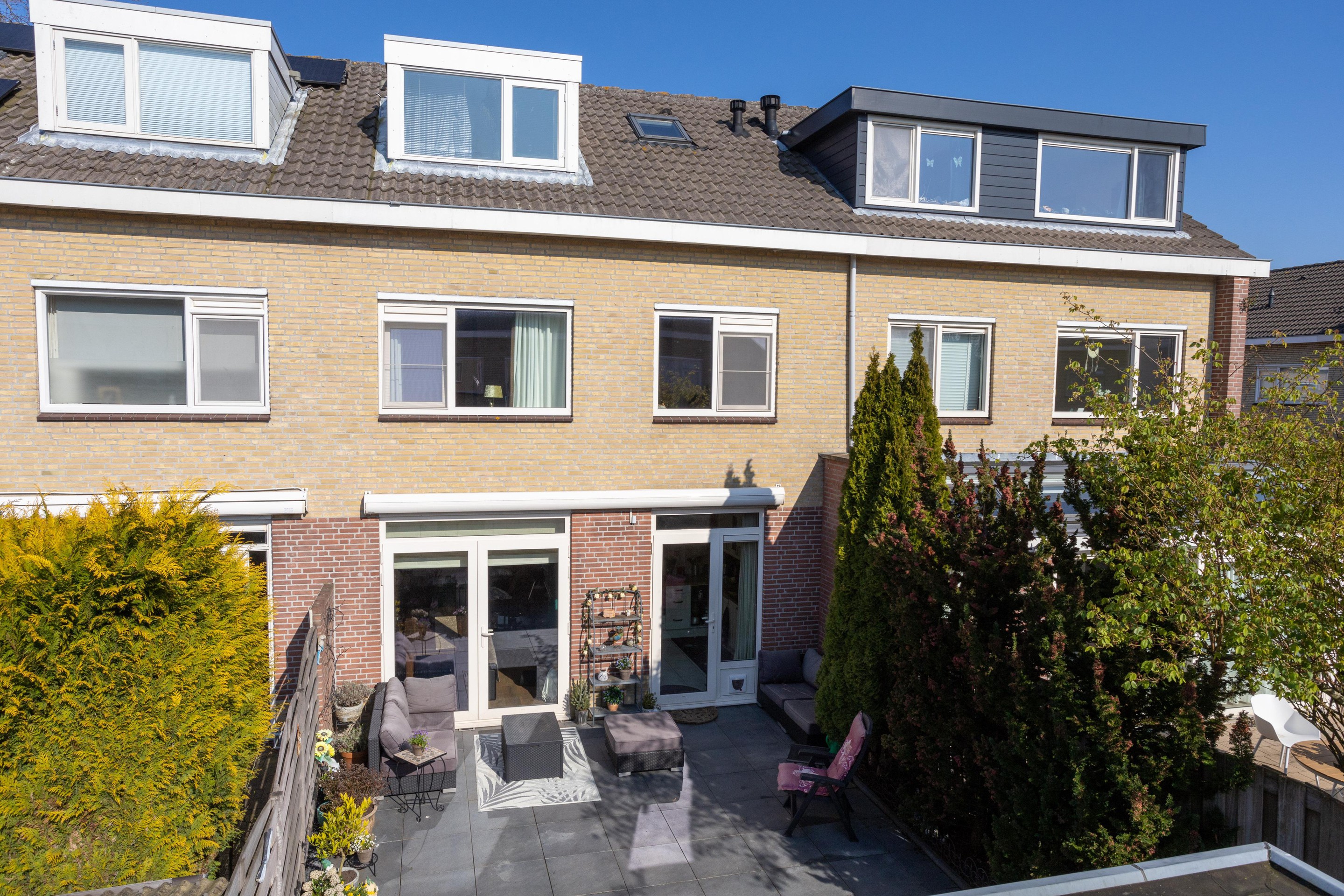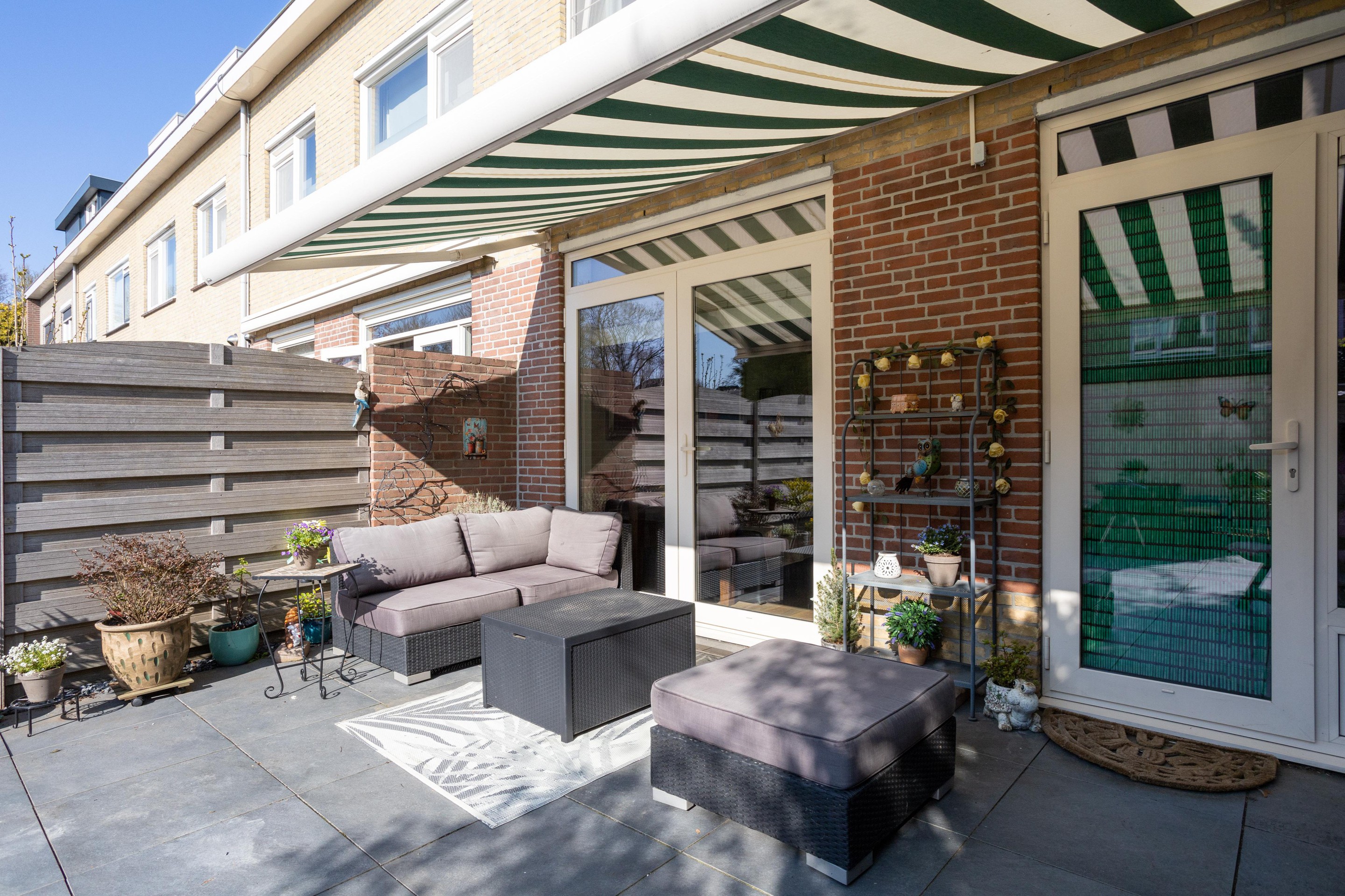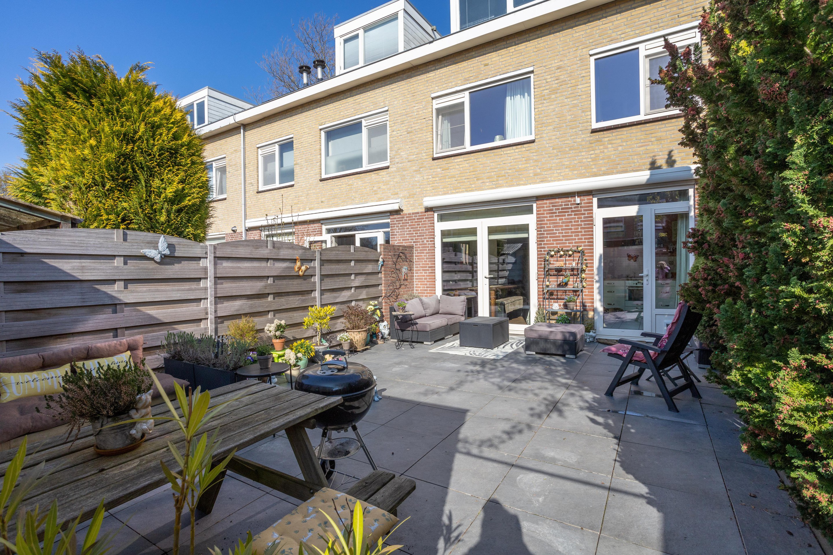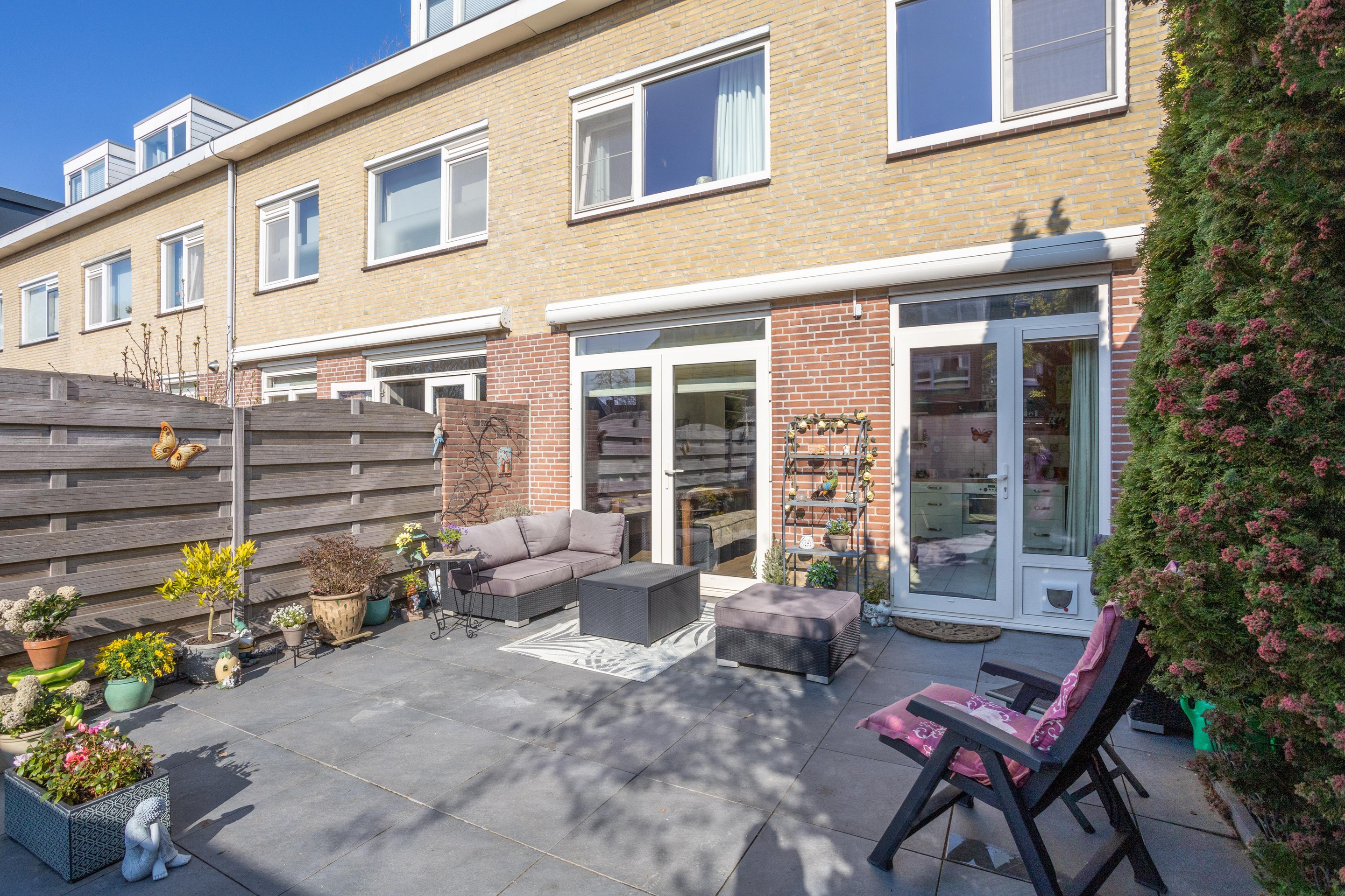 De achtertuin is zowel vanuit de woning als achterom te bereiken. De tuin is gelegen op het zonnige zuidwesten en is voorzien van een stenen berging. Ook fijn dat er een zonnescherm aanwezig is.
