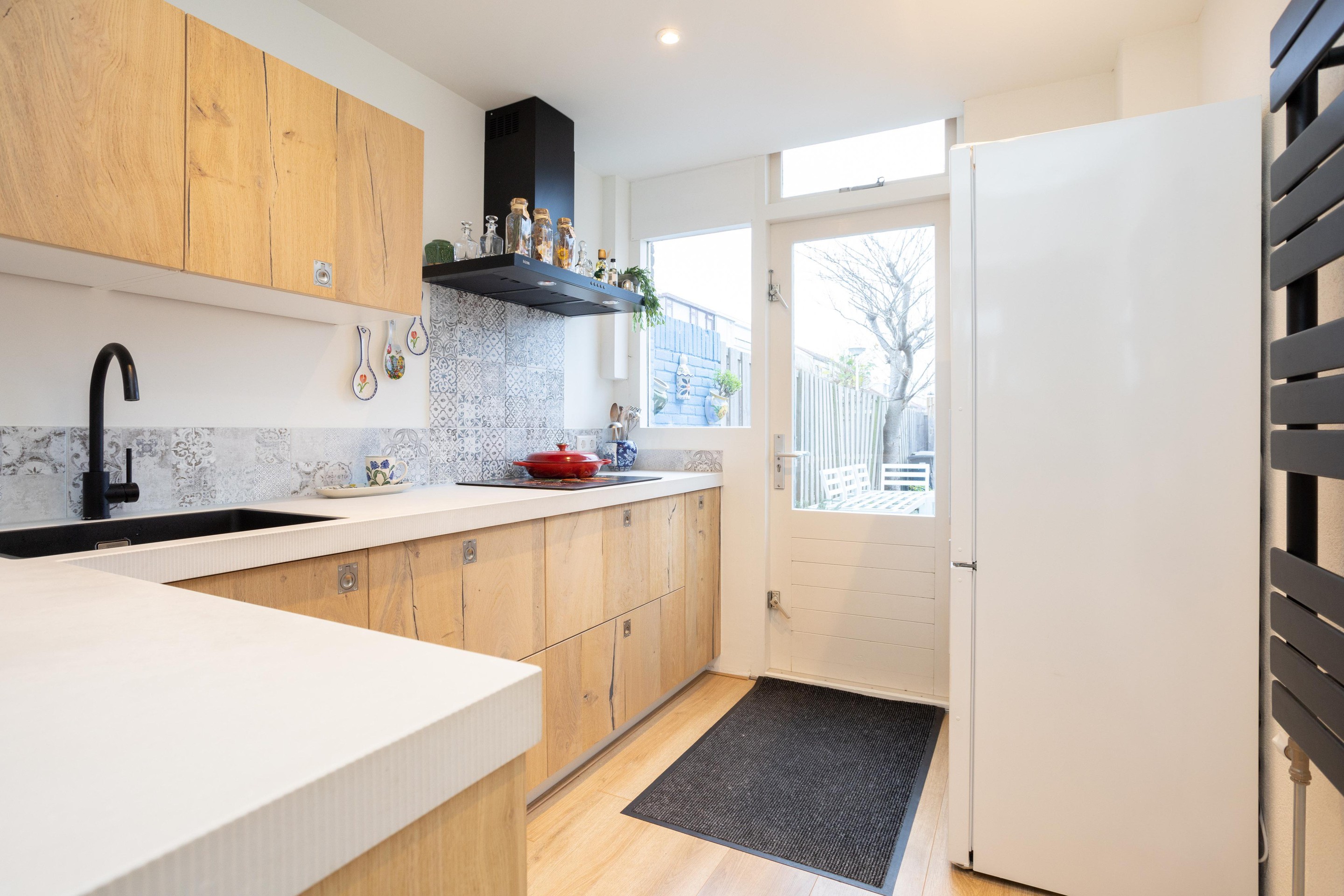 Entree, hal met nieuwe meterkast (2023), nieuw toilet (2023) en trapopgang naar de eerste verdieping. Toegang tot de gezellige doorzon woonkamer, wat direct opvalt zijn de grote ramen, heerlijk al dat licht. De luxe keuken (2023) is aan de achterzijde gelegen en is voorzien van een inductie kookplaat, afzuigkap, oven met magnetronfunctie, vrijstaande koelkast en veel kastruimte. De woning is aan de achterzijde op de begane grond over de gehele breedte voorzien van een zonnescherm.