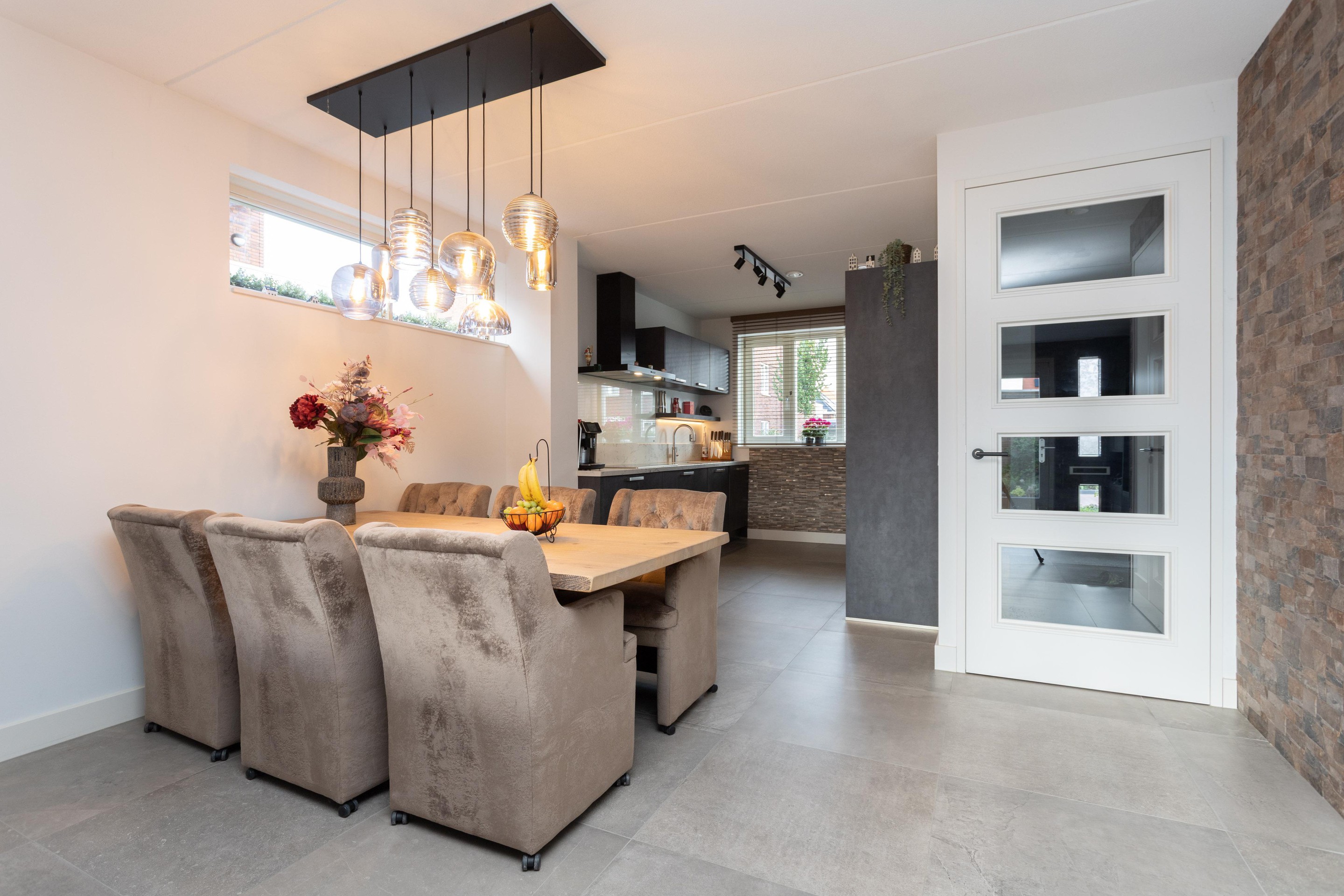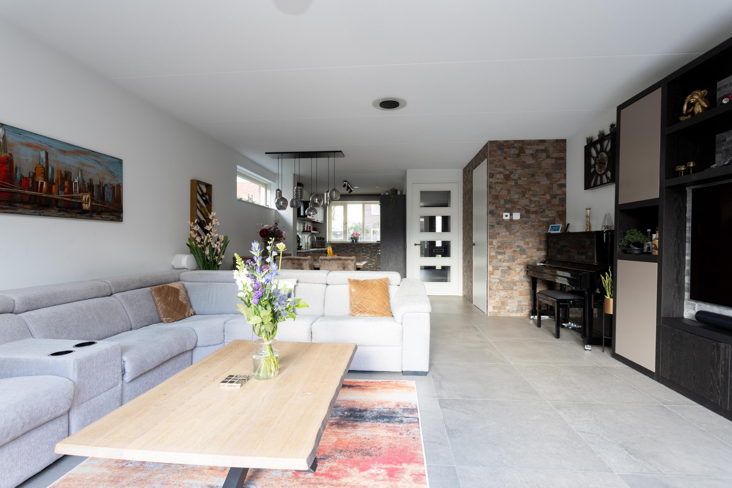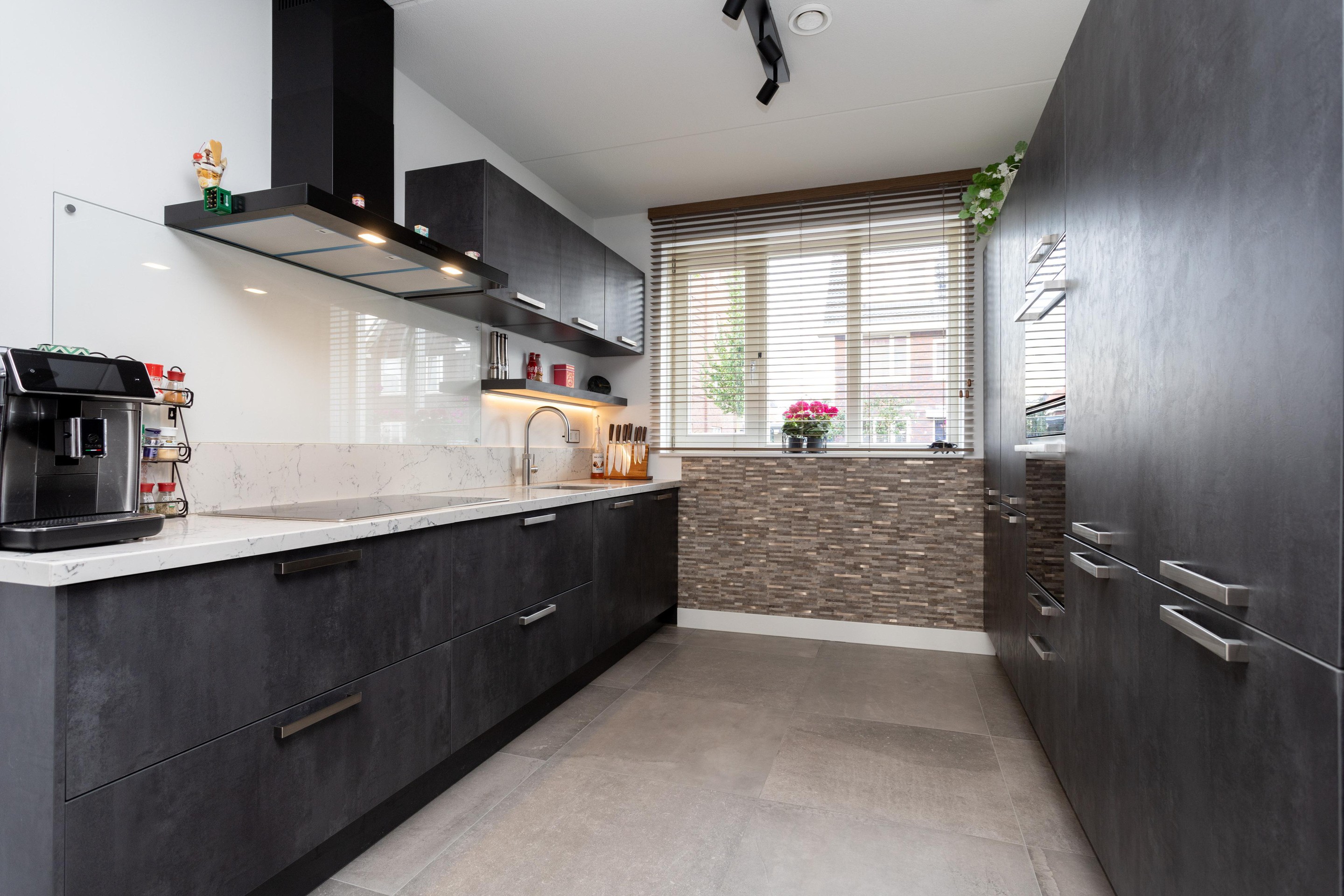 Entree woning, hal met uitgebreide meterkast en luxe toilet met fonteintje en toegang tot de royale living. Bij binnenkomst vallen direct de grote ramen op, heerlijk al dat licht. Op de vloer prachtige keramische tegels. Aan de voorzijde is de luxe open keuken, het ontbreekt u hier aan helemaal niets. Quooker, combi-oven, koelkast vriezer, vaatwasser en een inductie kookplaat.