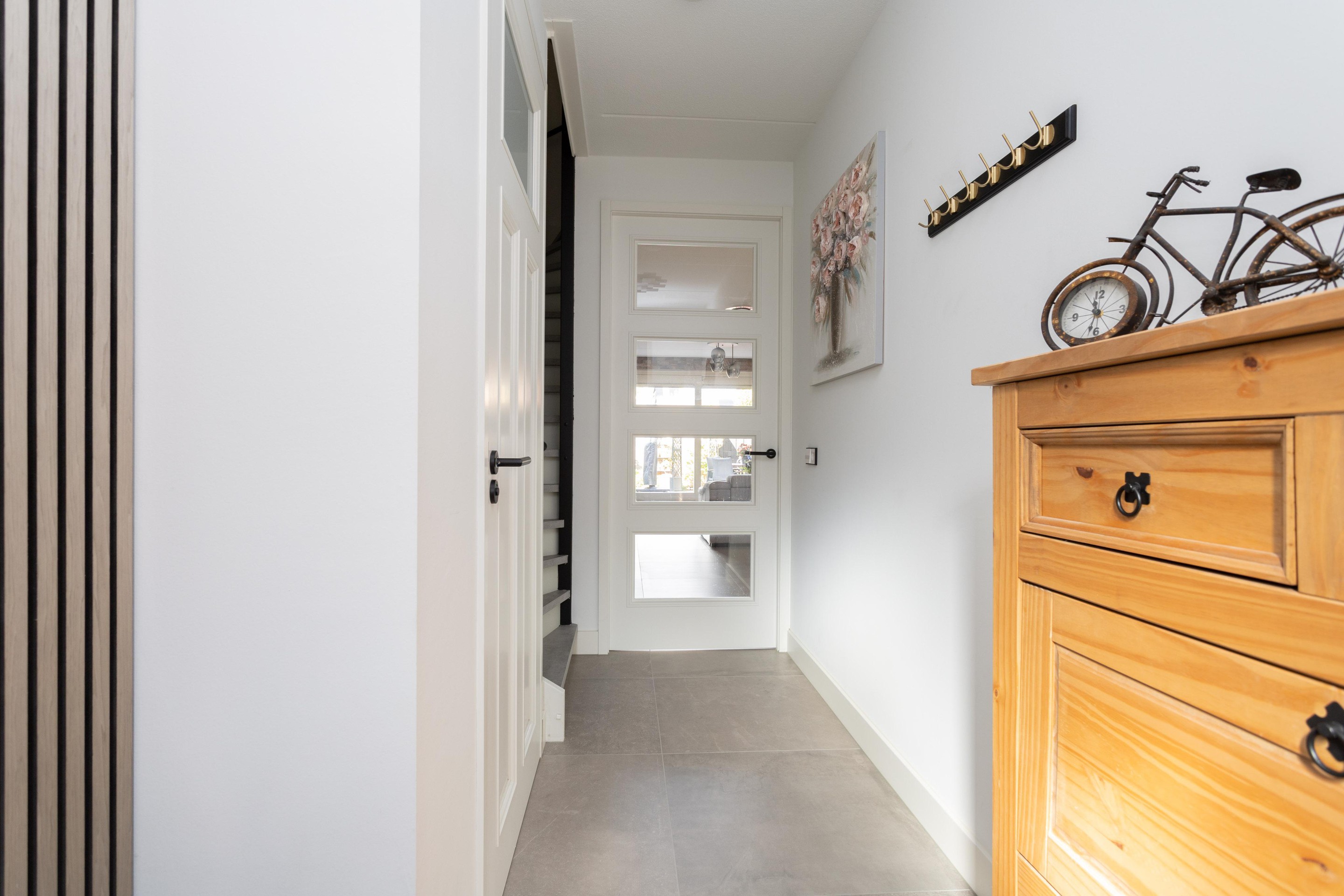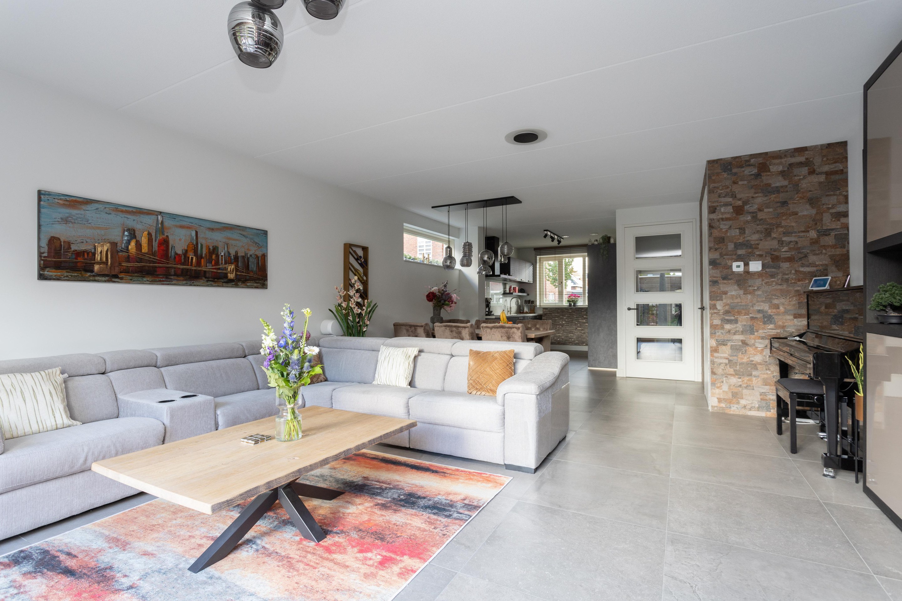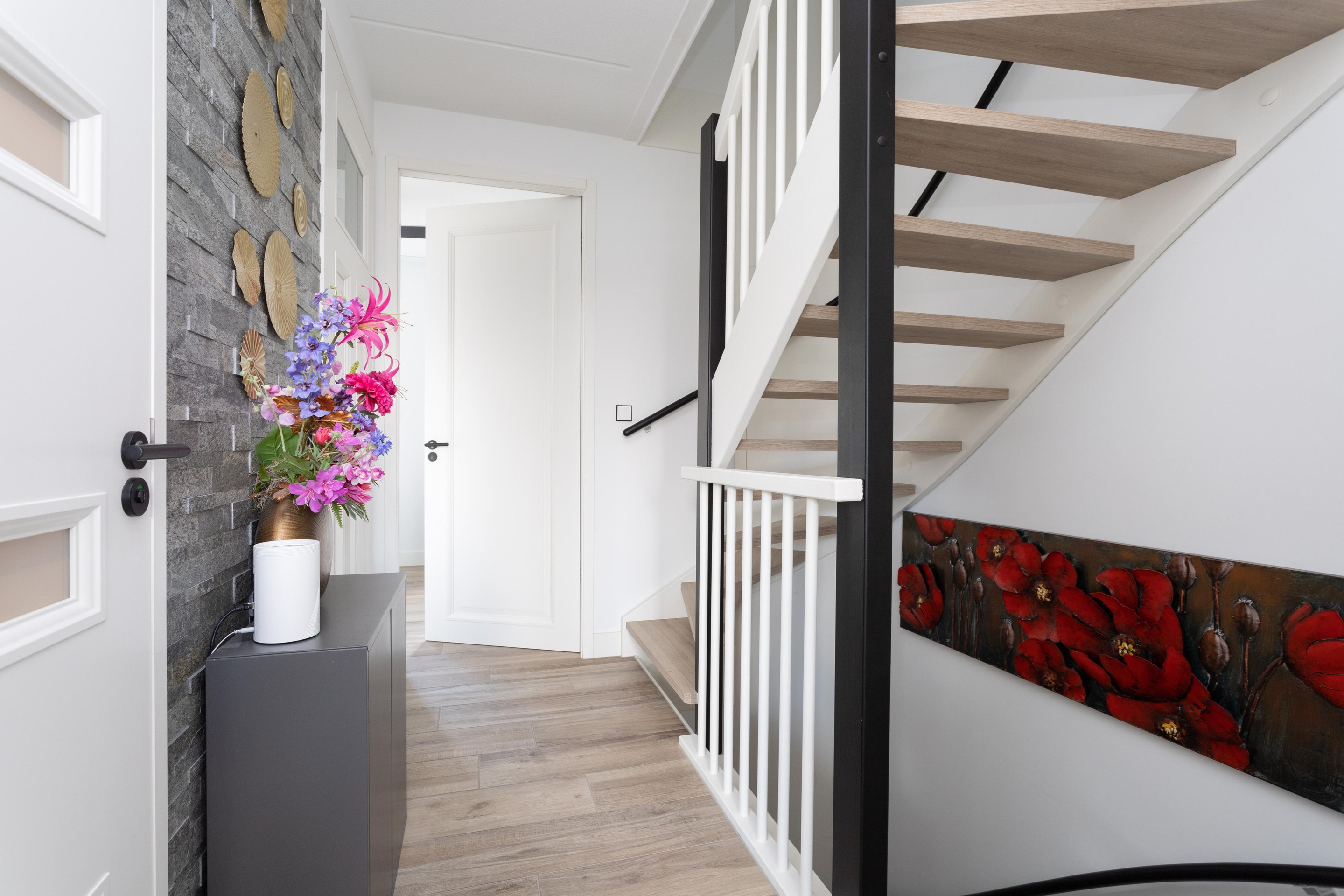 Entree woning, hal met uitgebreide meterkast en luxe toilet met fonteintje en toegang tot de royale living. Bij binnenkomst vallen direct de grote ramen op, heerlijk al dat licht. Op de vloer prachtige keramische tegels. Aan de voorzijde is de luxe open keuken, het ontbreekt u hier aan helemaal niets. Quooker, combi-oven, koelkast vriezer, vaatwasser en een inductie kookplaat.