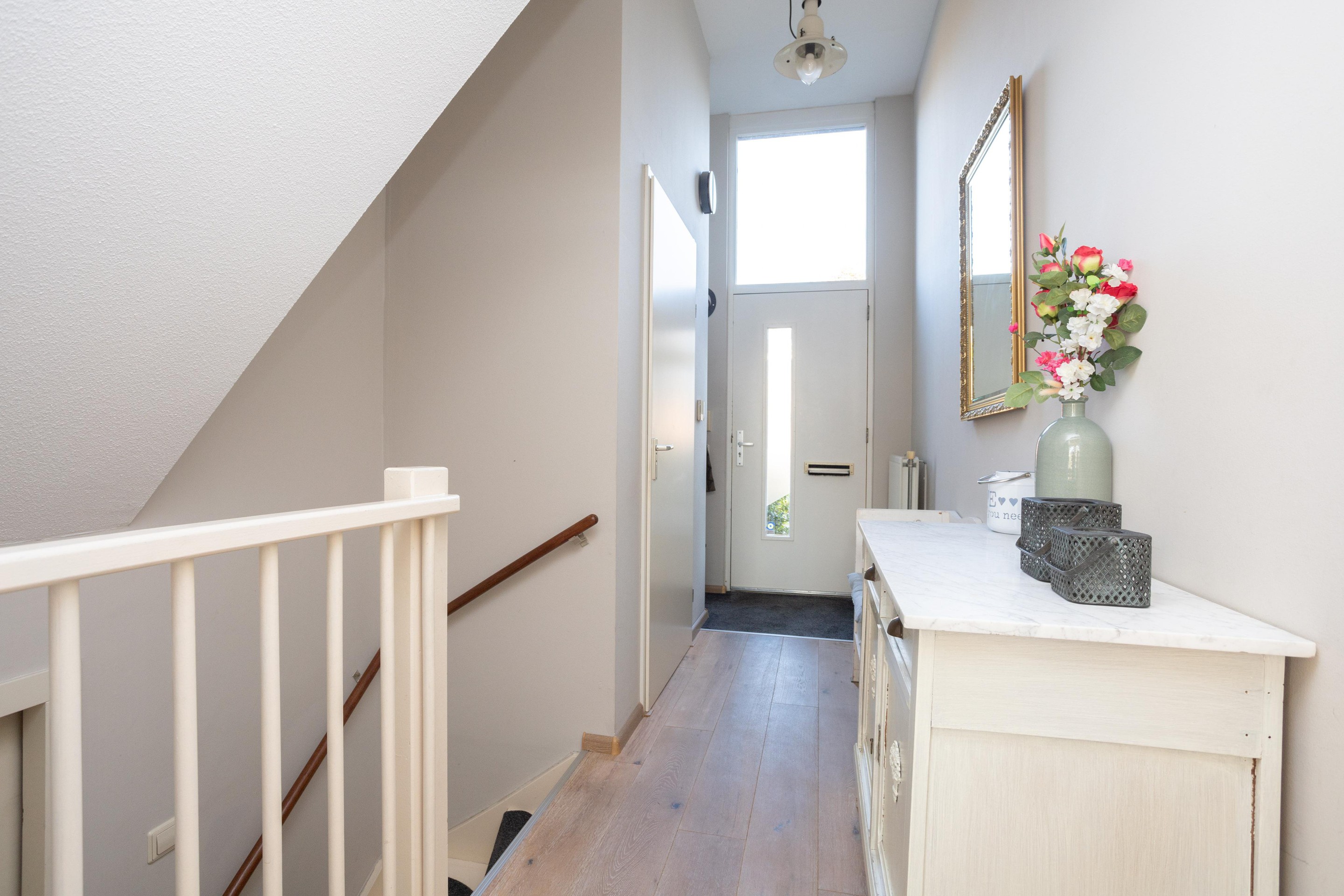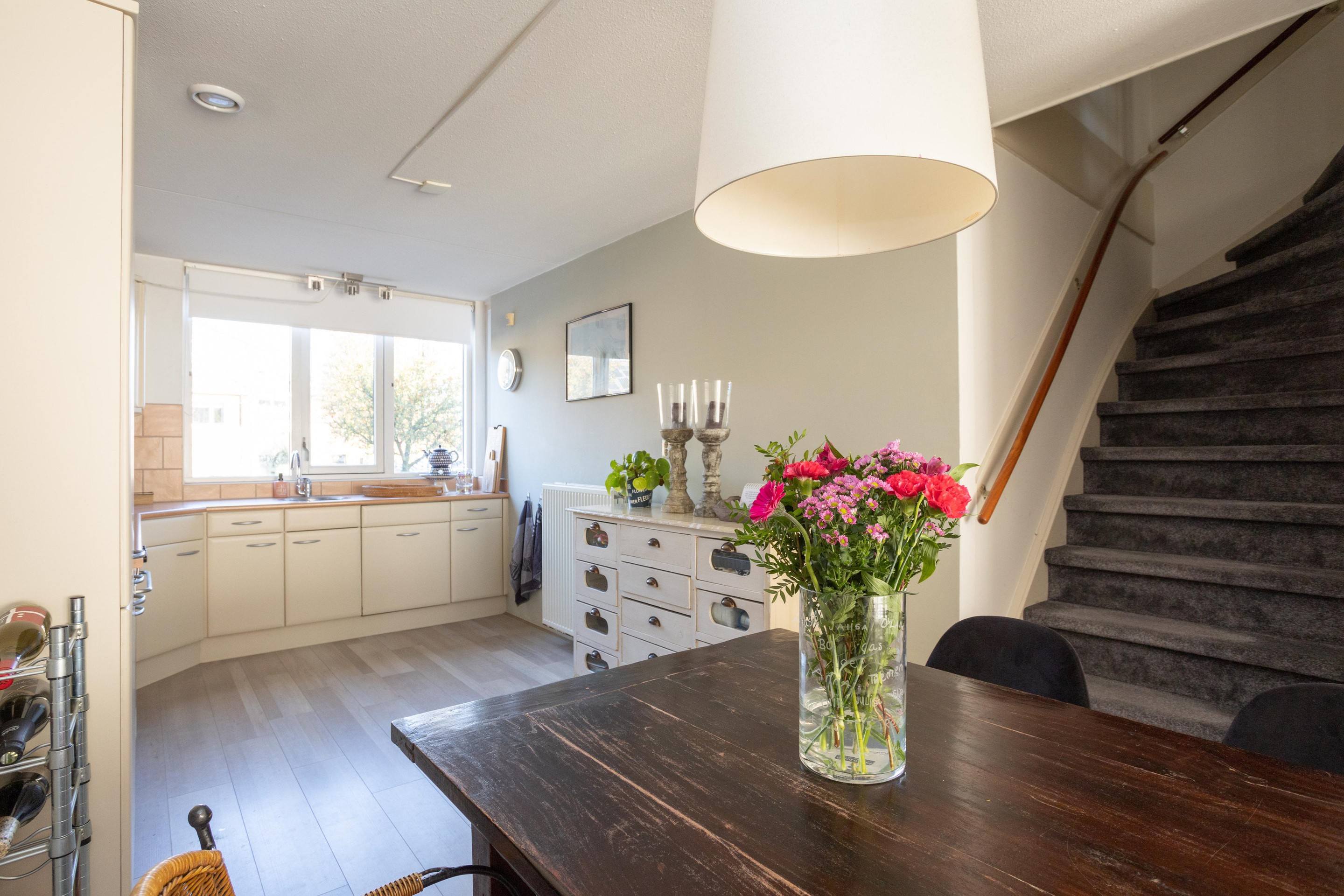 Entree, toilet met fonteintje, trap naar beneden naar de inpandige garage. Vanuit de entree toegang tot de heerlijke woonkamer. Wat direct opvalt naast de prachtige raampartijen is het hoge plafond, wat een ruimte en wat een licht. Op de vloer ligt eiken. Vanuit het woongedeelte een paar treden omhoog om in de ruime eetkamer te komen. De keuken beschikt over een 4 pits gaskookplaat, oven en een vaatwasser. Het geheel is afgewerkt met een kunststof blad. Vanuit de keuken heeft u prachtig vrij uitzicht.