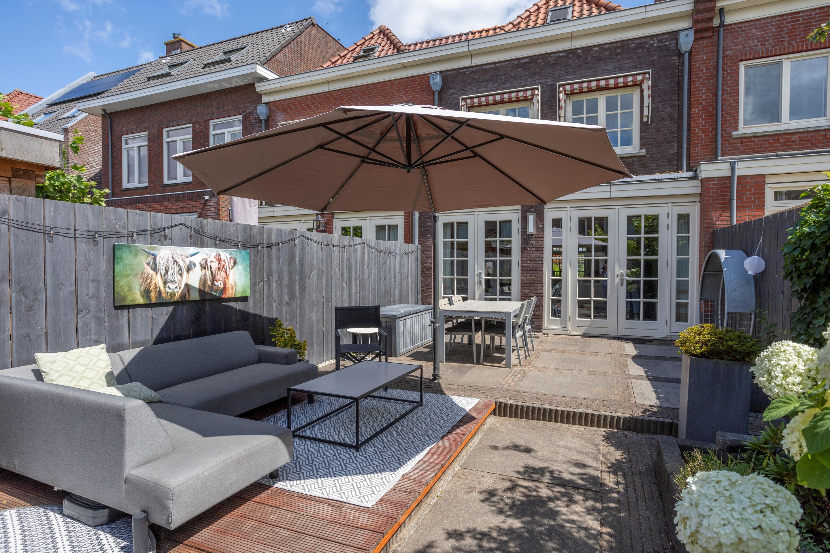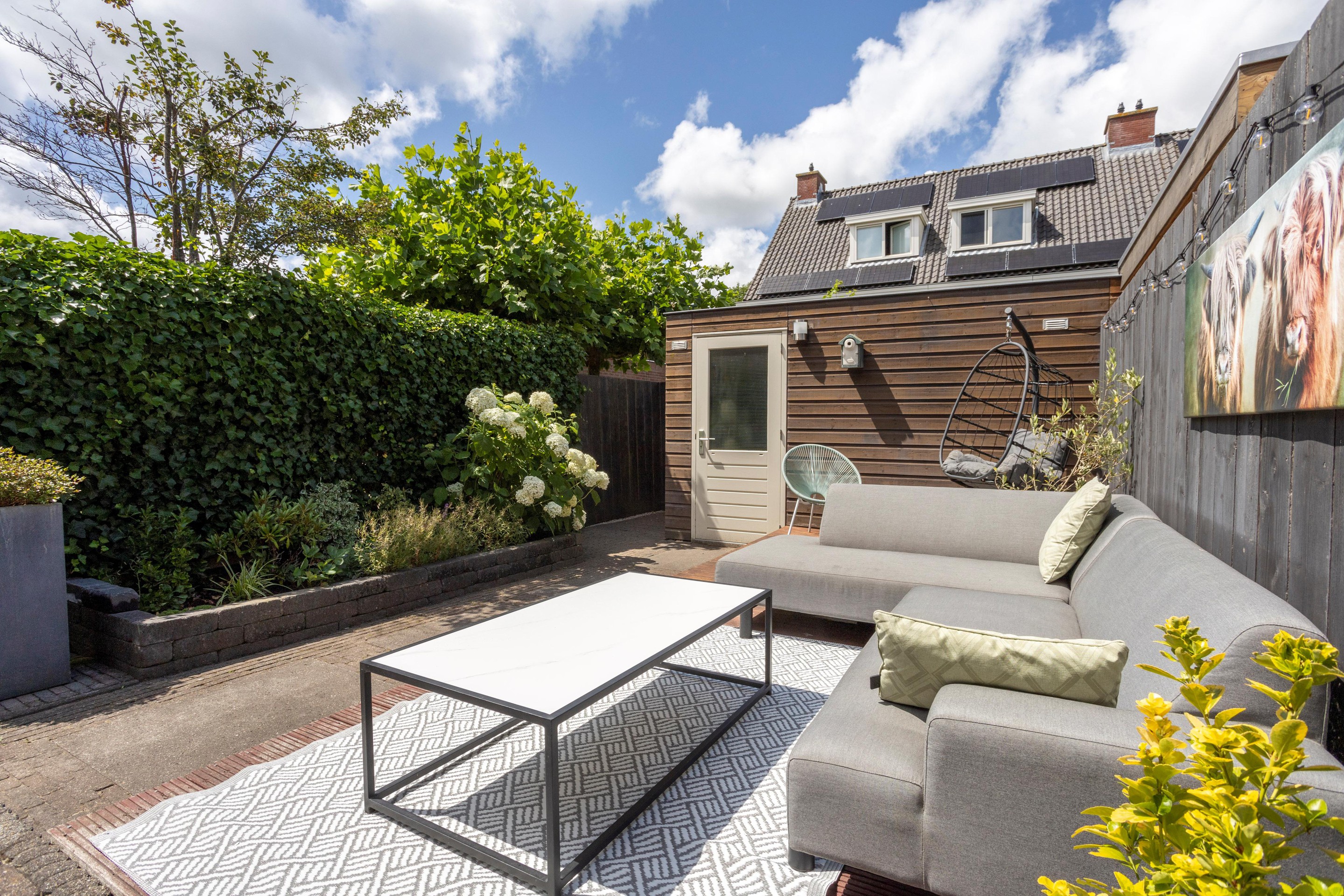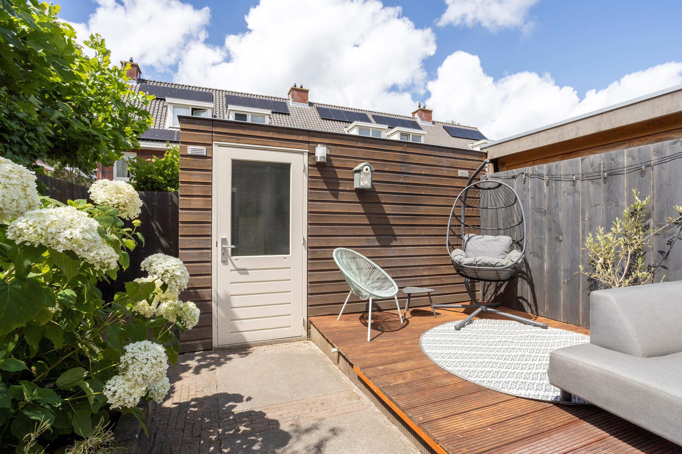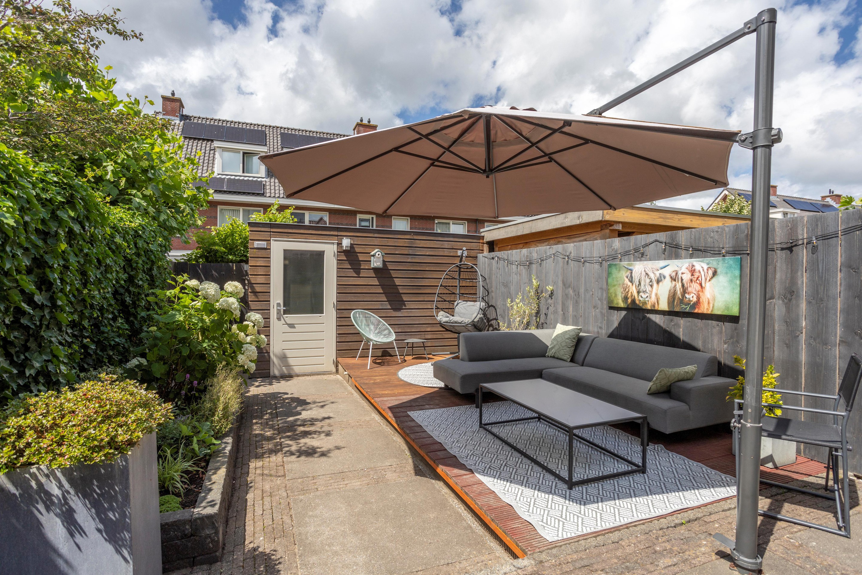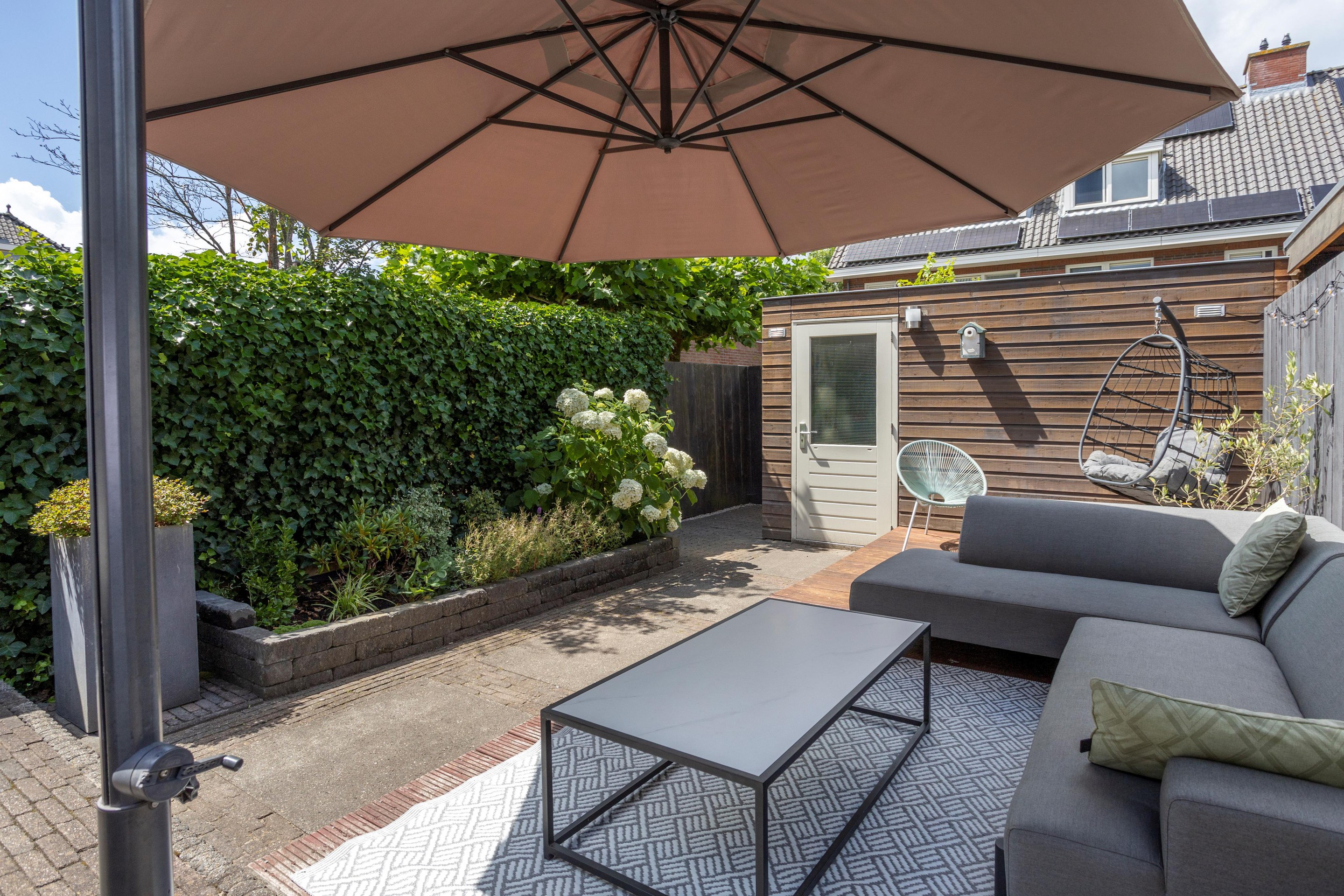De achtertuin is gelegen op het zonnige zuidwesten en hier zit je heerlijk, met of zonder de grote parasol uit. De tuin heeft een houten berging met elektriciteit. Ook fijn dat er een achterom aanwezig is.