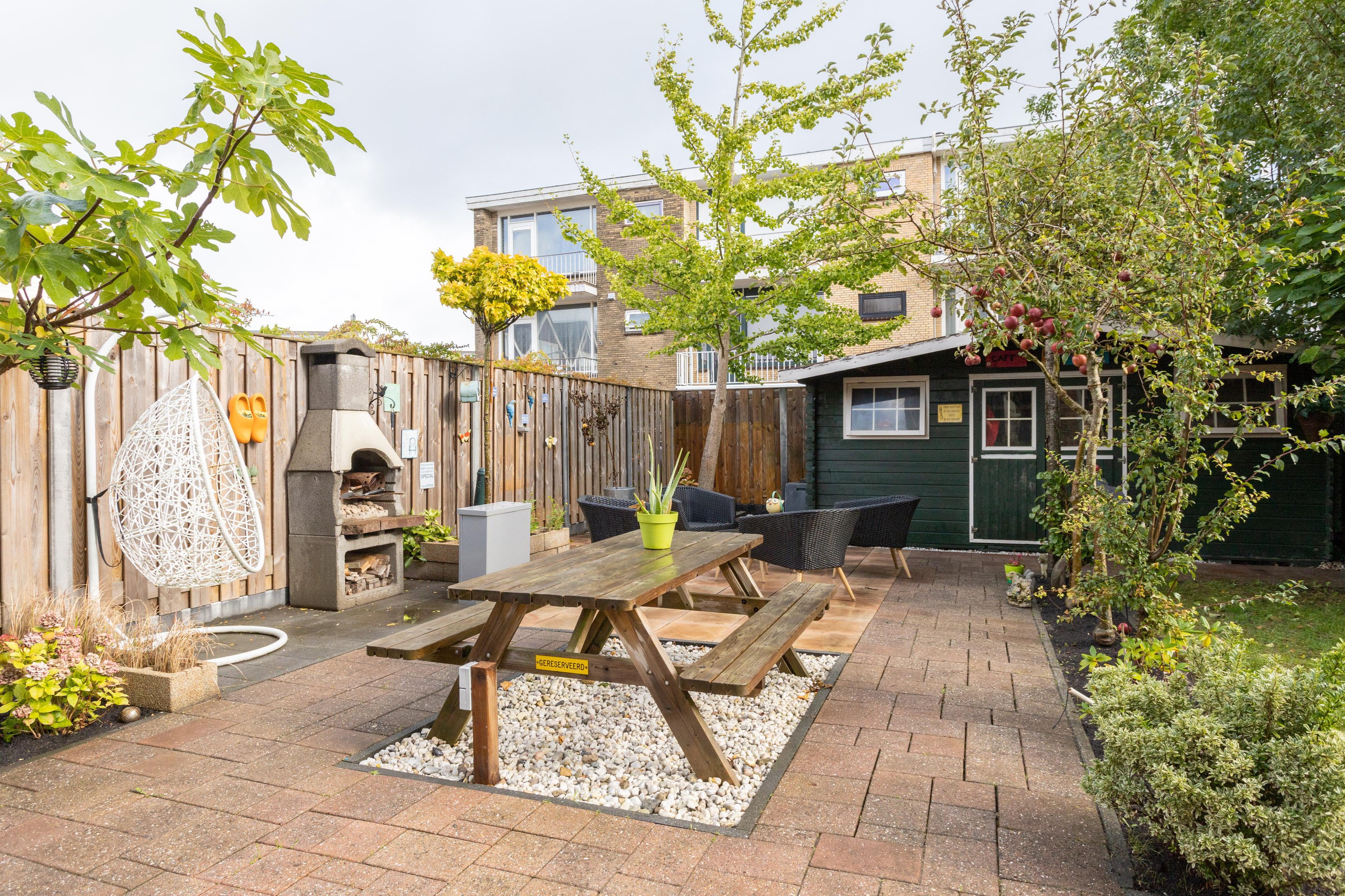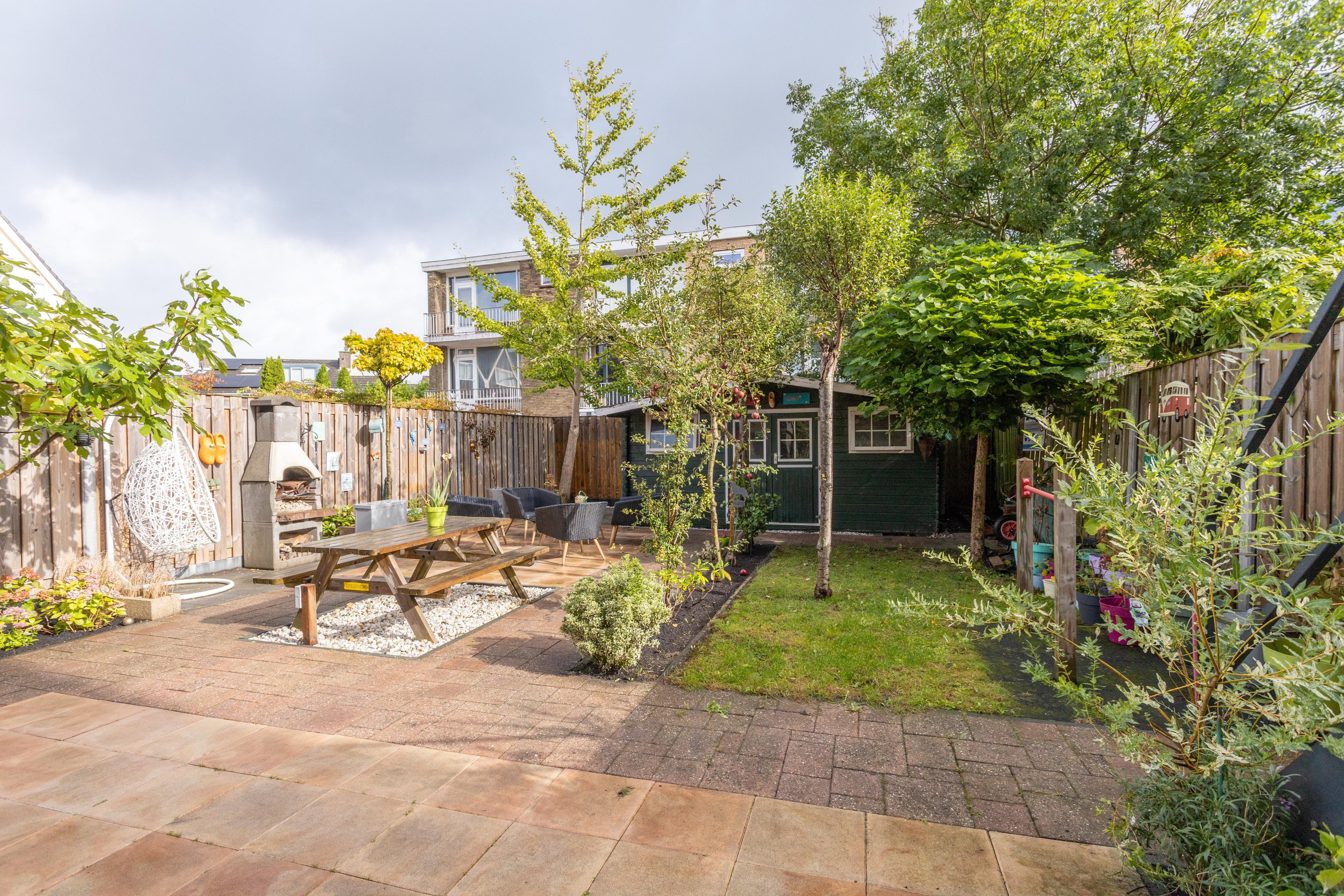 Een mooi aangelegde groene achtertuin met meerdere fruitbomen en een stenen bbq. Daarnaast is er veel ruimte en meerdere terrassen. Ook fijn dat er een houten berging aanwezig is.