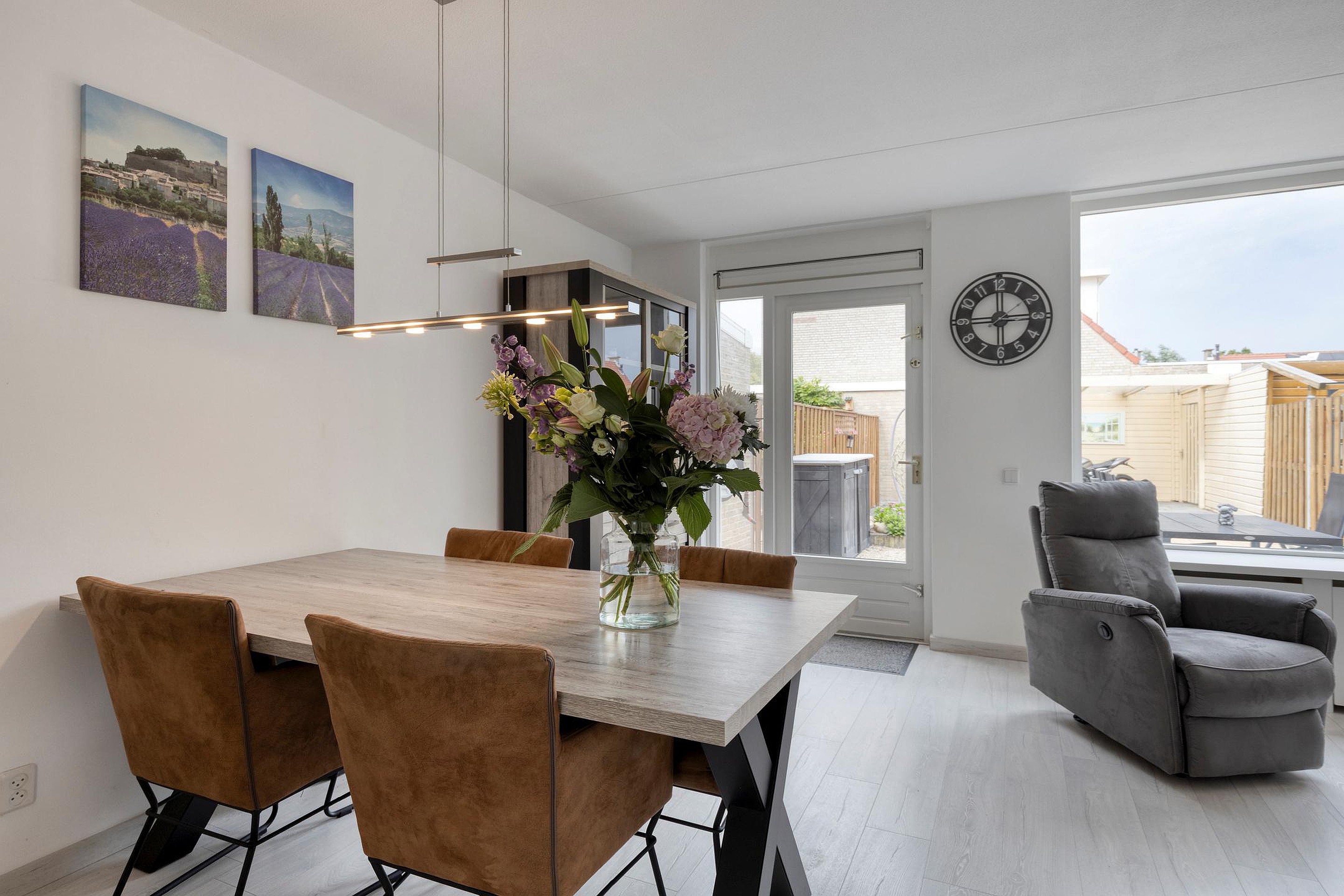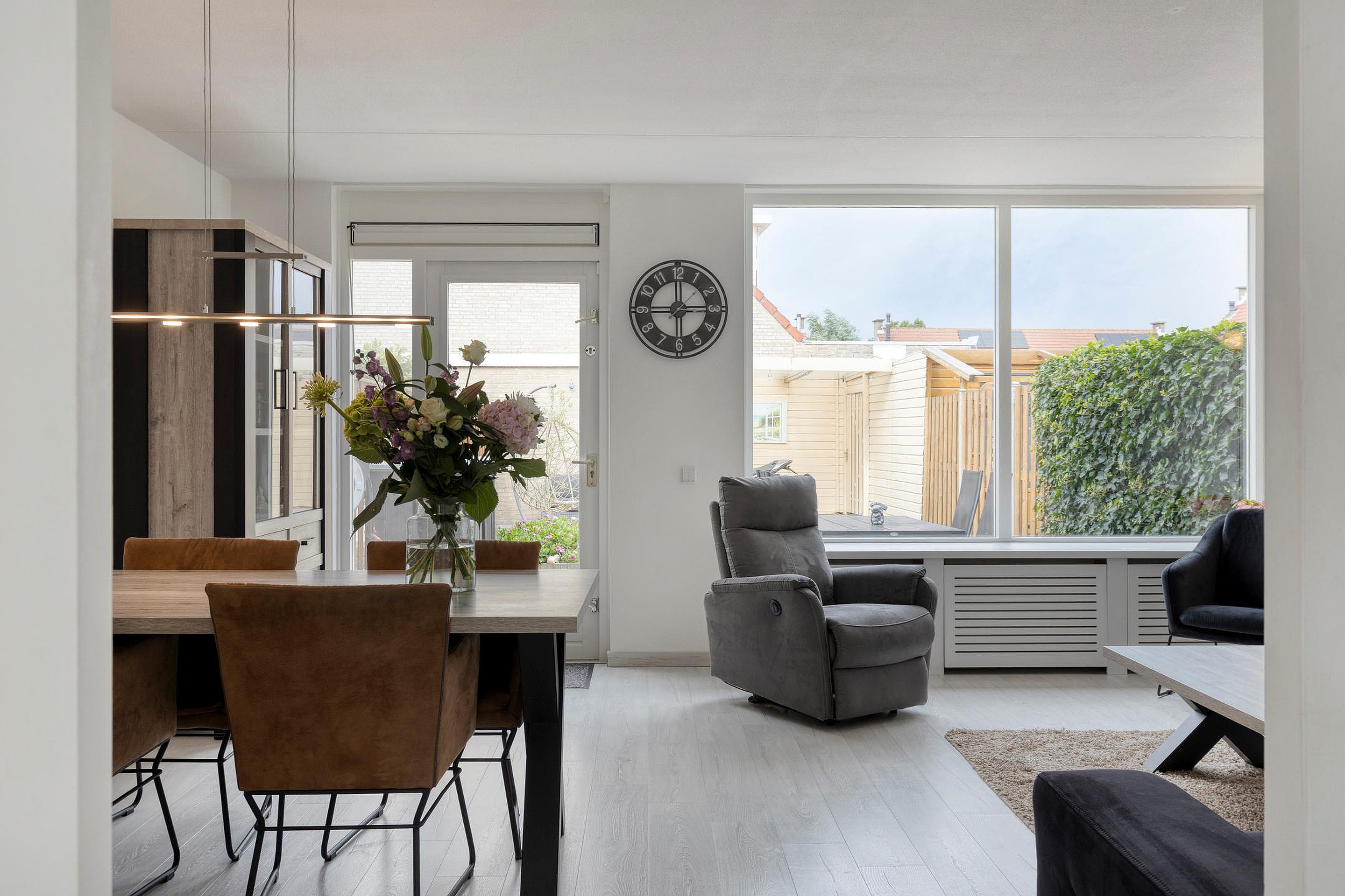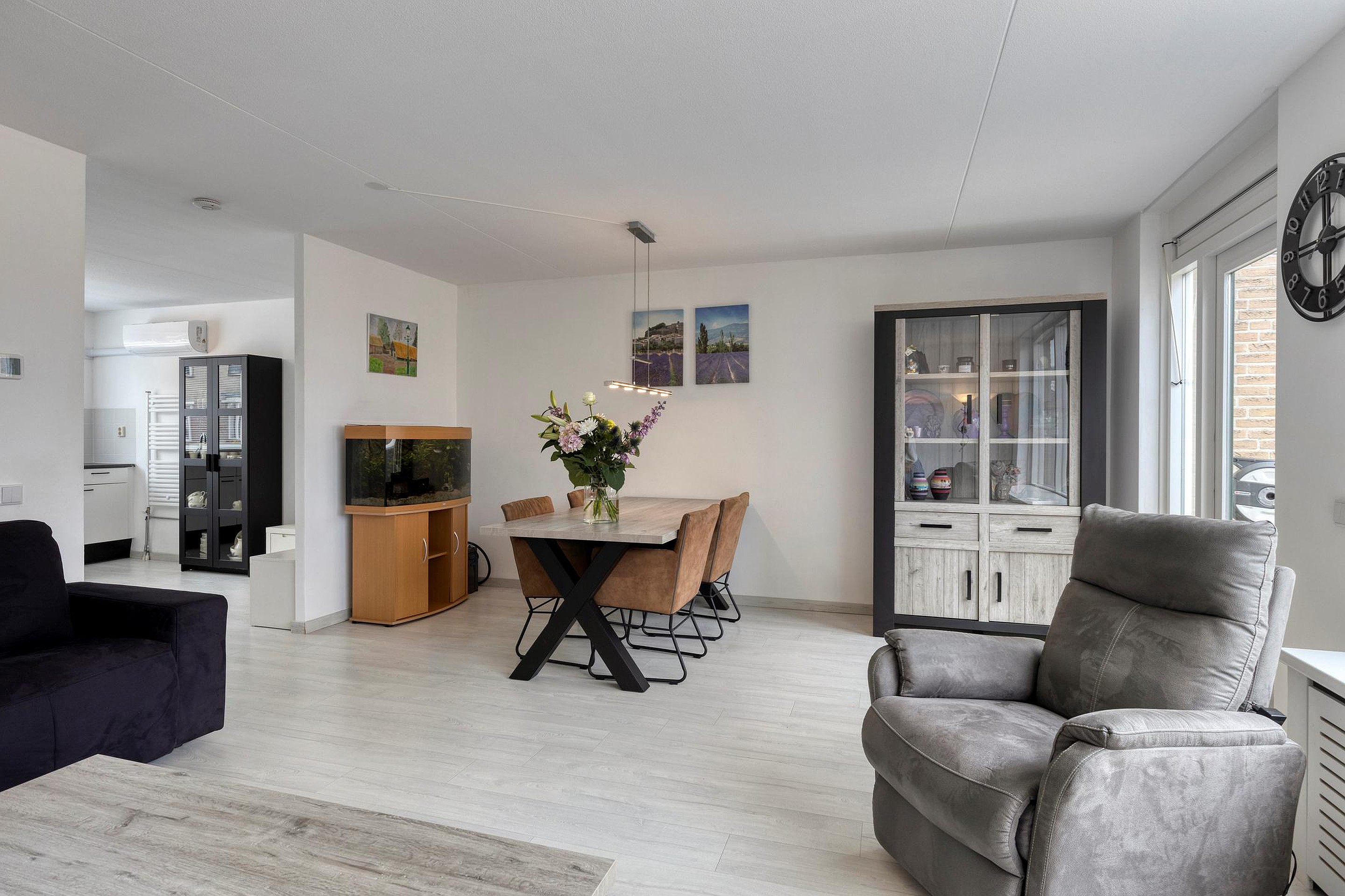 De woonkamer met vloerverwarming biedt ruimte voor een zit- en eetgedeelte. De Bruynzeel keuken stamt uit 1997 maar is in 2021 opnieuw geschilderd en uitgerust met een inductieplaat, vaatwasmachine, koelkast, vriezer. Een airco zorgt er hier voor dat je altijd in een aangename temperatuur kunt koken.