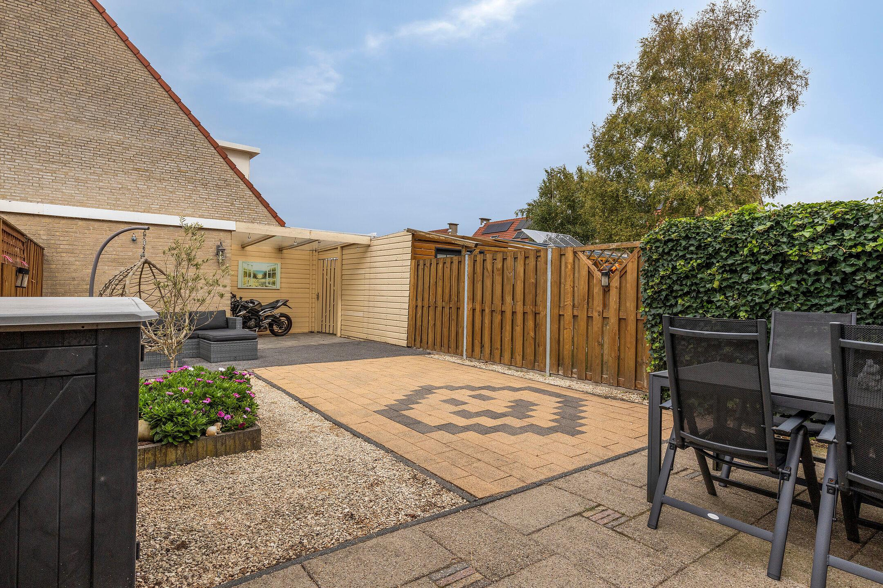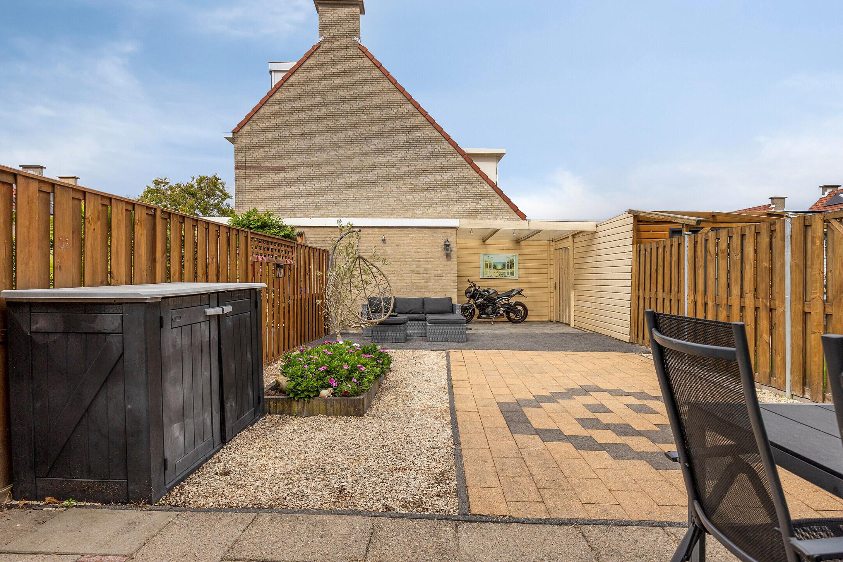 Via de tuindeur in de woonkamer bereik je het terras en de diepe tuin. Deze is speels ingedeeld in vijf zones: drie met tegels, één met grijs kunstgras en één met houtsnippers. In een van de verharde zones is een smiley verwerkt. Achterin bevinden zich een schuur en een achteruitgang. Vanaf het begin van het voorjaar kun je hier al genieten van de zon en schaduw.