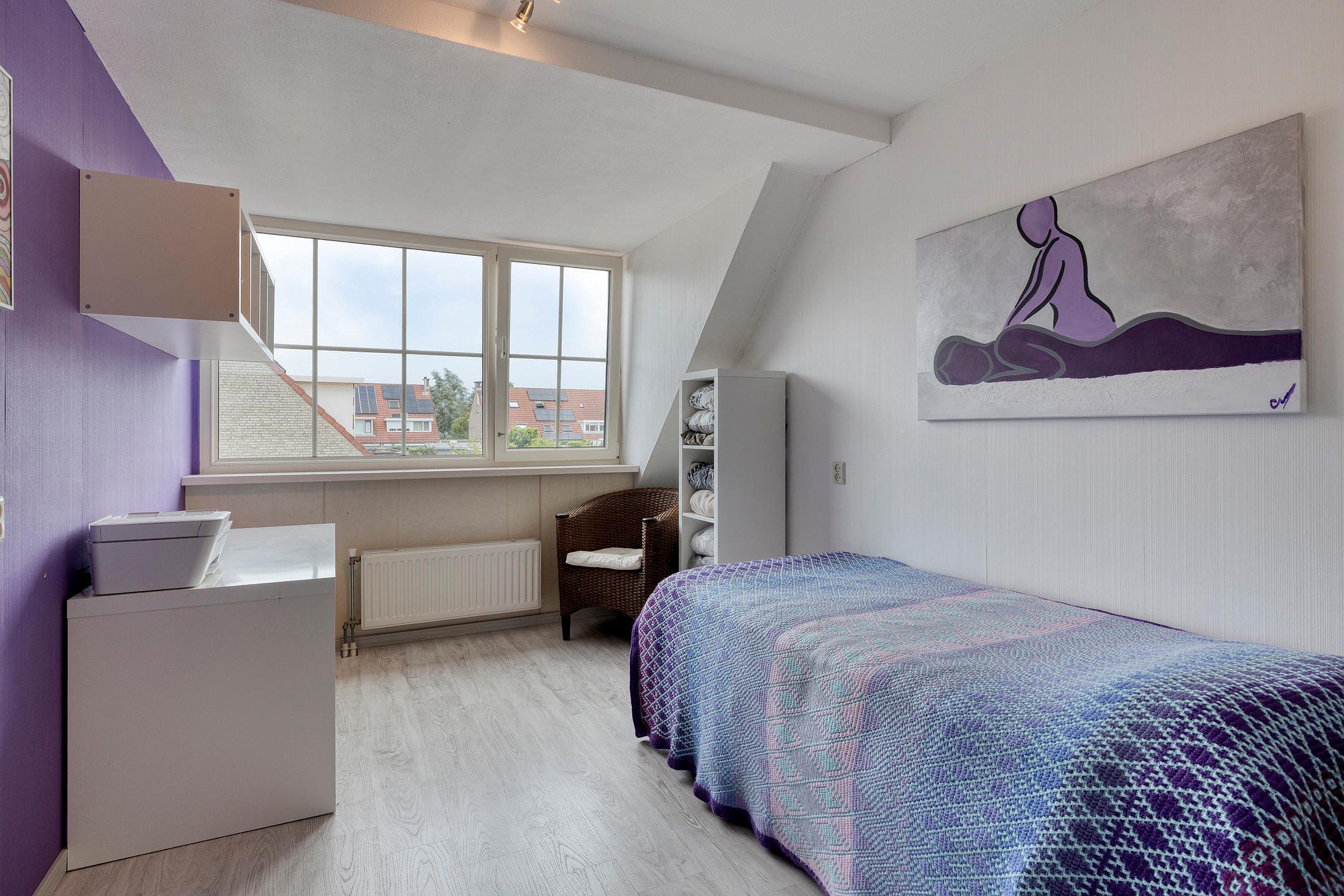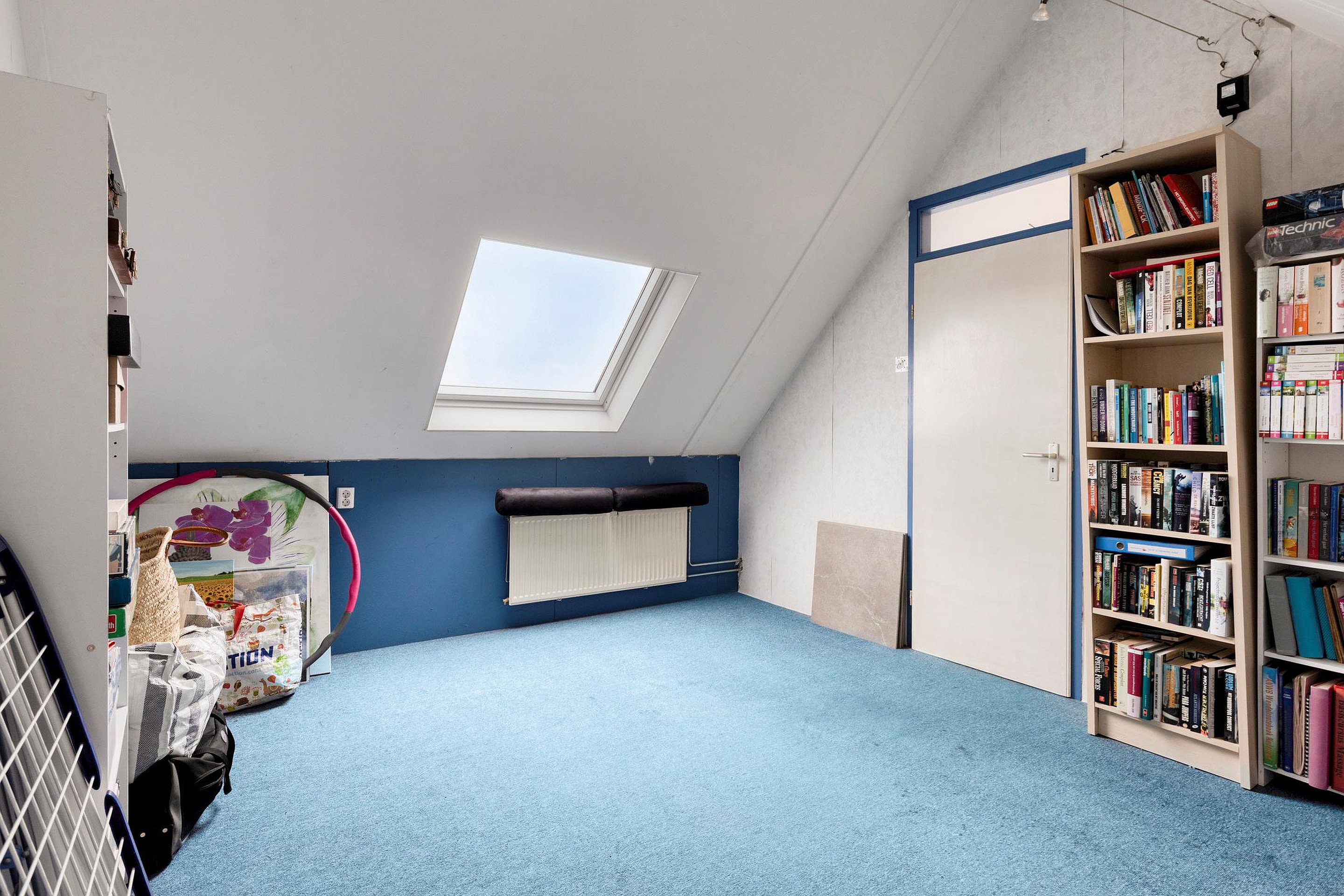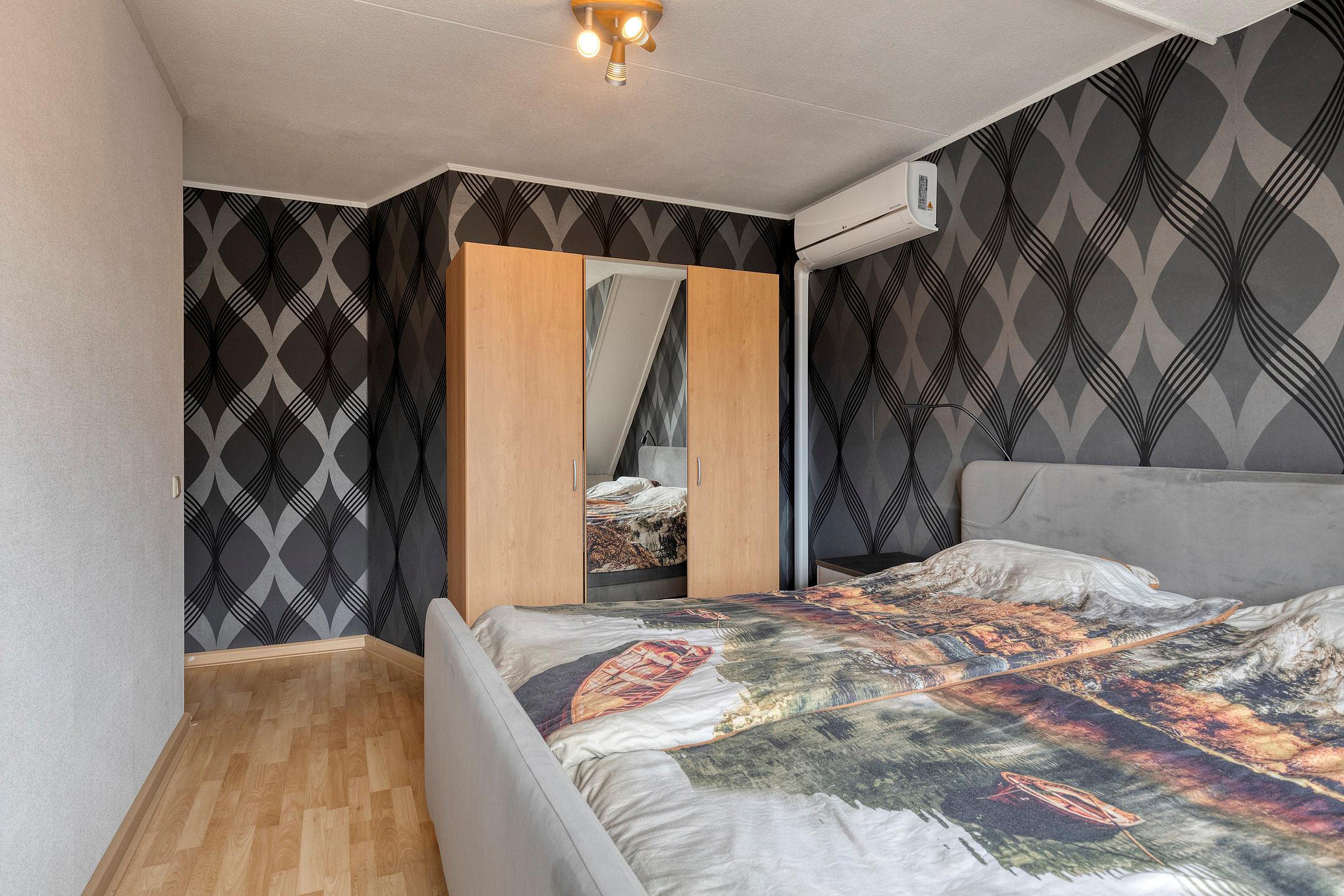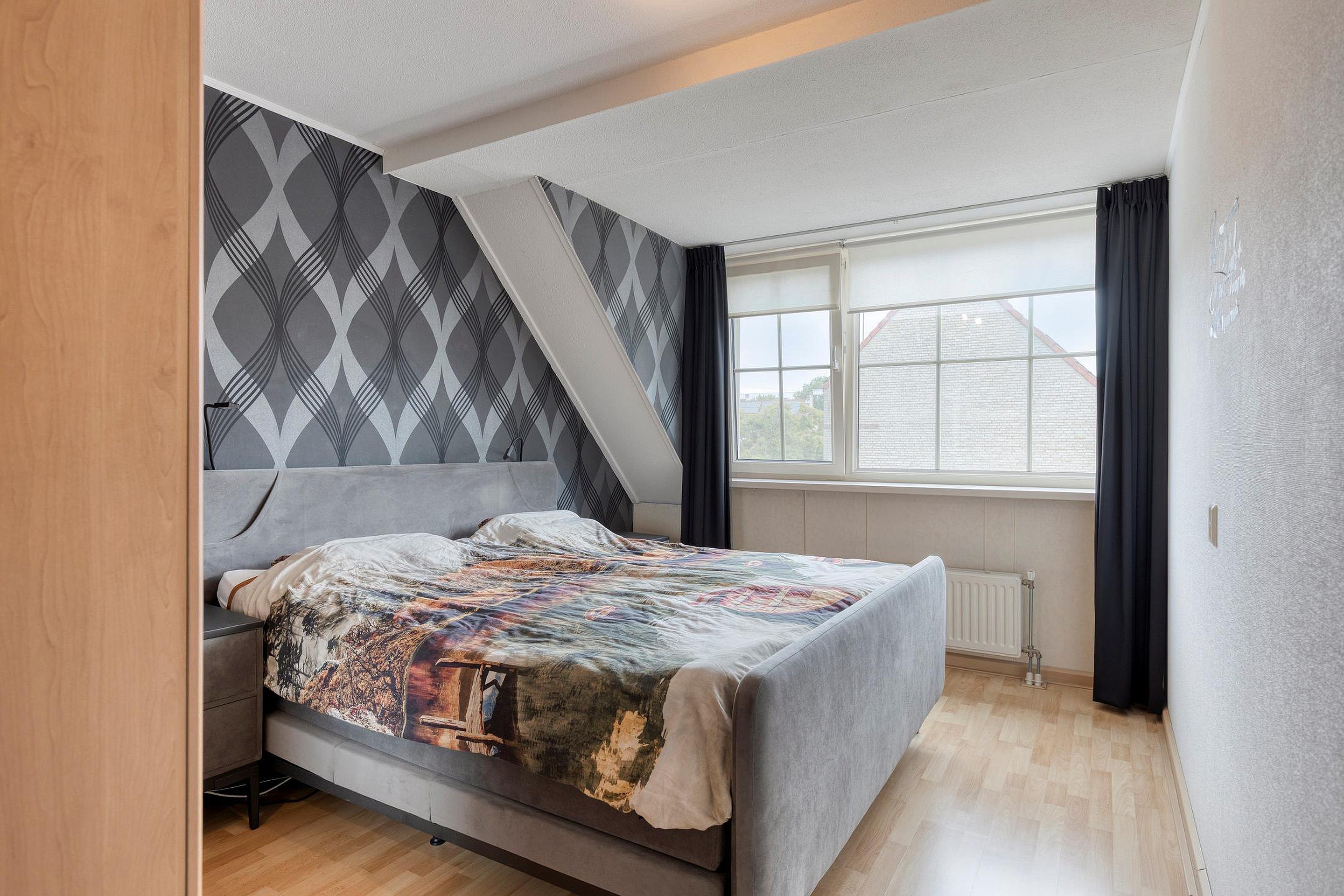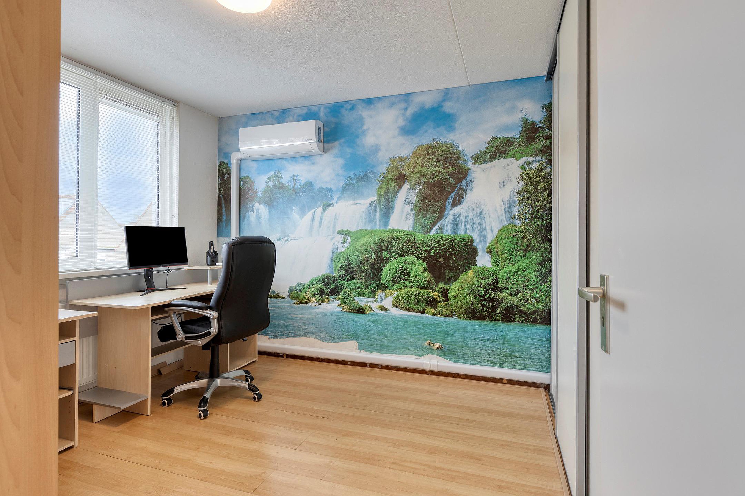 De eerste verdieping telt drie slaapkamers en een badkamer. De masterbedroom kijkt uit op de tuin en is eveneens voorzien van een airco. Daarnaast ligt de tweede slaapkamer, met een dakkapel. De derde kamer aan de straatkant is ideaal als studeer- of logeerkamer, en heeft een inbouwkast én airco.
