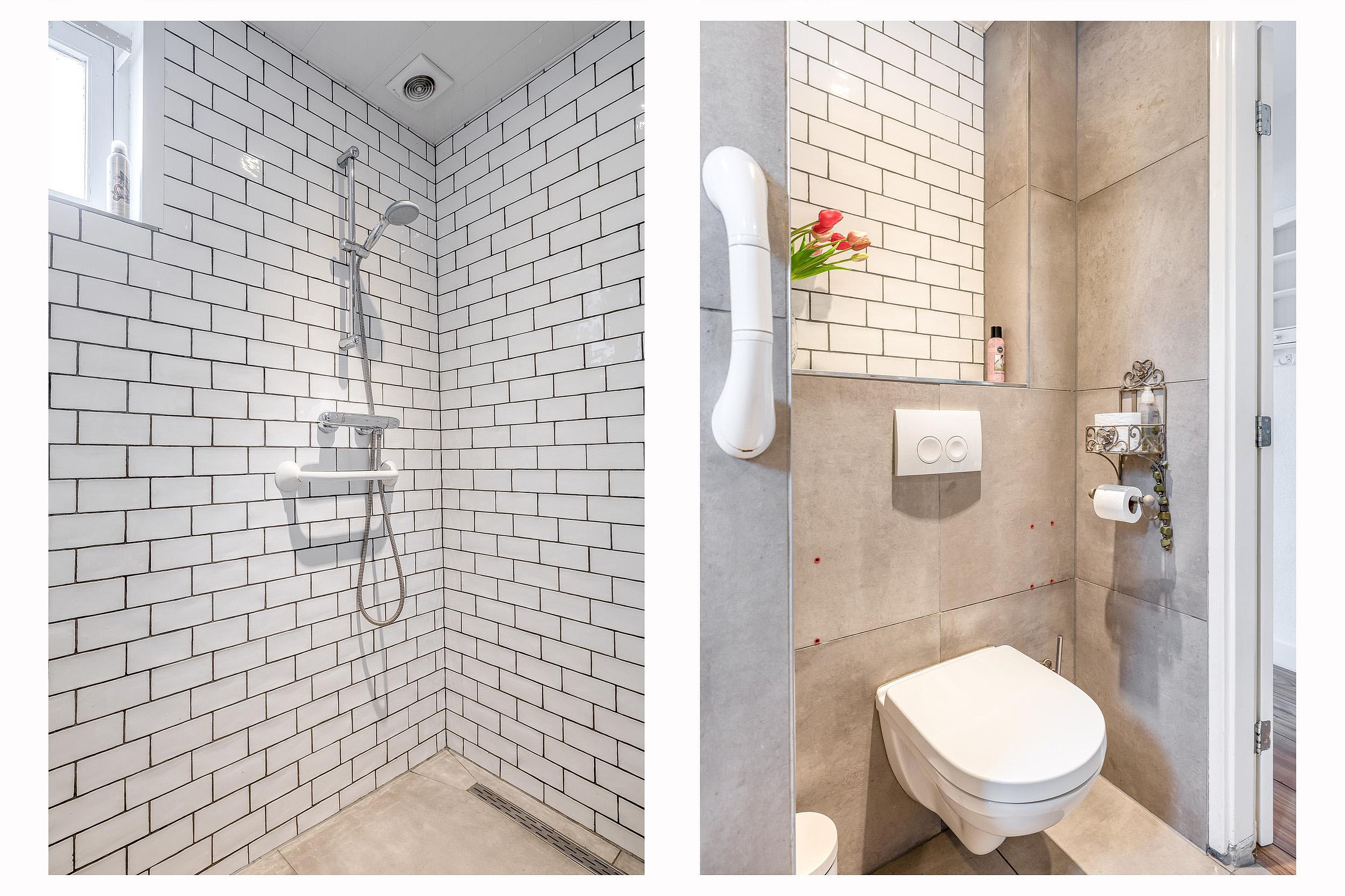 Naast de entree vind u de badkamer met elektrische vloerverwarming, deze is geheel betegeld en voorzien van daglichtinval, een wandcloset, een wastafelmeubel en een doucheruimte.