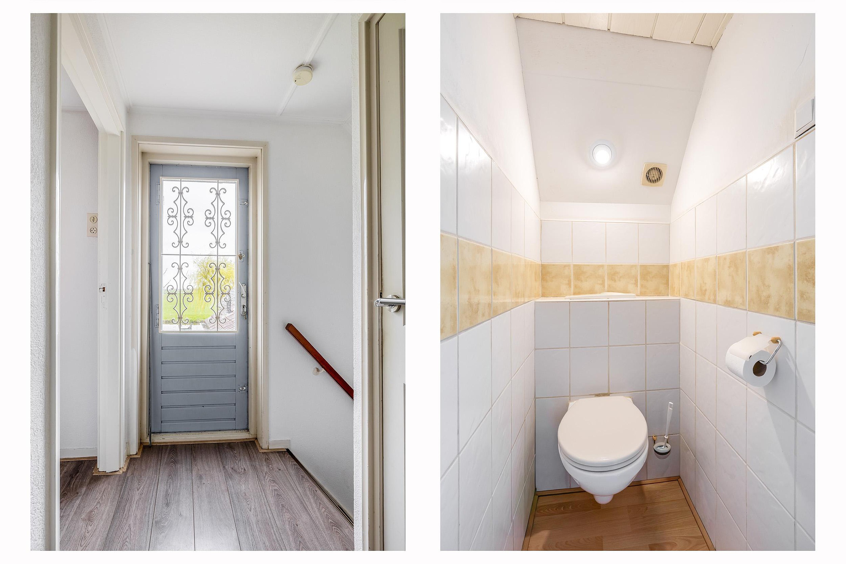 De fraaie gevel rondom de voordeur is op zich al het vermelden waard, zodra u binnenstapt geeft de entree toegang tot de meterkast, trapopgang naar de etage en de achtergelegen hal.