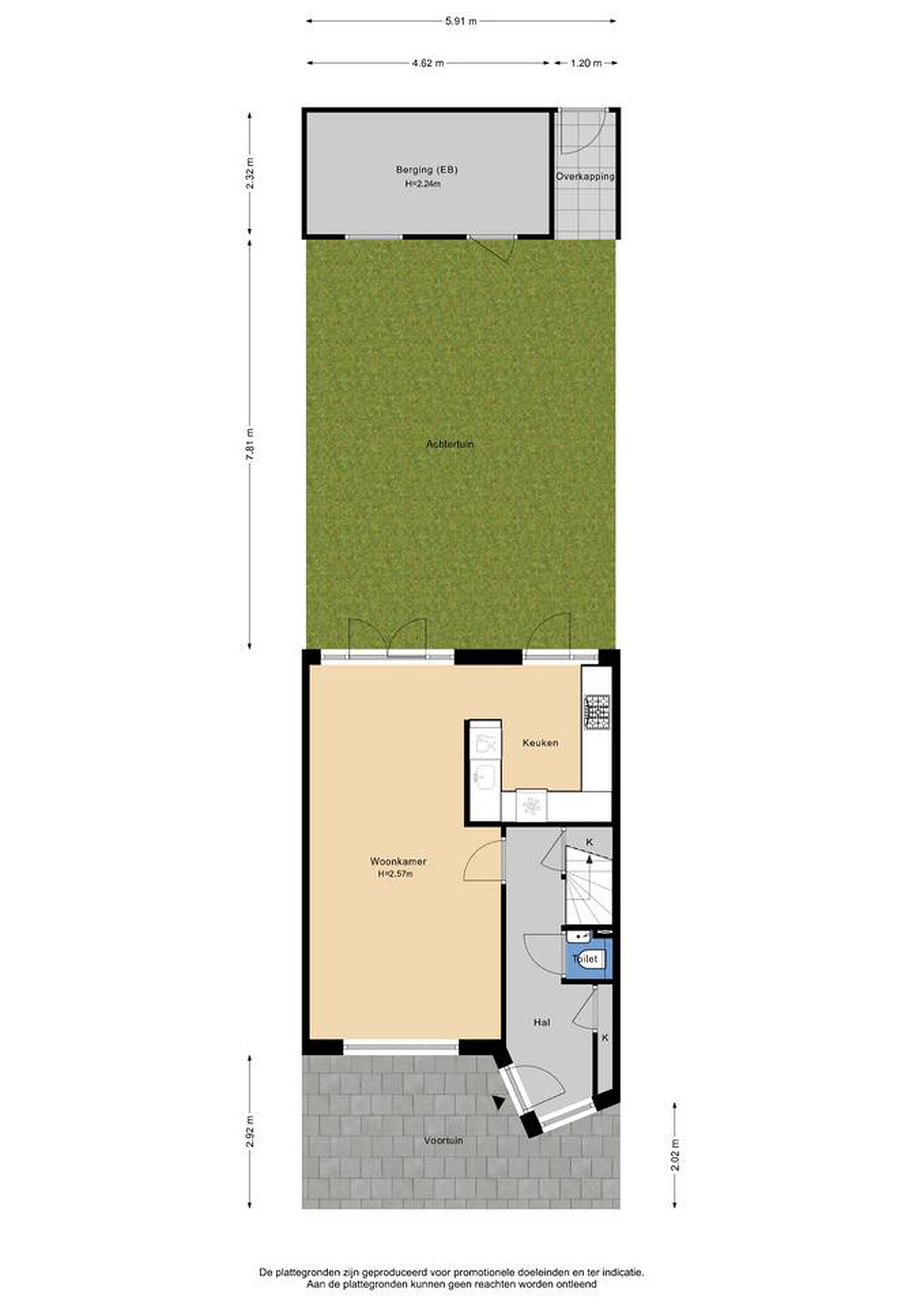 Via de voortuin (2.92/2.02 diep) kom je bij de entree van de woning. De hal (1.98 x 5.41) met meterkast en trapkast geeft toegang tot de eerste verdieping, de woonkamer en het toilet. Het toilet is deels betegeld en voorzien van een staand model toilet en wasbakje. In de woonkamer (3.65 x 7.14) is er door de lichtinval via het grote voorraam en dubbele deuren aan de achterzijde erg licht. Aan de achterzijde is de open keuken (2.99 x 2.78) welke toegang geeft naar de achtertuin. De U-keuken heeft veel werkblad en is voorzien van diverse inbouwapparatuur zoals een luxe 5-pitsgasfornuis inclusief wokpit, 3 ovens waarvan 1 grill, vaatwasser, afzuigkap, boiler en koel-vriescombinatie. In de achtertuin op het zuiden kun je fijn genieten van de zon. De achtertuin (circa 10 meter diep) is voorzien van een achterom en stenen berging (4.62 x 2.32) met kleine overkapping (1.20 x 2.32). Deze verdieping is voorzien van een laminaat- en vinyltegel vloerafwerking.