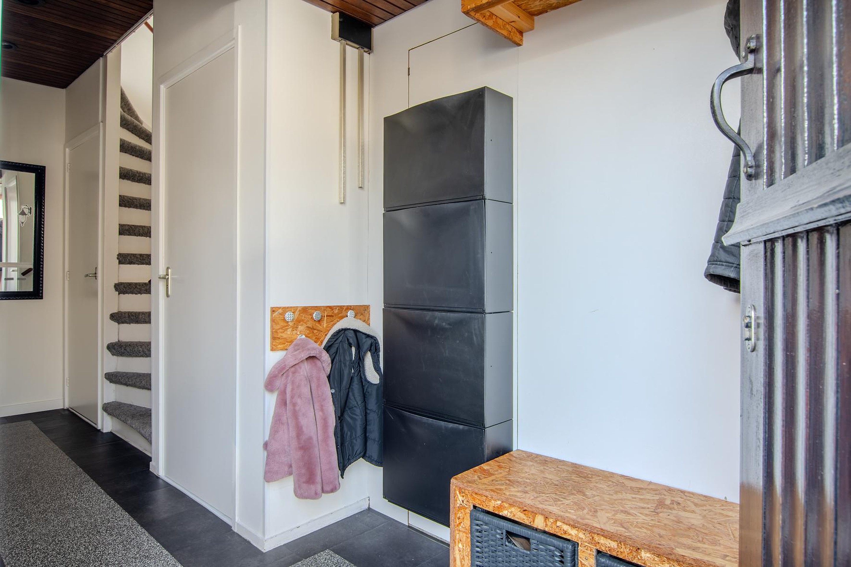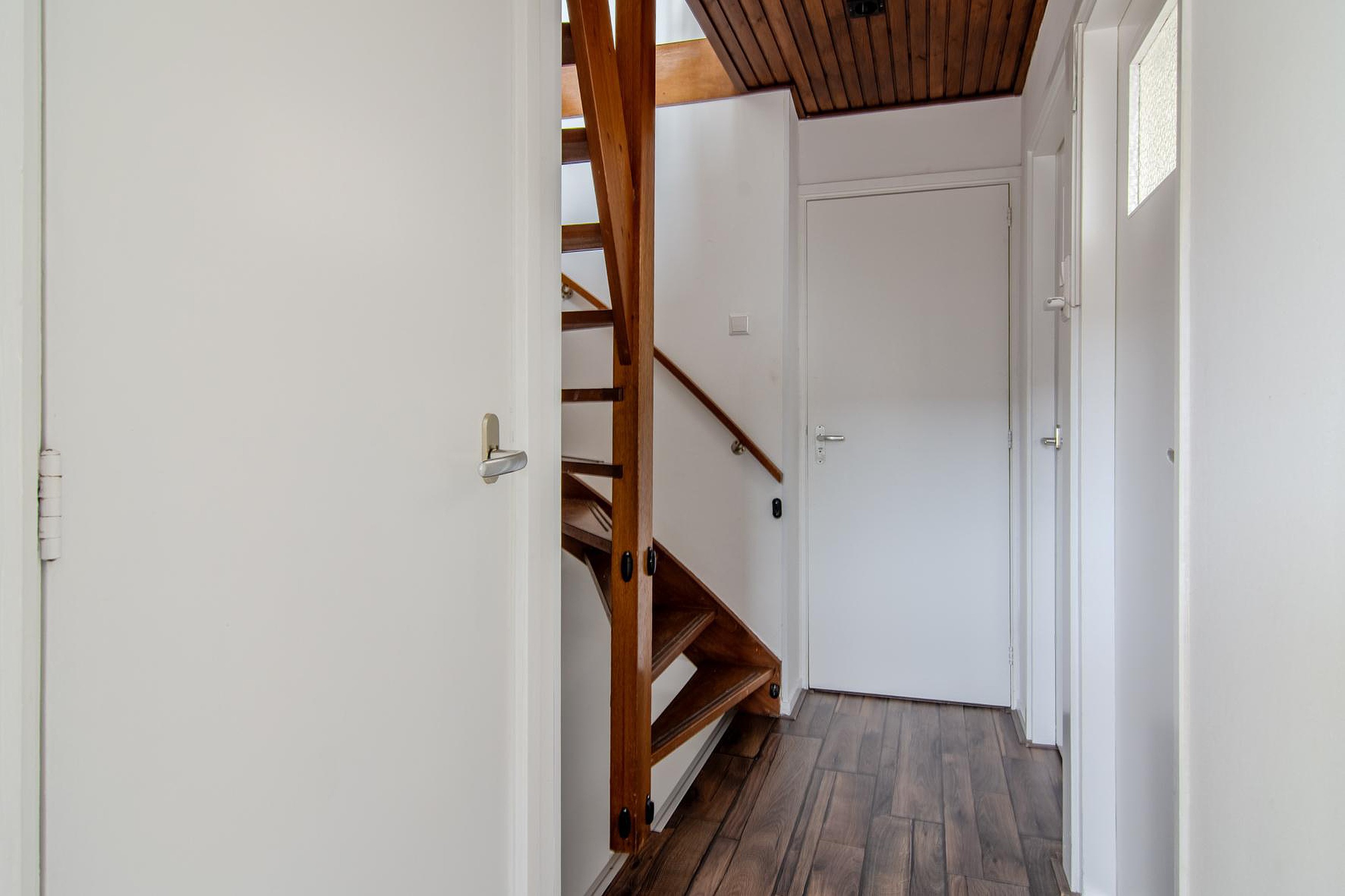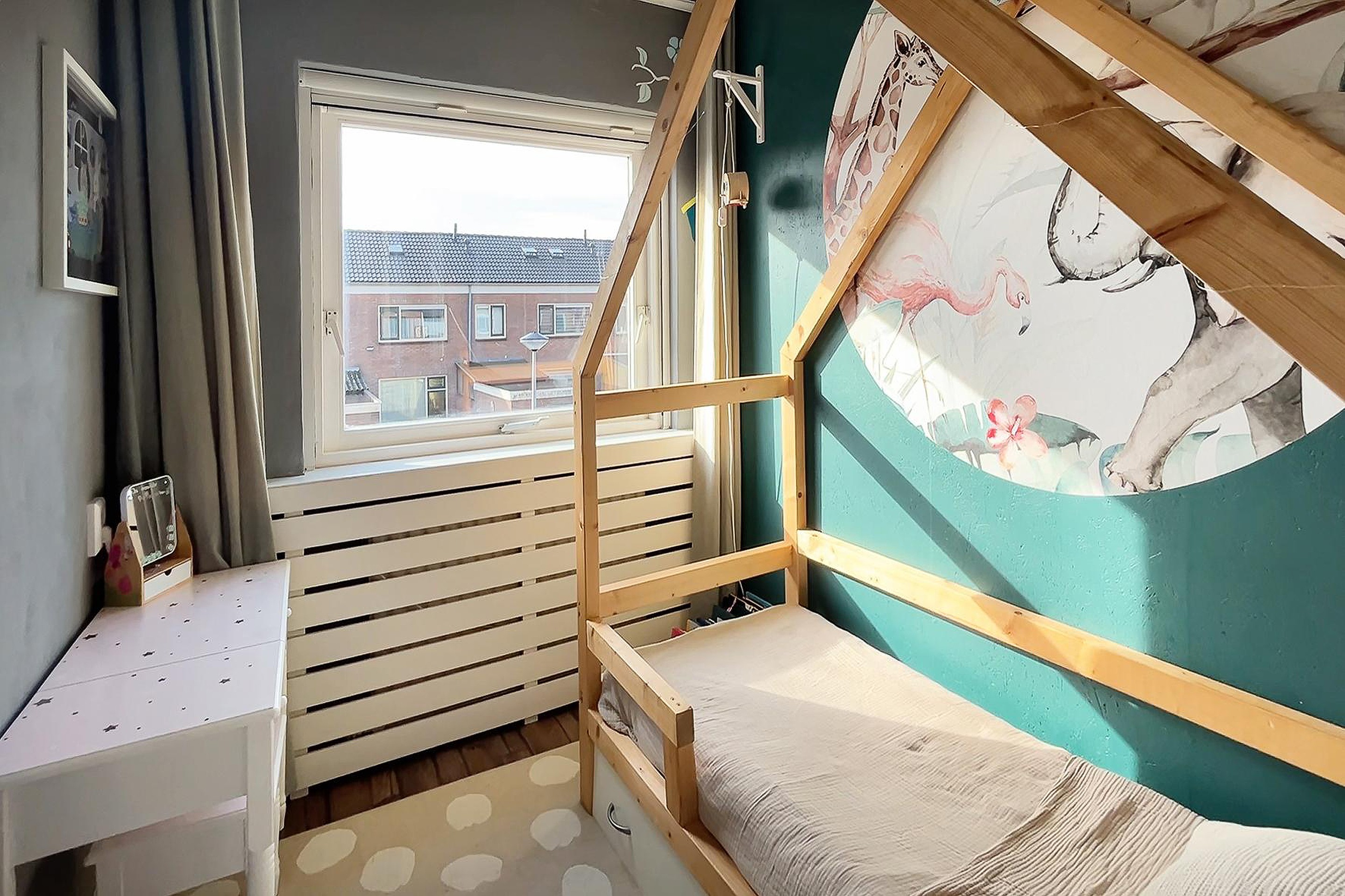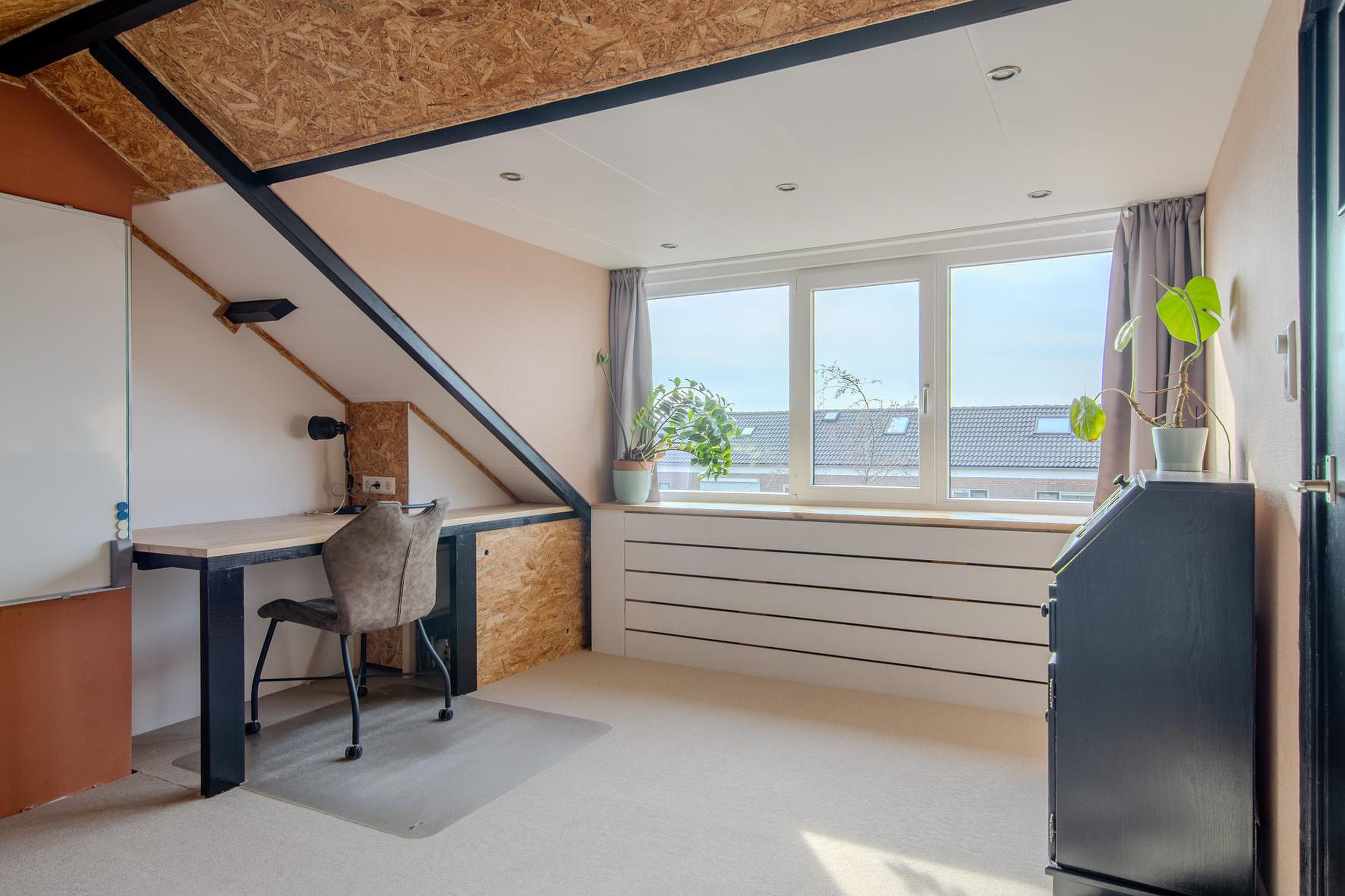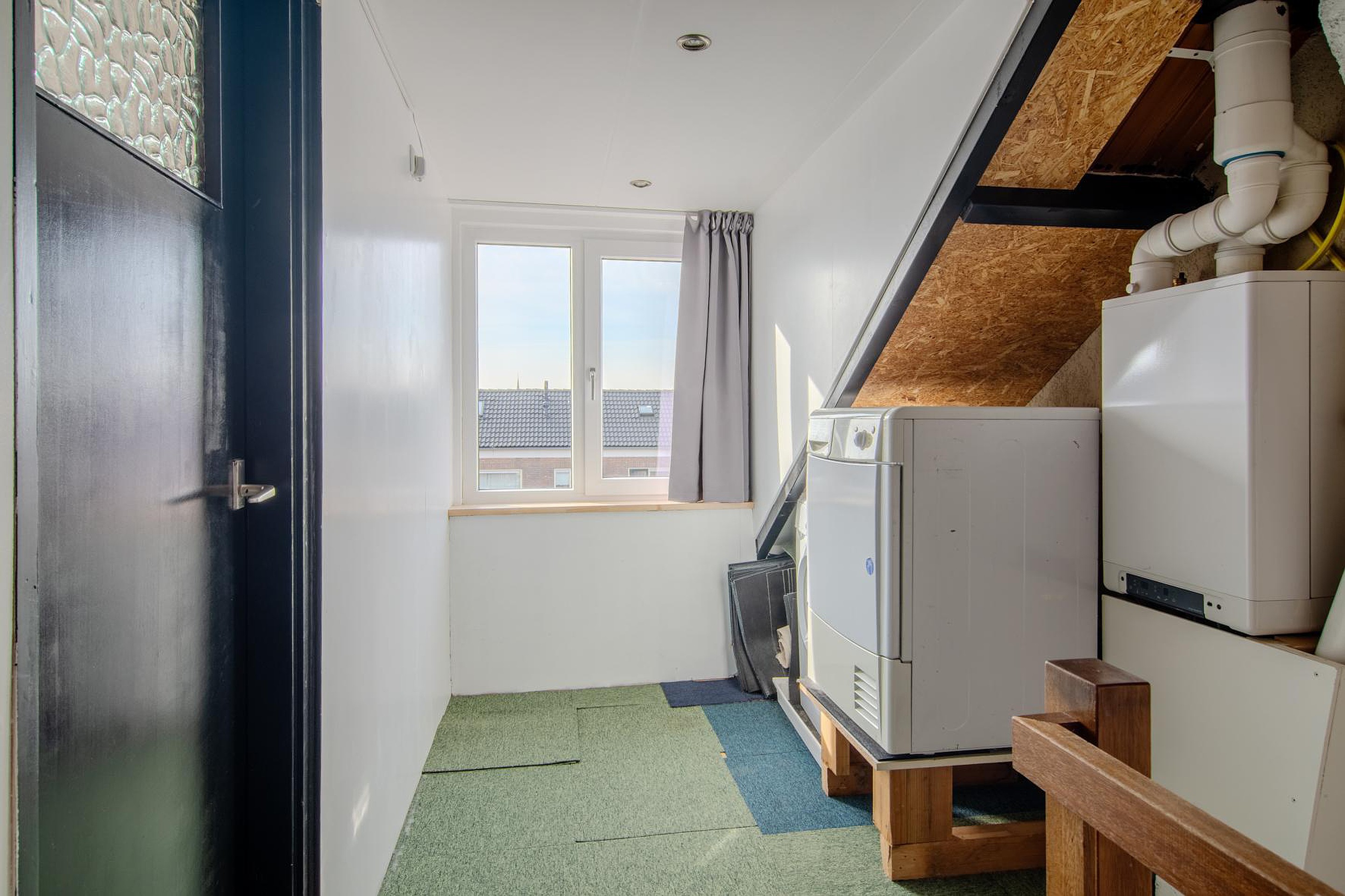 Op de tweede verdieping vind je de lichte overloop met dakkapel en vierde slaapkamer met dakkapel. Op de overloop (1.98 x 4.49) bevinden zich de opstelplaats voor de cv-ketel en de wasmachine- en drogeraansluiting. De slaapkamer (3.65x 4.49) is over de gehele lengte van de woning en is nu in gebruik als werkkamer. Door middel van het plaatsen van een dakkapel aan ook de voorzijde is er de optie om hier een vijfde slaapkamer te creëren. Verder is er nog extra bergruimte achter de schotten van het schuine dak. Deze verdieping is voorzien van een tapijt vloerafwerking.
