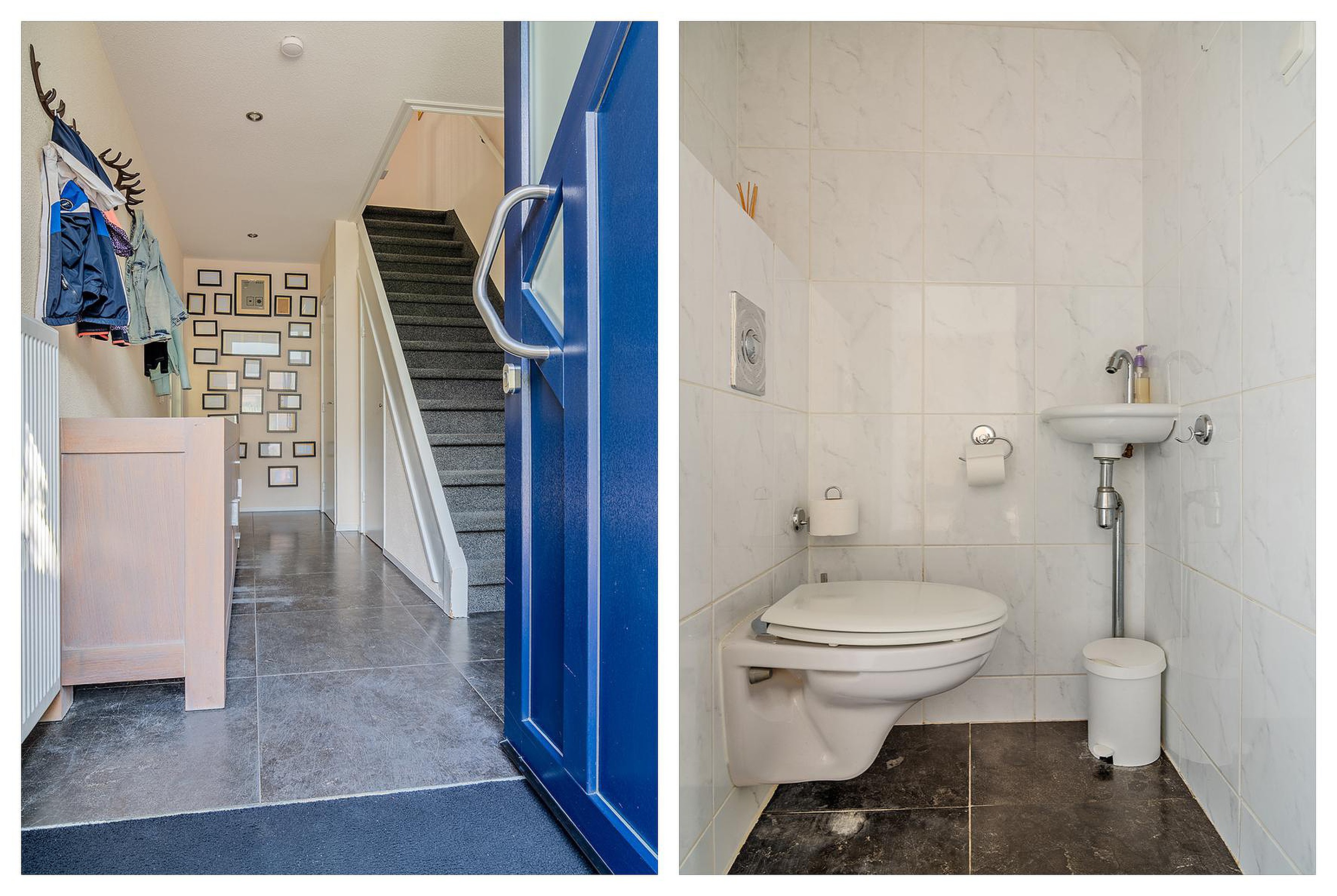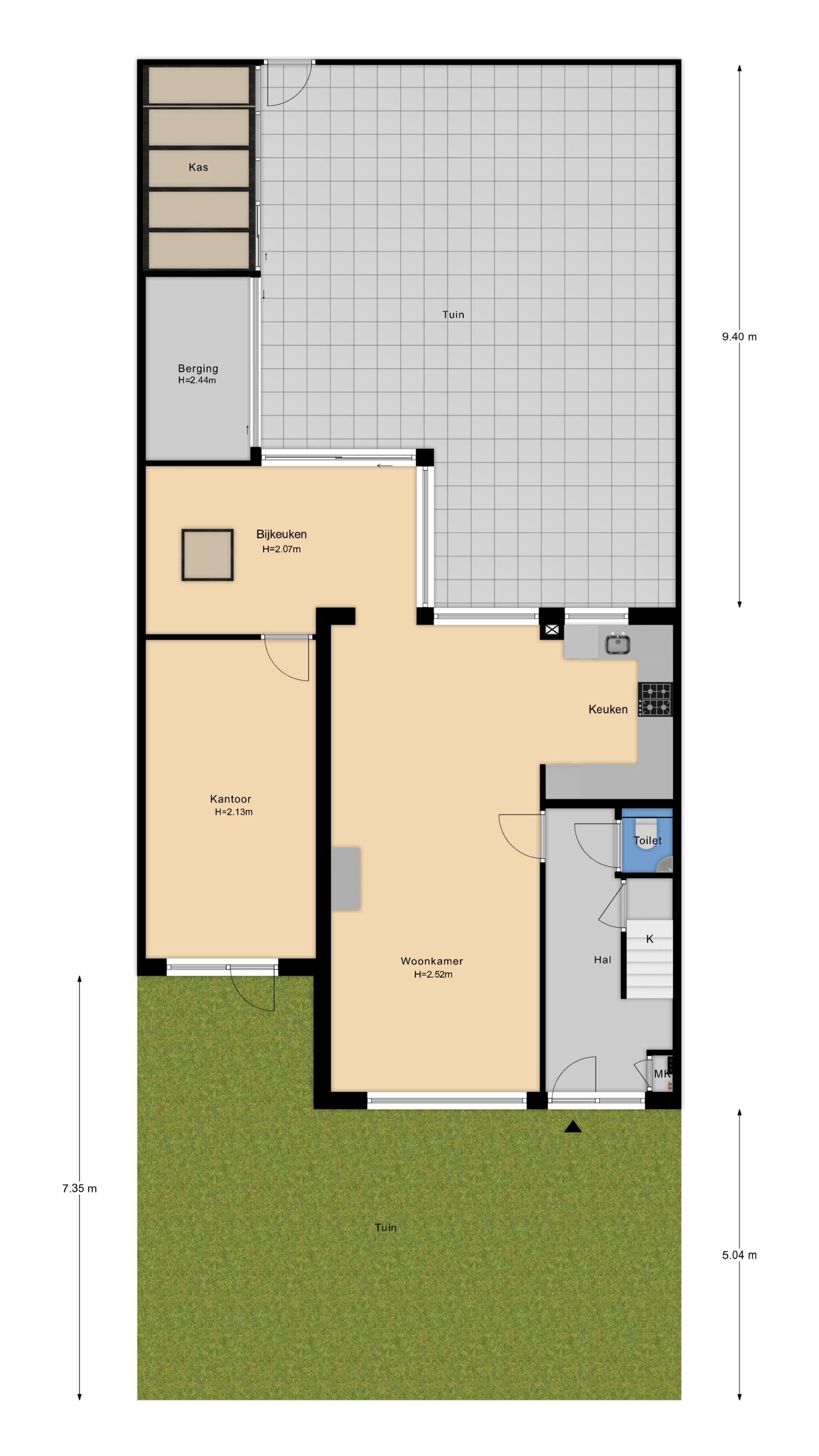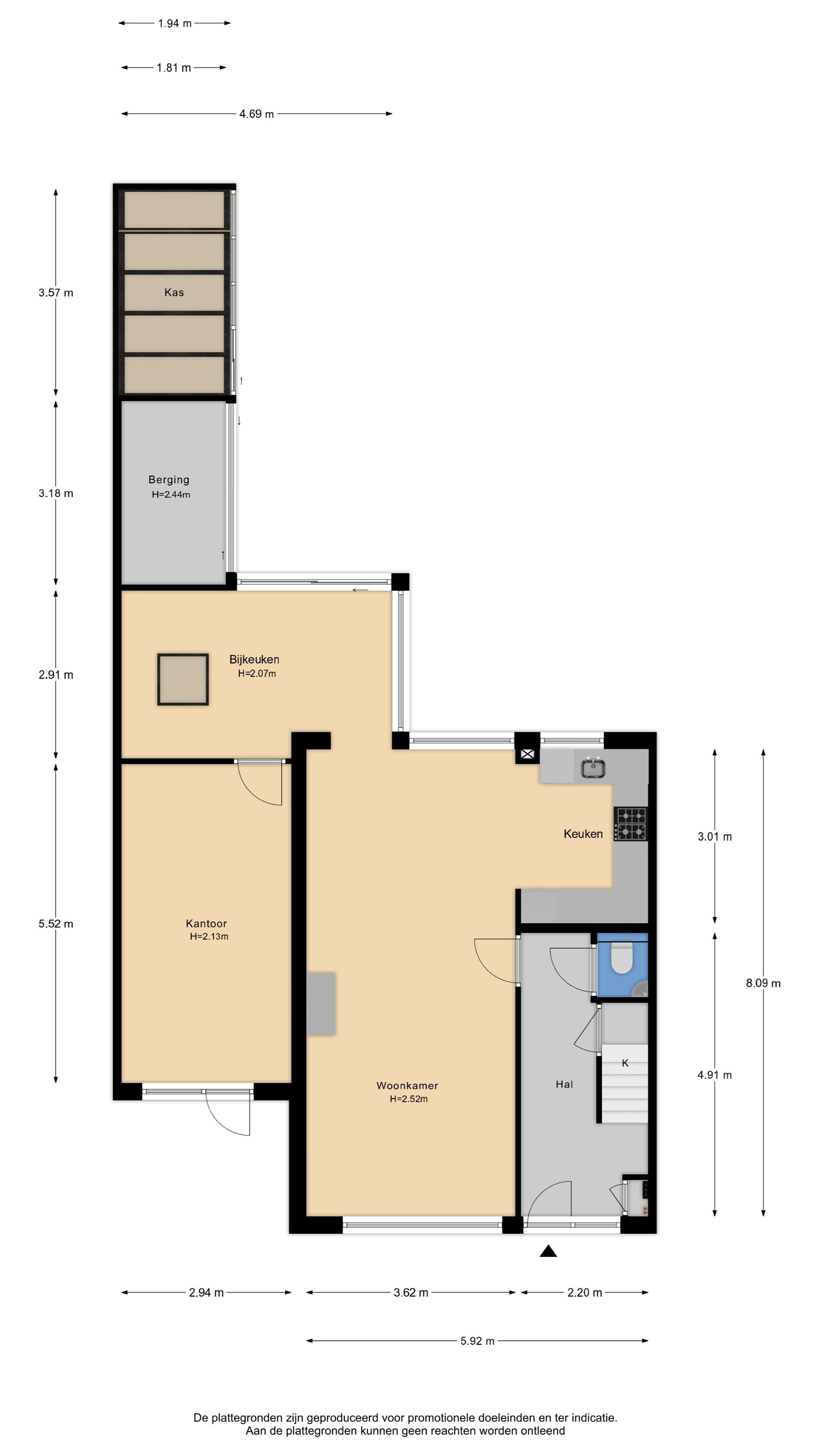 Via de voortuin (5.04 diep) kom je bij de entree van de woning. De hal (2.20 x 4.91) met meterkast en trapkast geeft toegang tot de eerste verdieping, de woonkamer, keuken en het toilet. Het toilet is deels betegeld en voorzien van een hangend toilet en wastafel. Door de lichtinval via de grote voor- en achterramen in de woonkamer (3.62 x 8.09) is het hier zelfs op een bewolkte dag erg licht. De woonkamer is voorzien van een plavuizen vloer met vloerverwarming en een open haard. De open keuken (2.20 x 3.01) is voorzien van diverse inbouwapparatuur zoals een vaatwasser, gasplaat, afzuigkap, spoelbak, combi-oven en koel-vriescombinatie. In de aanbouw is de kinderspeelkamer (4.69 x 2.91) gesitueerd, welke voor meerdere doeleinde gebruikt kan worden. De voormalige garage is nu in gebruik als kantoorruimte (5.52 x 2.94), maar kan ook goed dienen als slaapkamer met badkamer. Via de schuifpui stap je vanuit de speelkamer zo de achtertuin (9.40 x 9.60) in. Deze is gelegen op het noorden. Hier kun je achterin van de zon genieten en tegen de woning altijd in de schaduw zitten. In de achtertuin staat de houten berging (3.18 x 1.81) en de hobbykas (3.57 x 1.94) met moestuin.