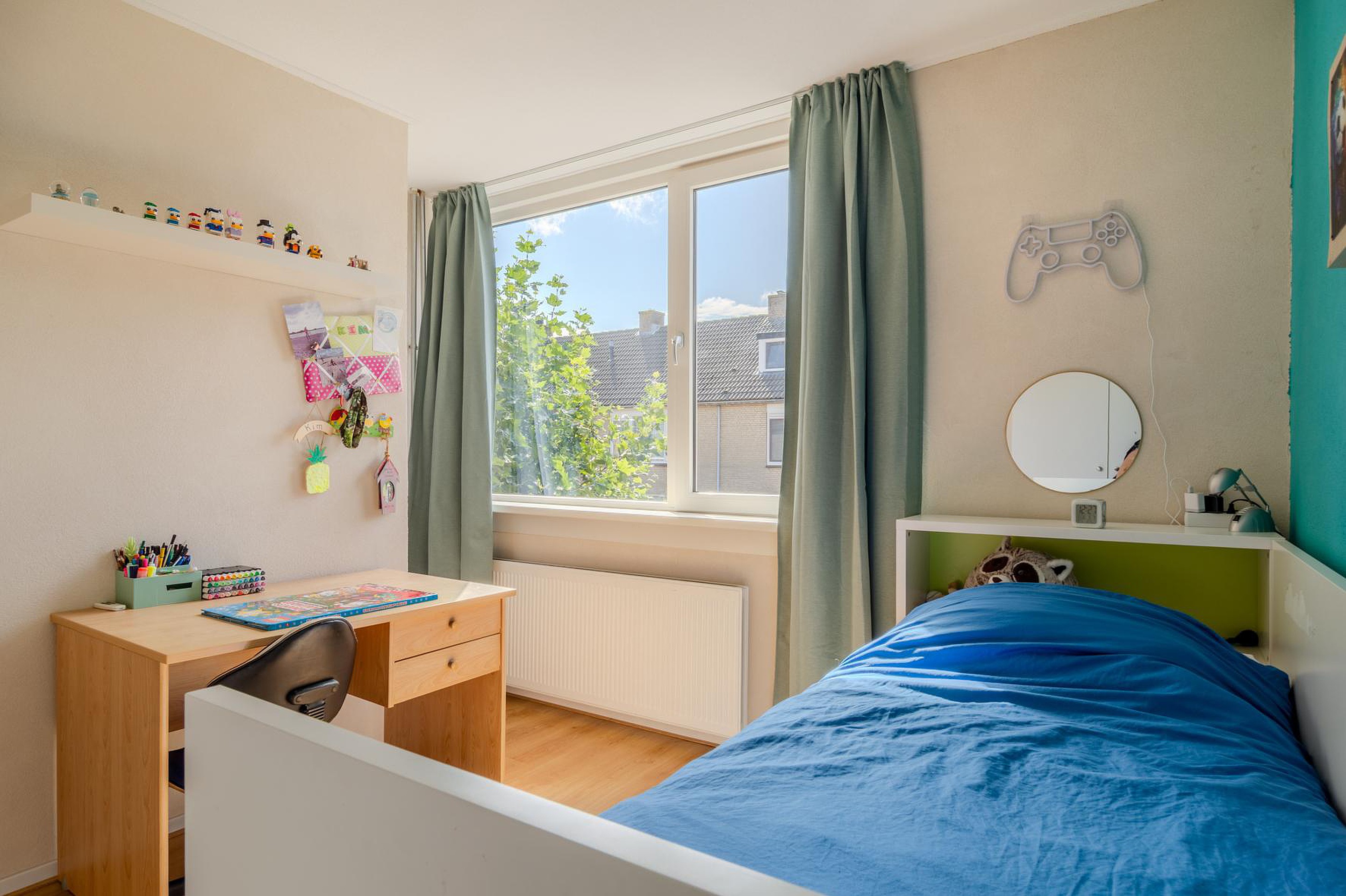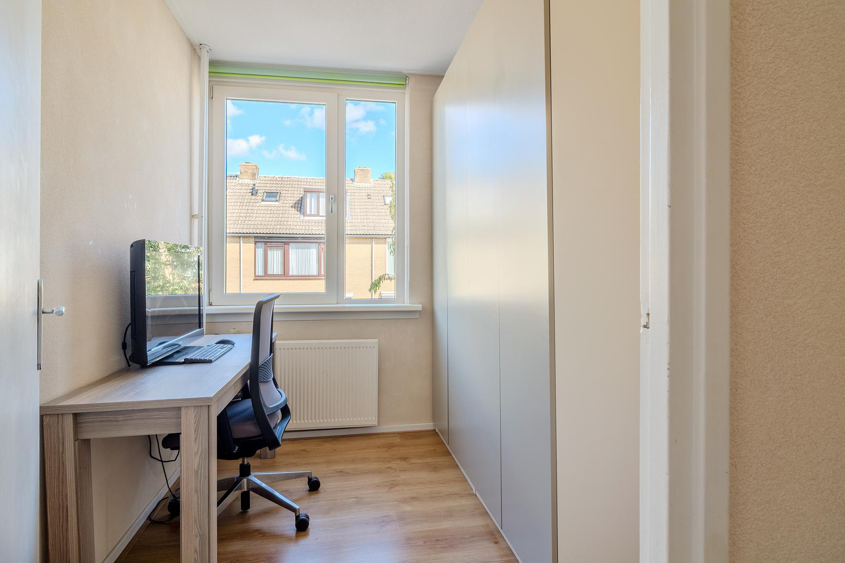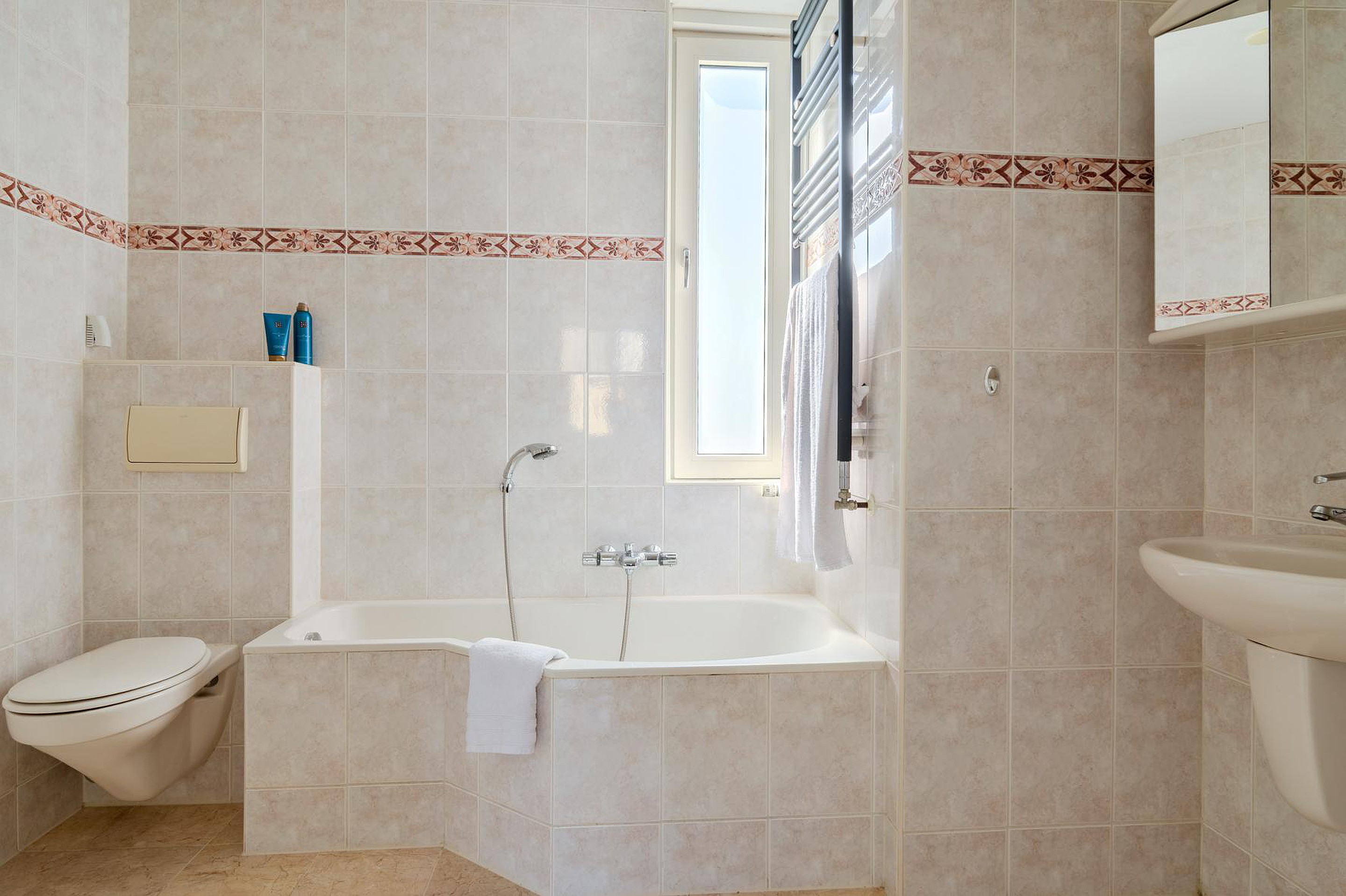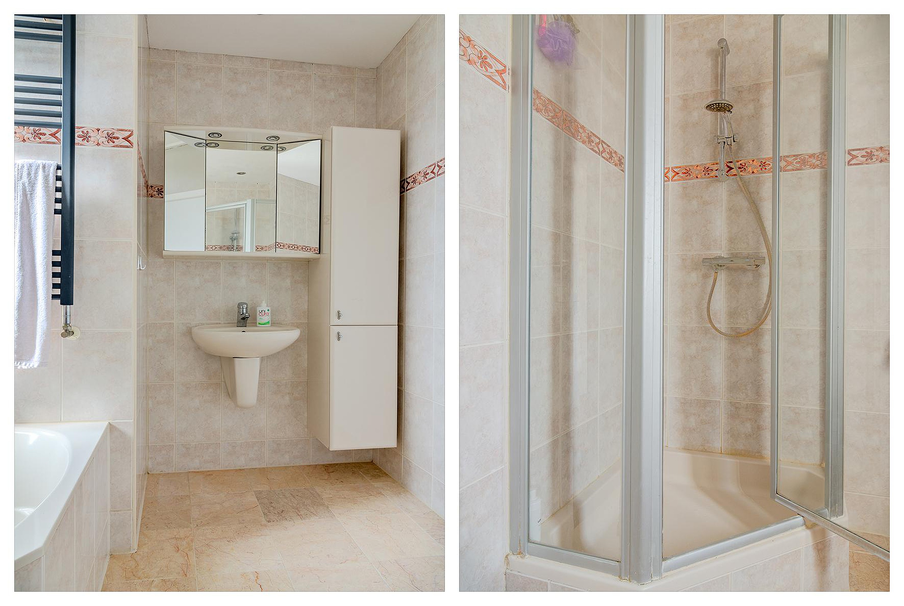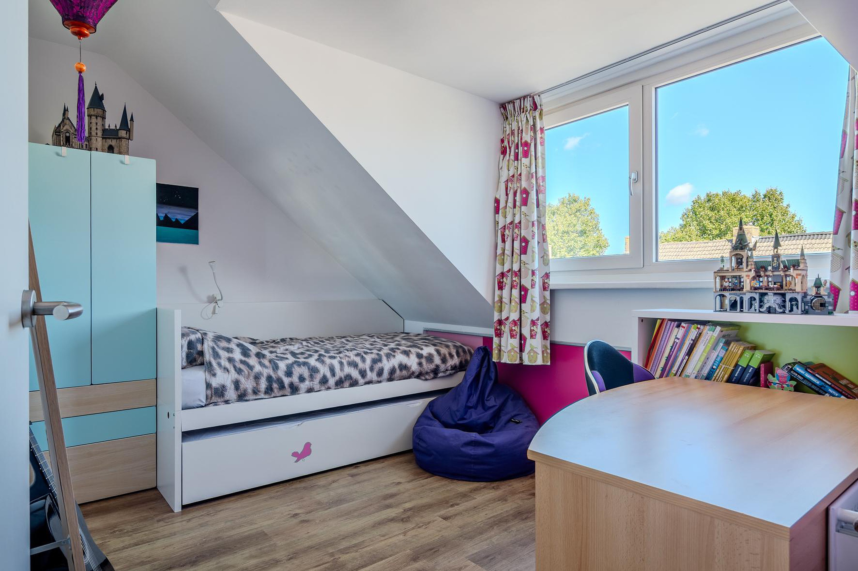 Vanaf de overloop op de eerste verdieping heb je toegang tot de drie slaapkamers, badkamer en trapopgang naar de tweede verdieping. Aan de achterzijde de grootste kamer (3.96 x 3.62) met inbouwkasten. Naast gelegen kleinere tweede slaapkamer (2.19 x 2.89) en aan de voorzijde de derde slaapkamer (2.93 x 3.52). De badkamer (2.11 x 2.90) is volledig betegeld en is voorzien van een ligbad, douche, tweede toilet en wastafel.