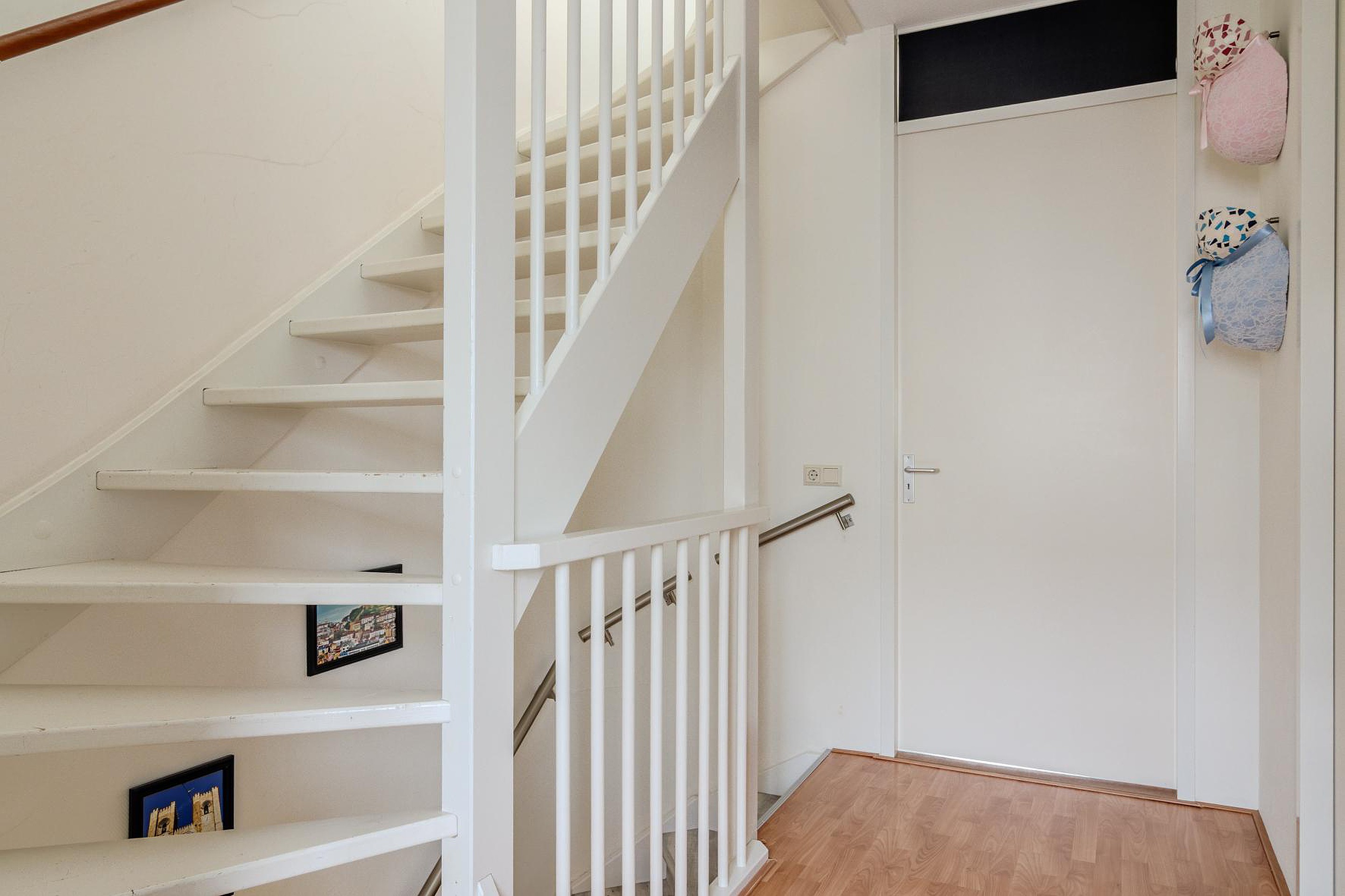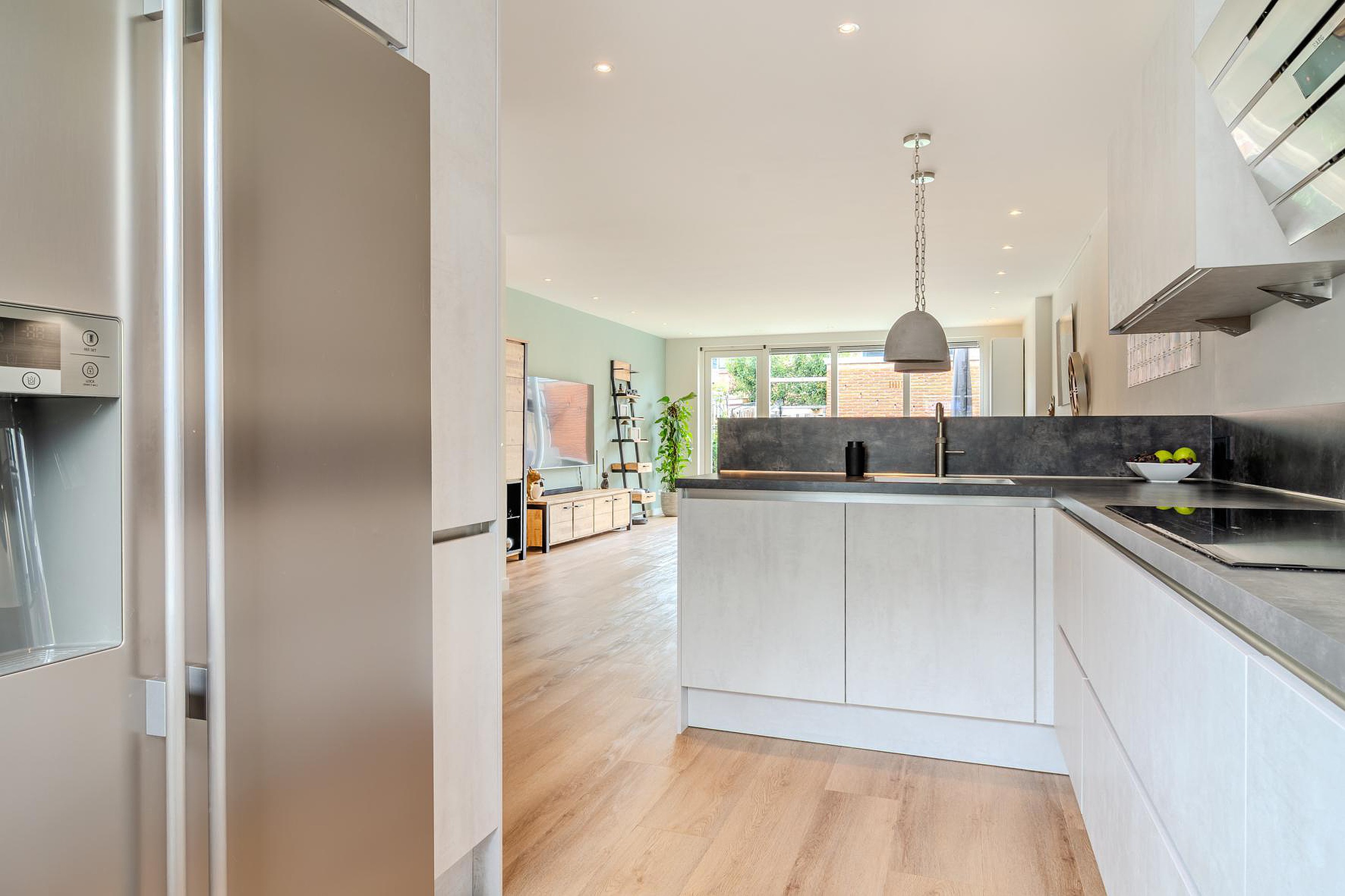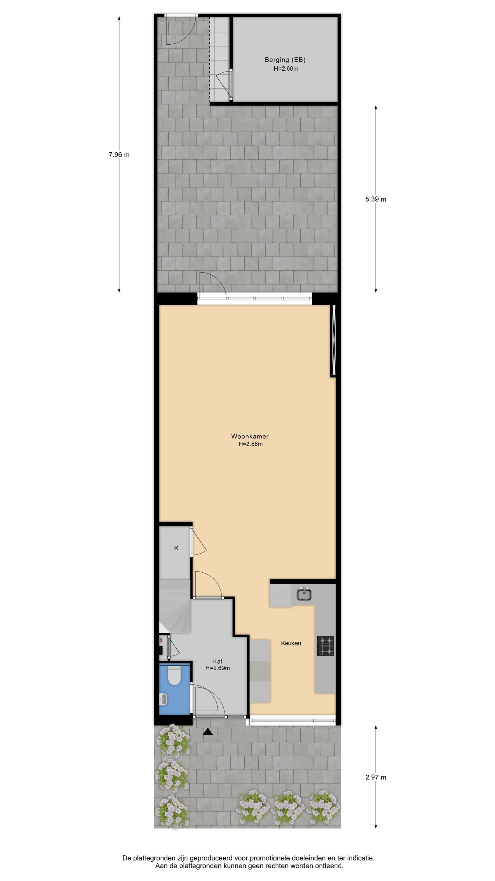 Via de voortuin kom je bij de entree van de woning waar je de hal met meterkast in stapt. De hal geeft toegang tot het toilet, de trapopgang naar de 1e verdieping en de woonkamer. Het toilet is deels betegeld en voorzien van een wandcloset en fonteintje. De lichte woonkamer (5.10 x 7.91) grenst aan de achtertuin. De open keuken (2.49 x 3.78) is gelegen aan de voorzijde en vernieuwd in 2017. De keuken is voorzien van diverse inbouwapparatuur zoals een inductiekookplaat, afzuigkap, combi-oven, Quooker en vaatwasser. De Amerikaanse koel-vriescombinatie is ter overname beschikbaar. De gehele begane grond is voorzien van een nette pvc-afwerkvloer met vloerverwarming. Via de achterdeur kom je in de achtertuin (7.96 x 5.20) op het noordoosten. Deze heeft een stenen berging (3.02 x 2.45) en achterom.